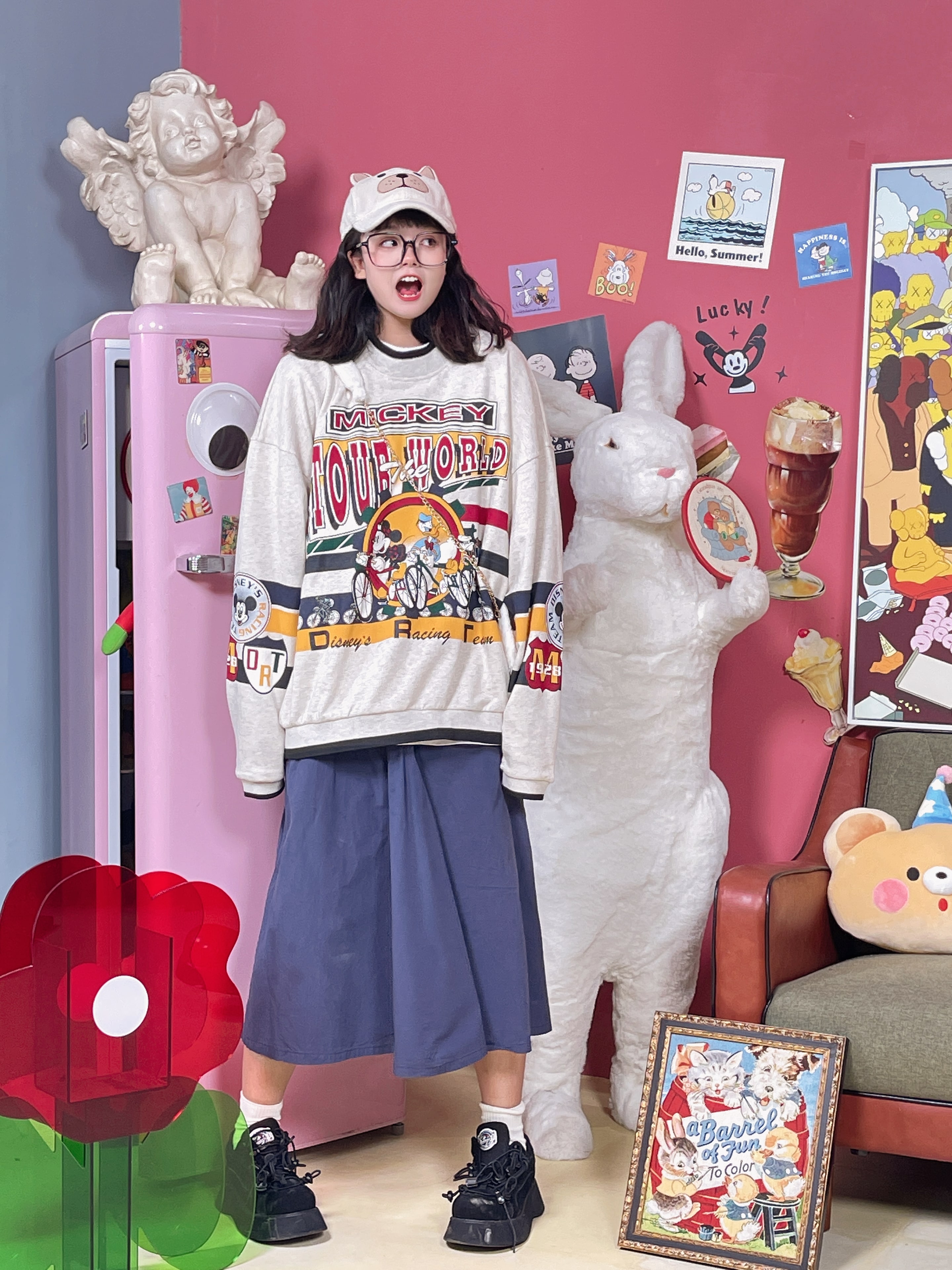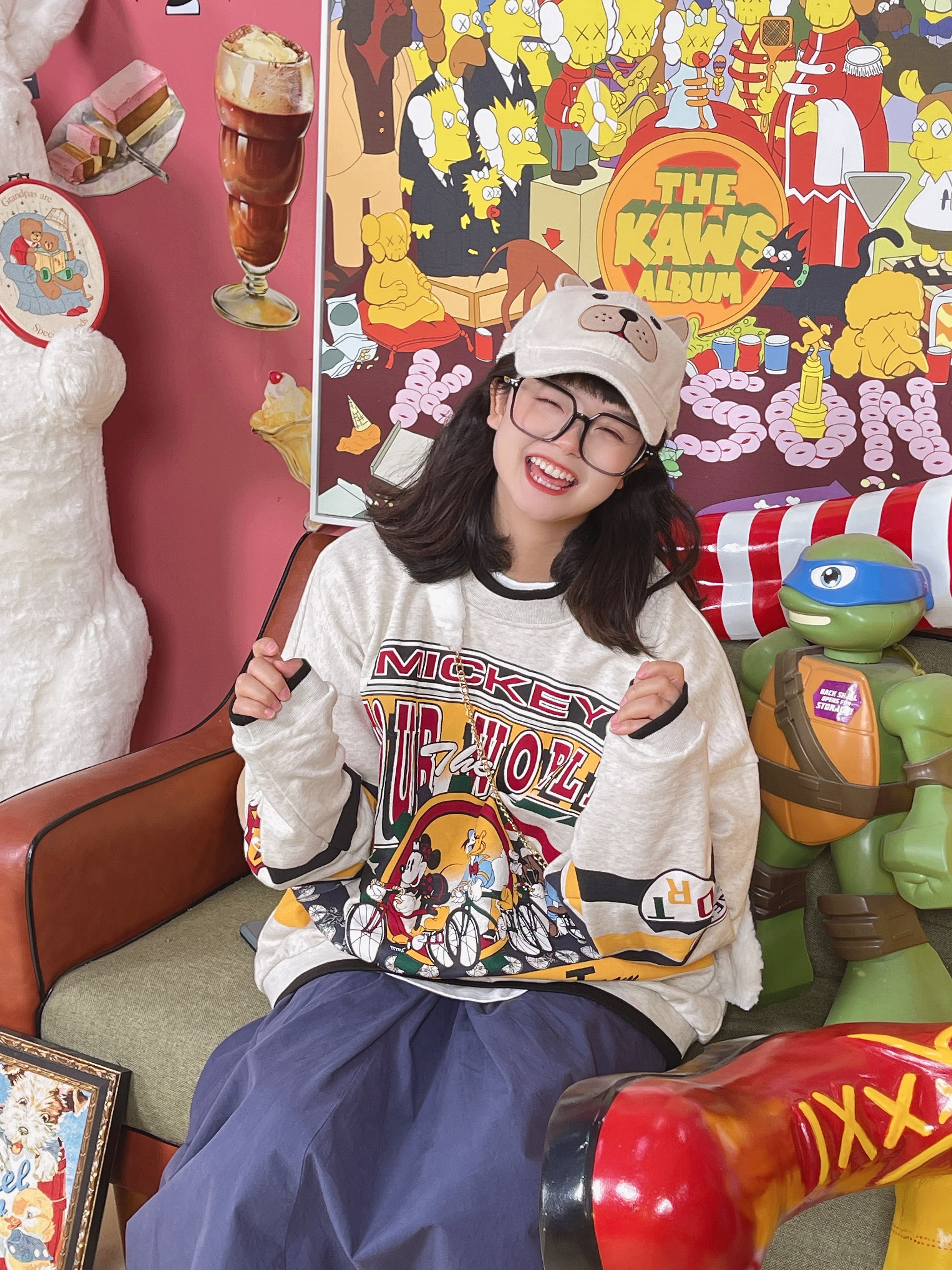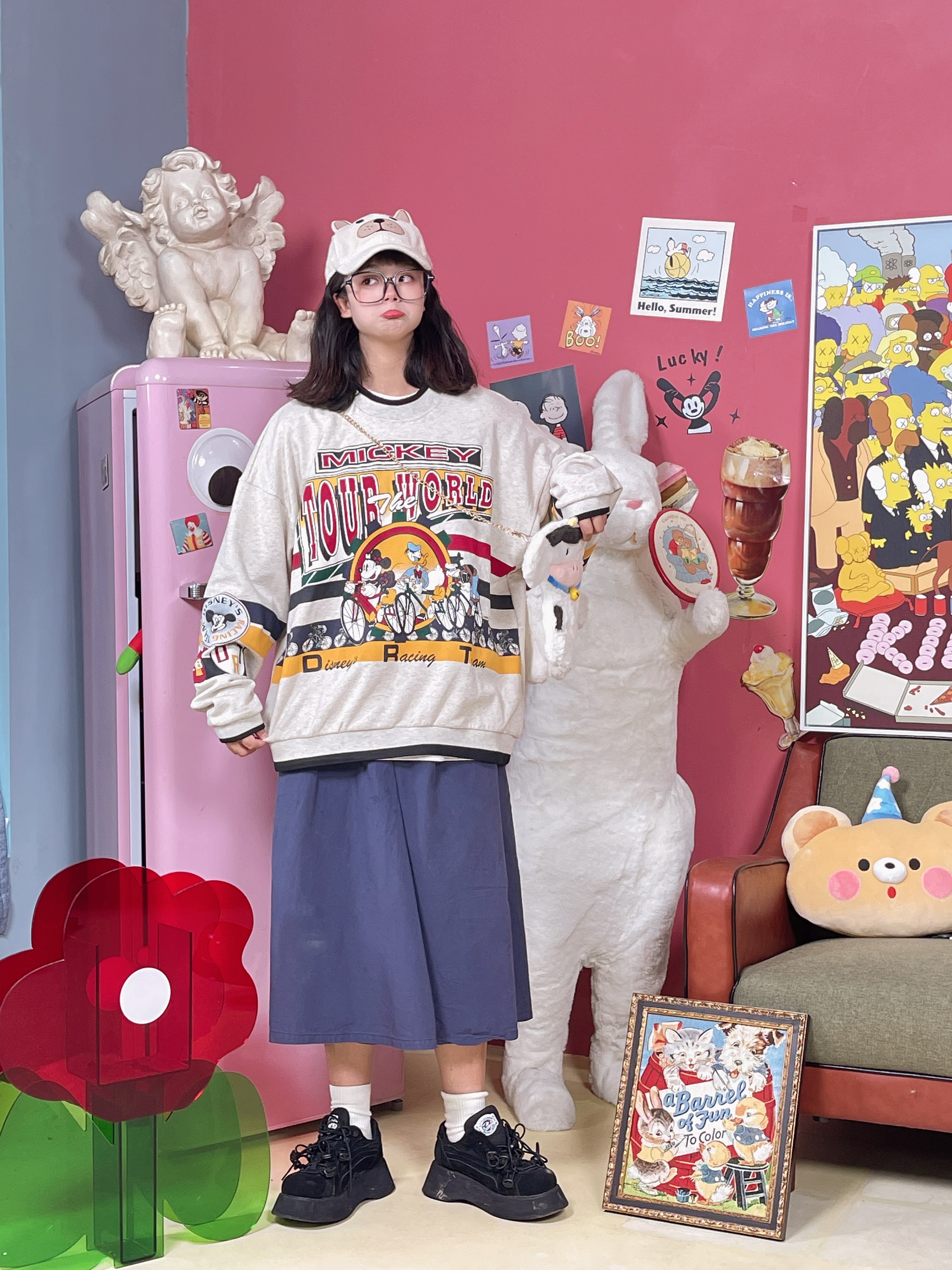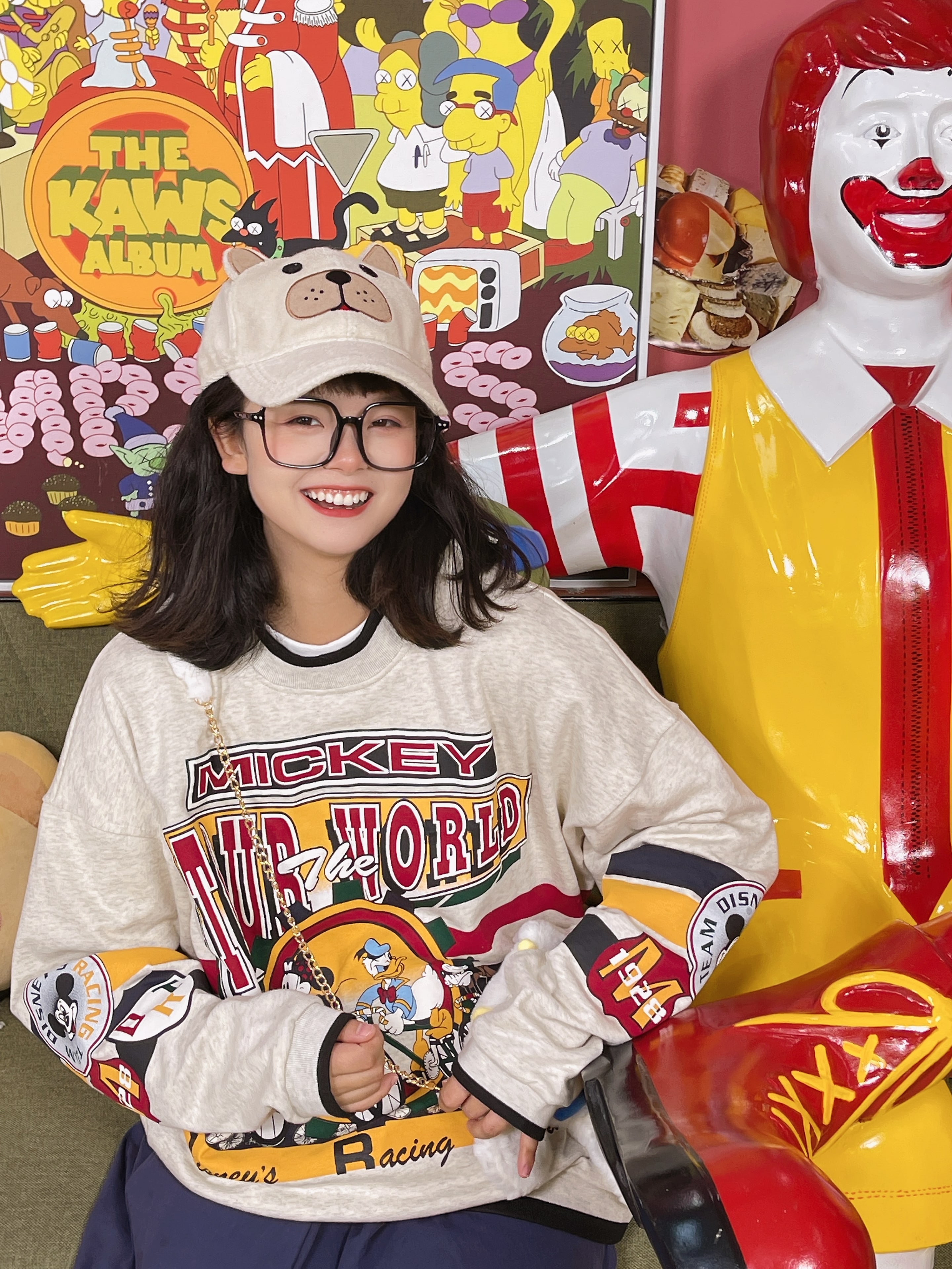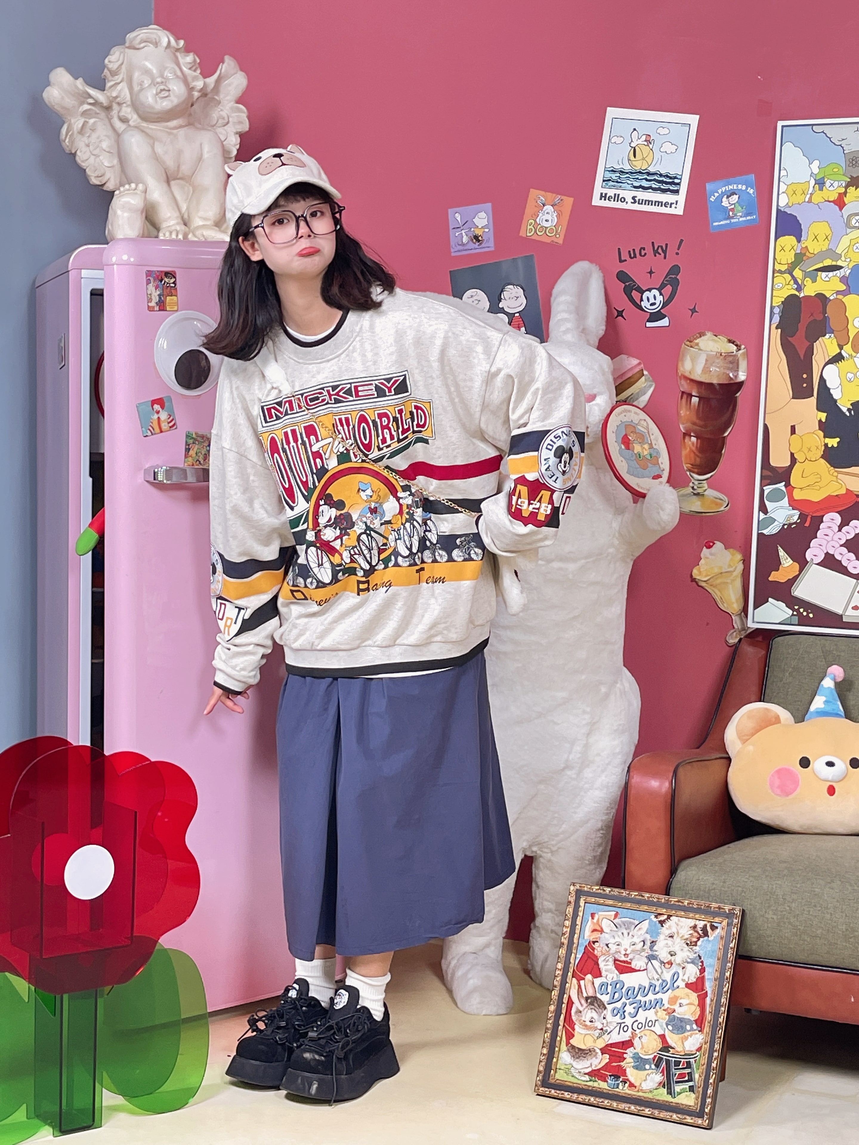 童趣古著日系復古純棉圓領厚棉T2023年春季寬鬆減齡卡通可愛情侶
