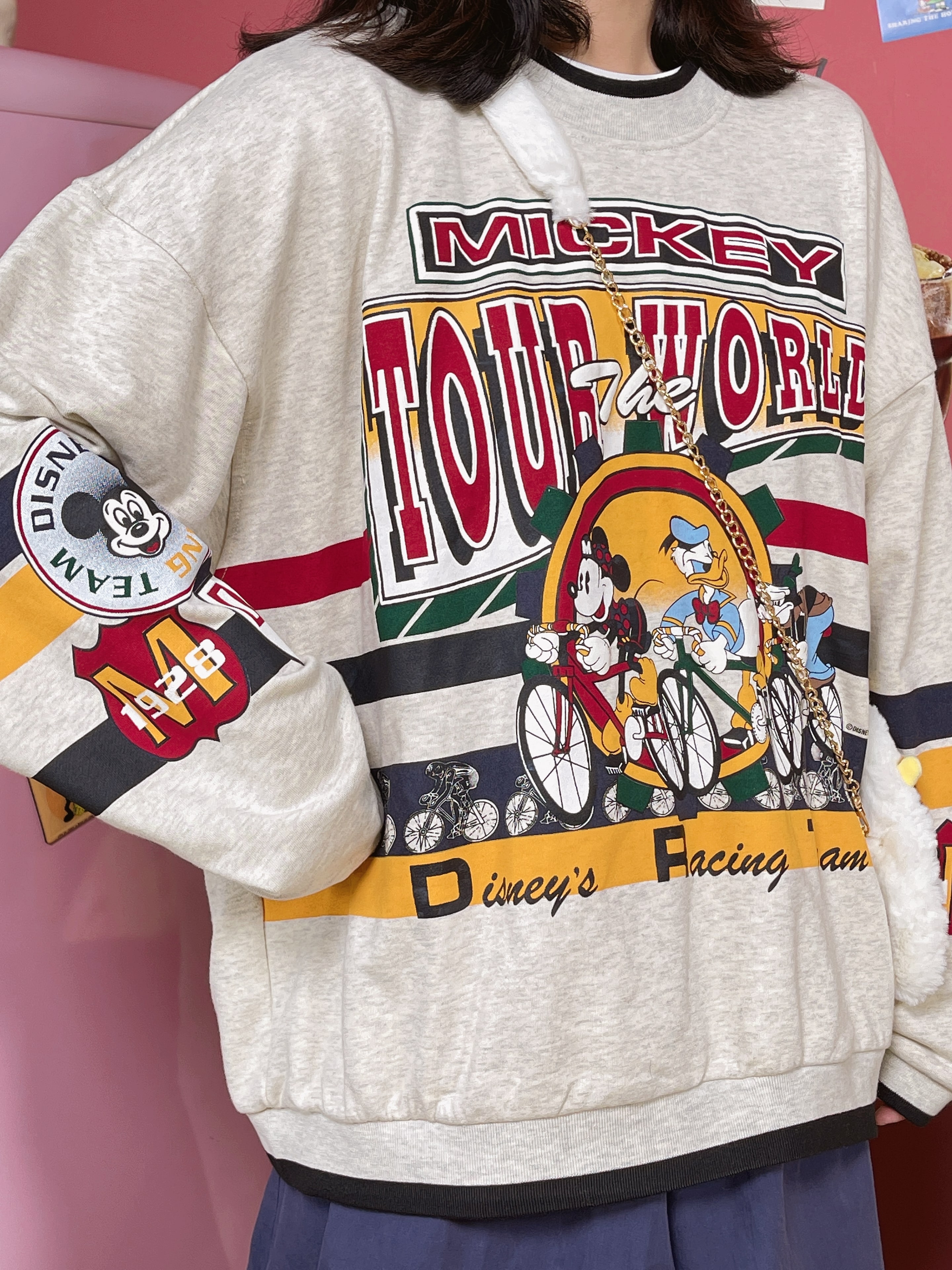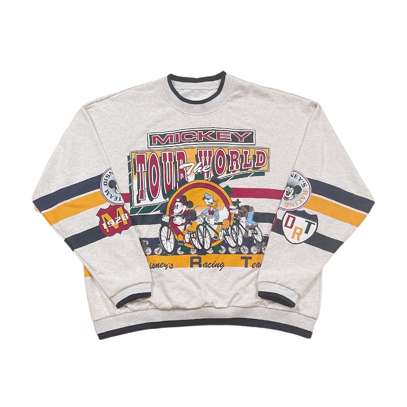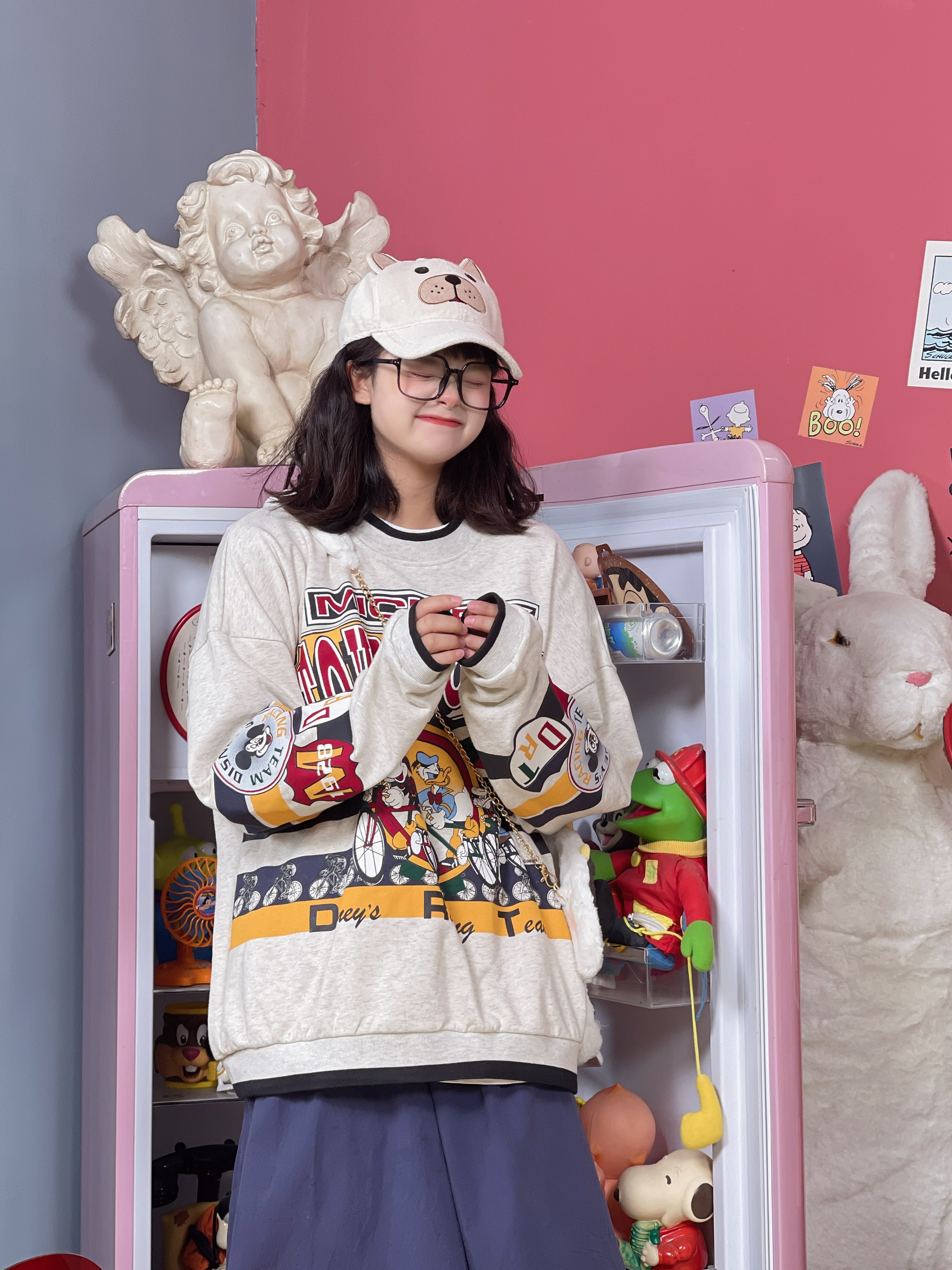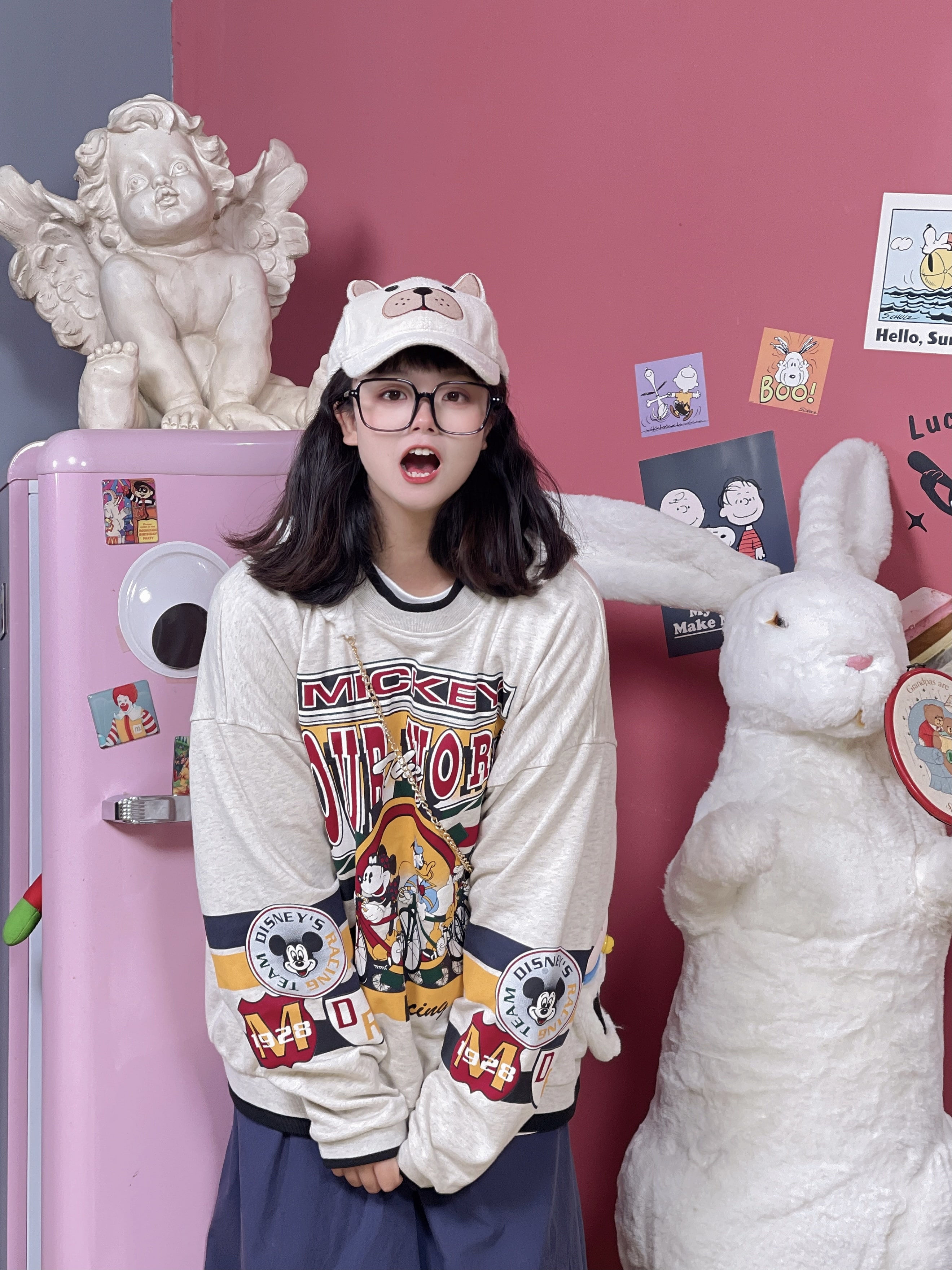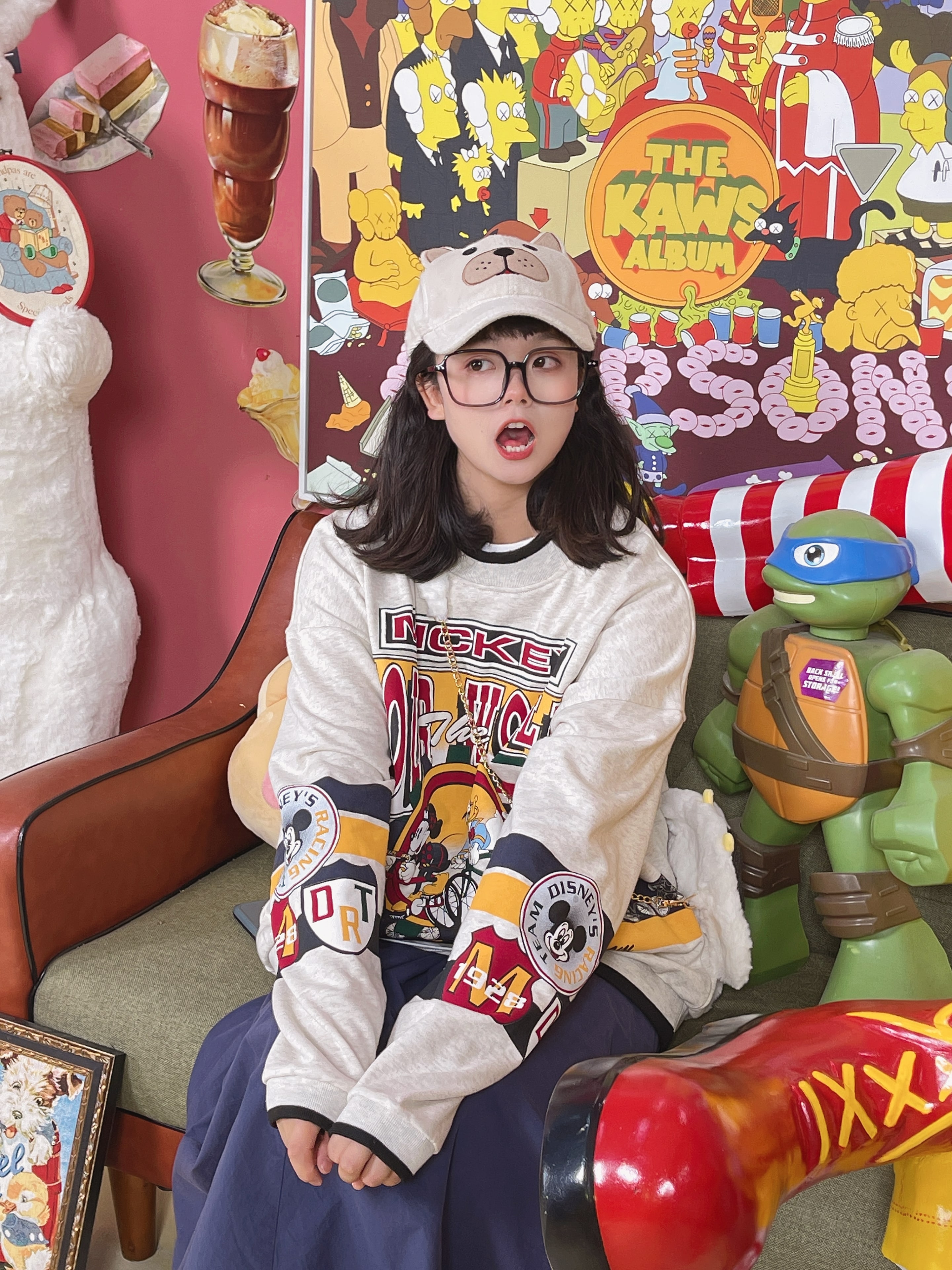 童趣古著日系復古純棉圓領厚棉T2023年春季寬鬆減齡卡通可愛情侶