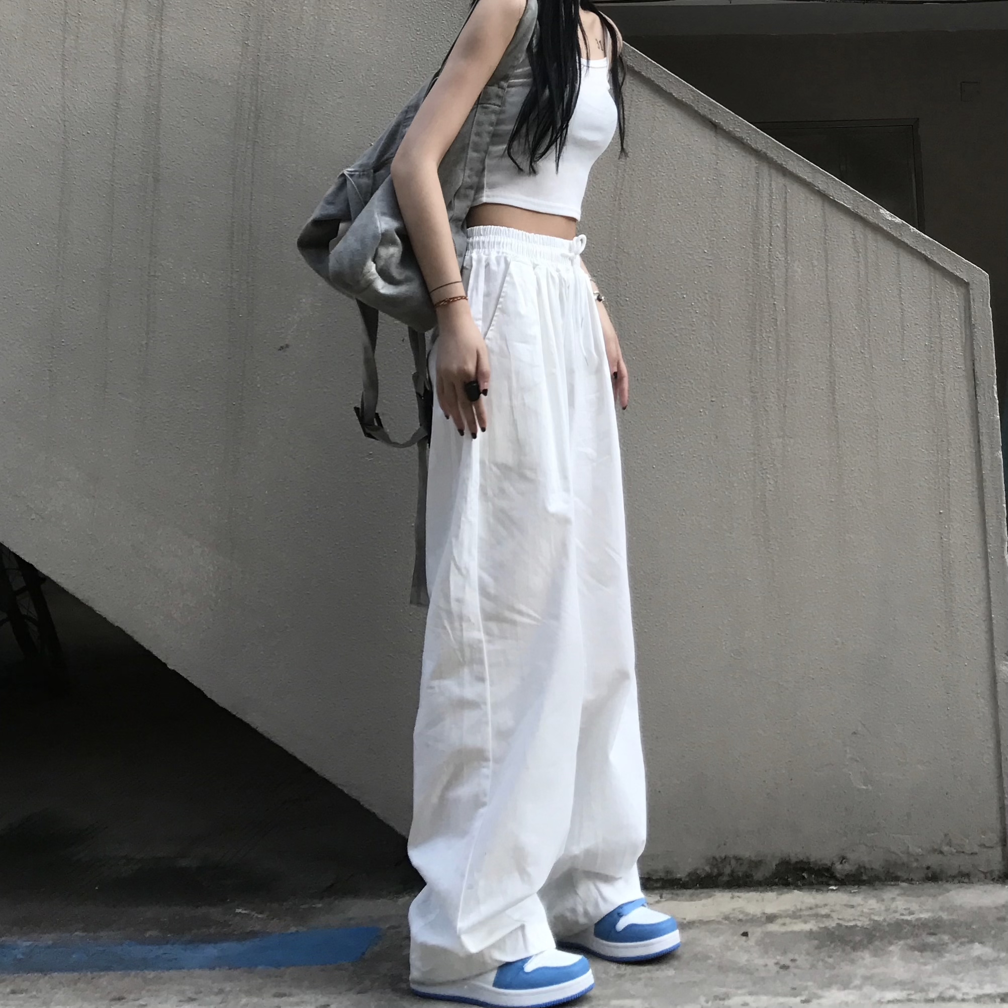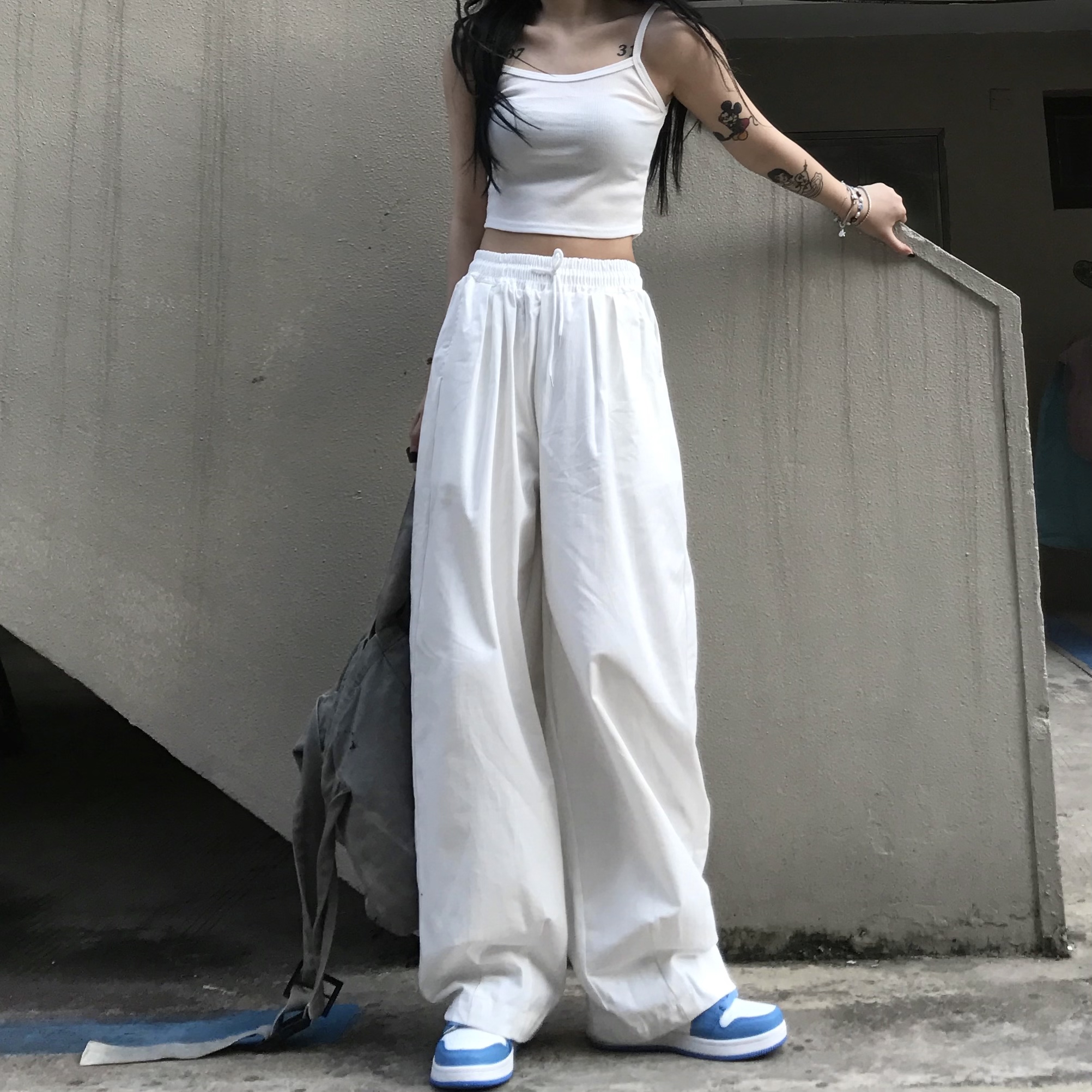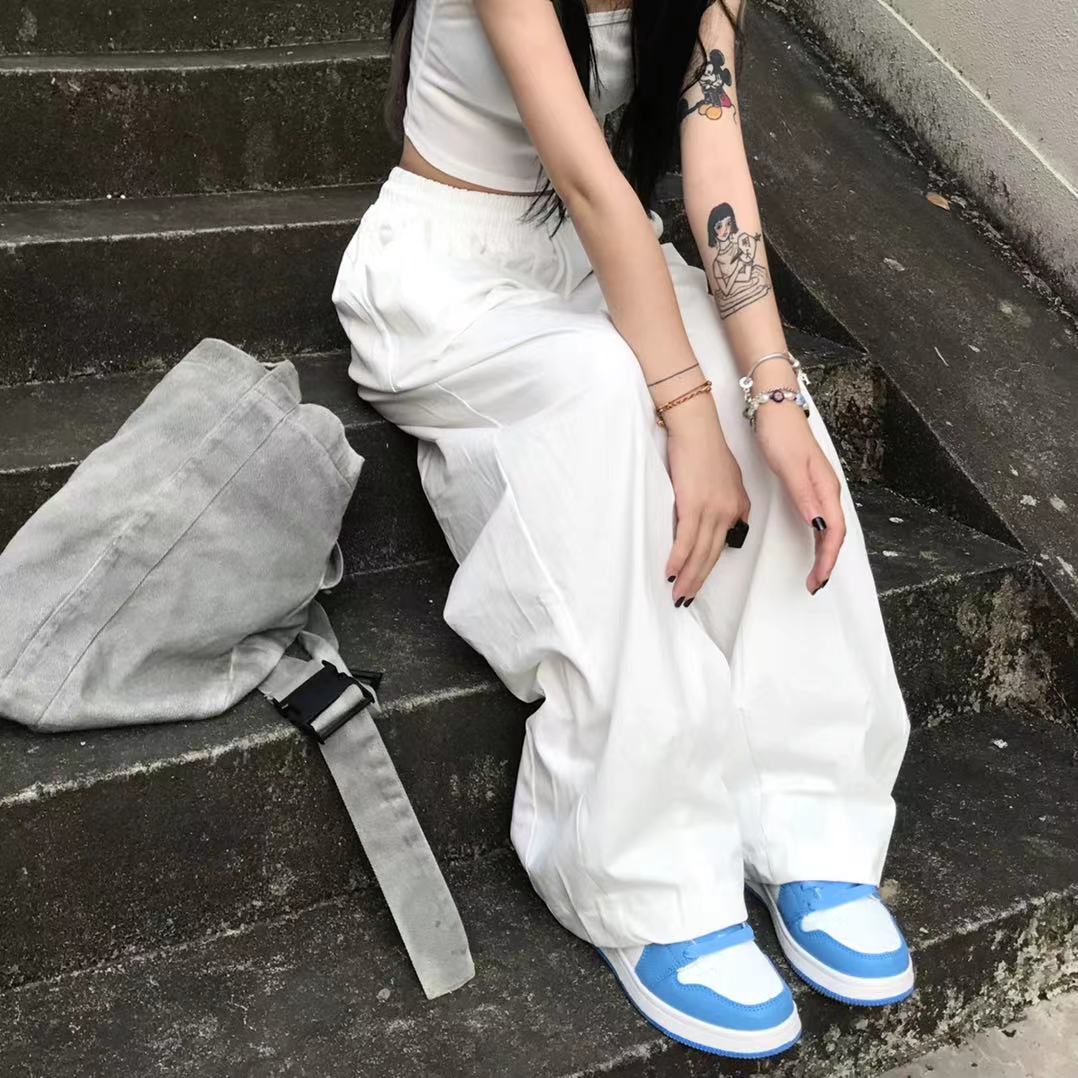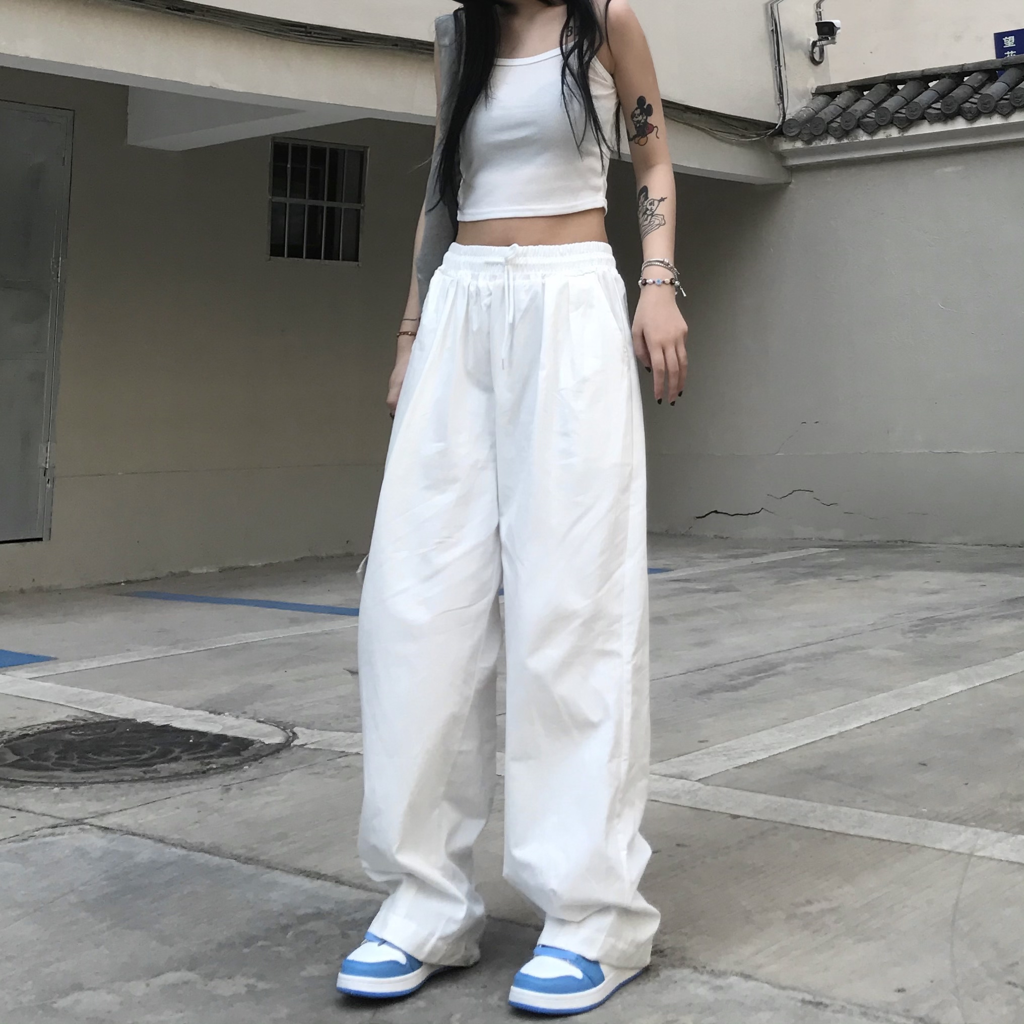 白色hiphop褲子女秋季寬鬆嘻哈街頭闊腿褲直筒拖地純棉休閒jazz褲