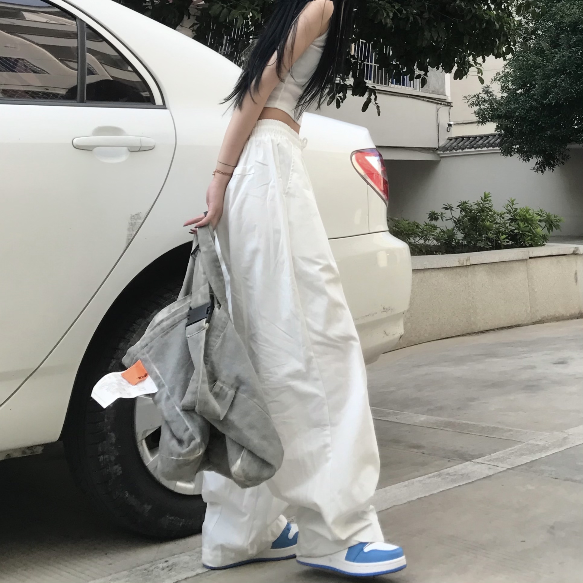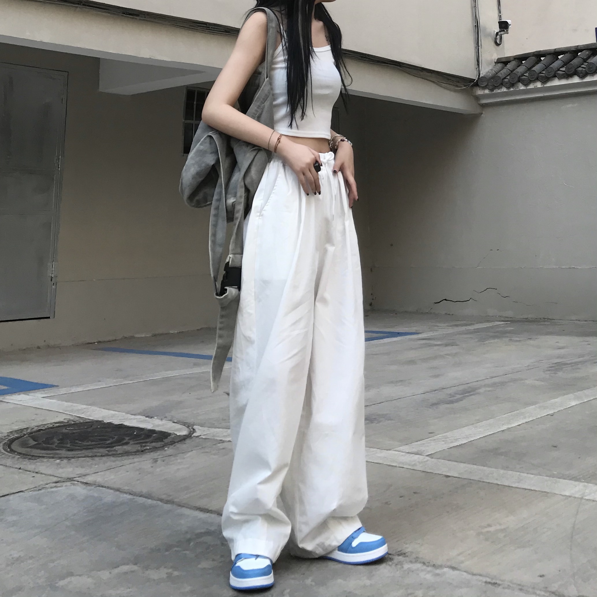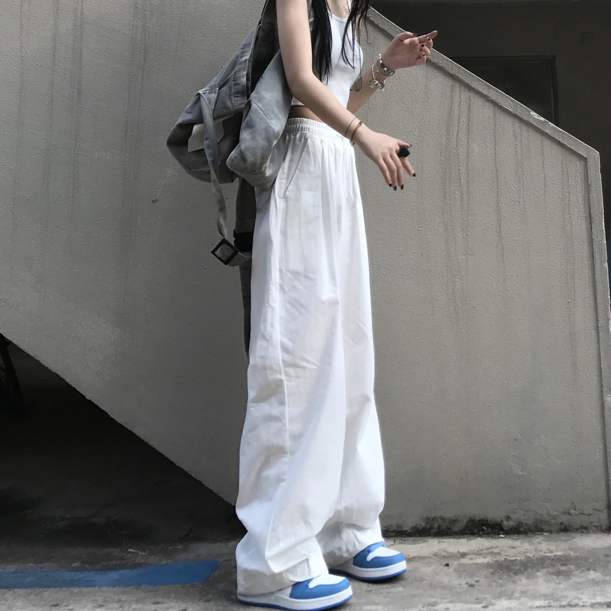 白色hiphop褲子女秋季寬鬆嘻哈街頭闊腿褲直筒拖地純棉休閒jazz褲