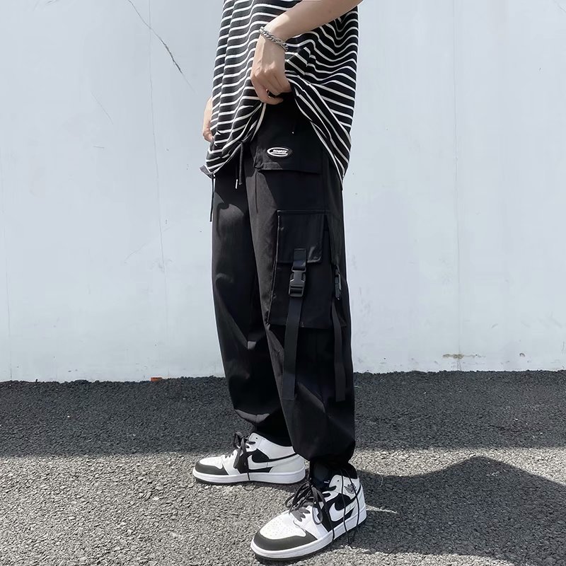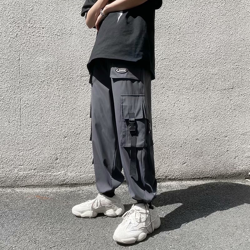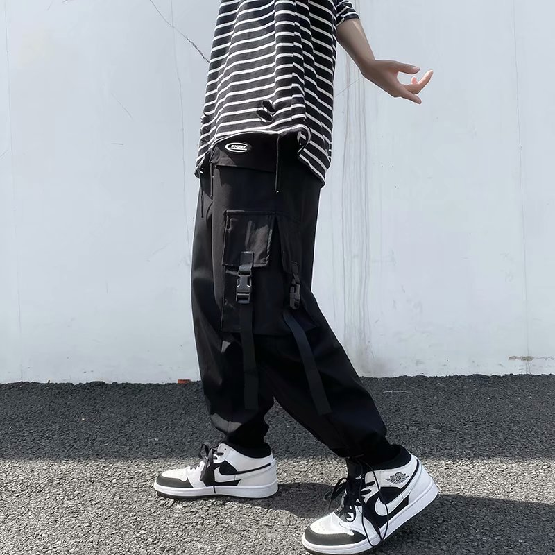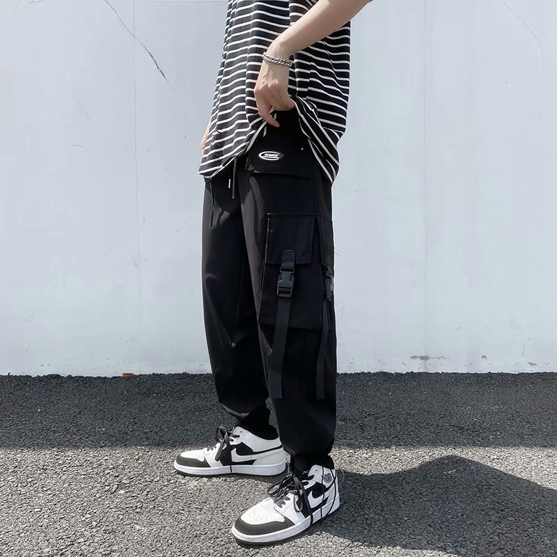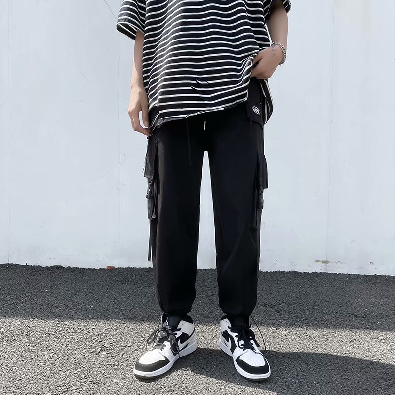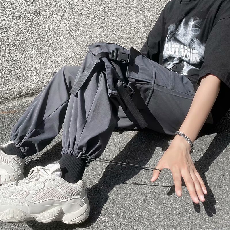 多口袋工裝休閒褲男褲2021年新款潮流寬鬆束口褲運動機能風傘兵褲