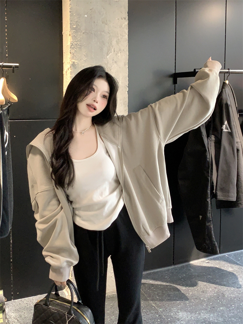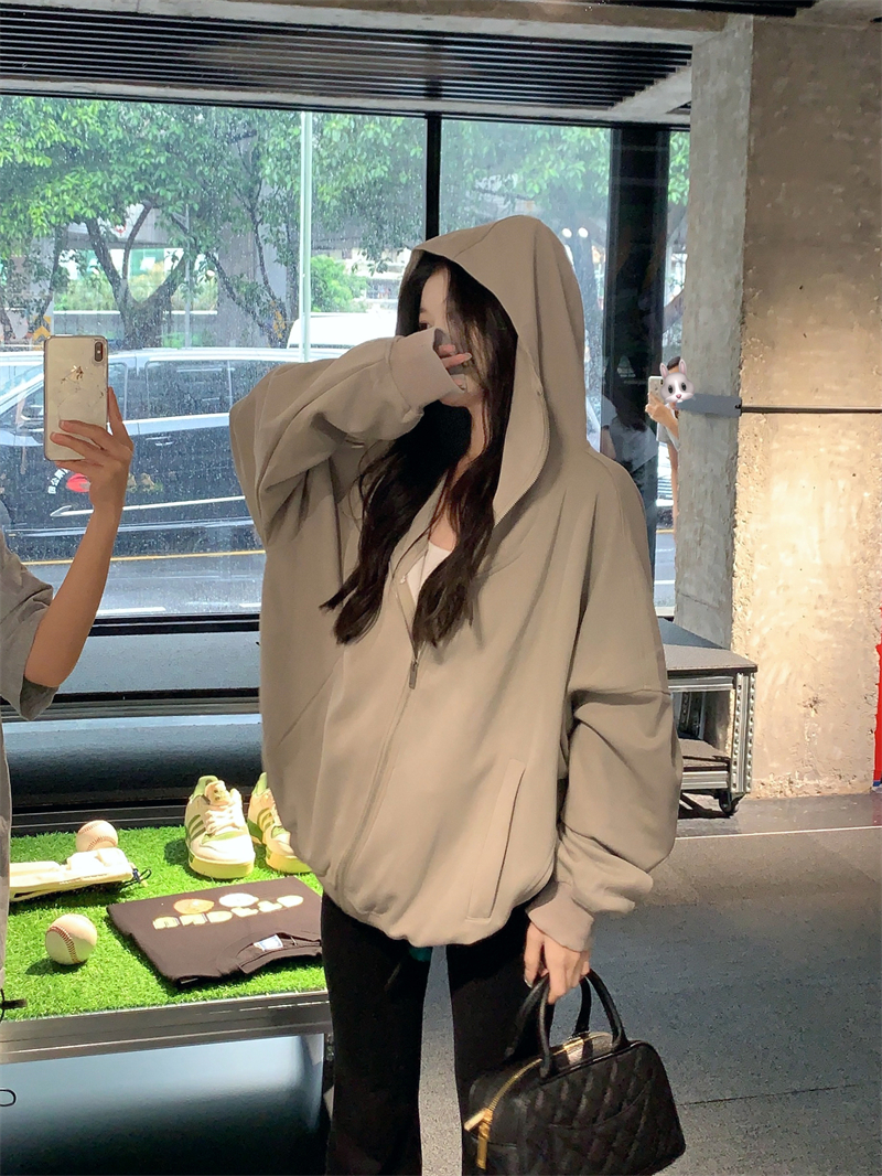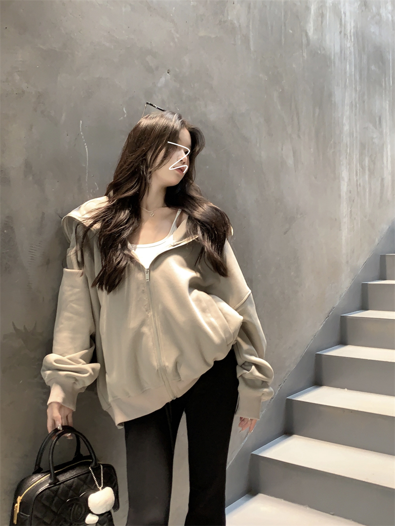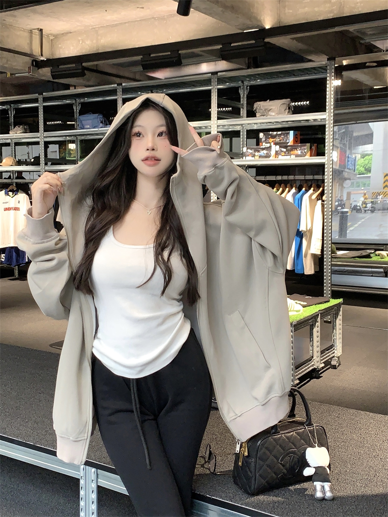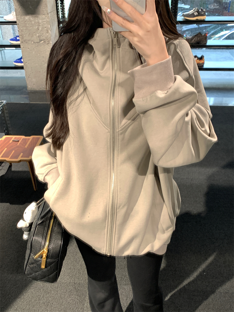 小個子灰色長袖連帽運動衫女裝外套秋季寬鬆慵懶風休閒開衫拉鍊上衣
