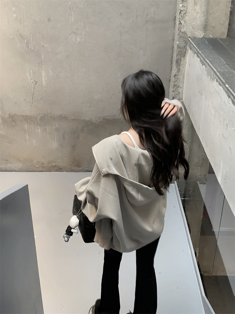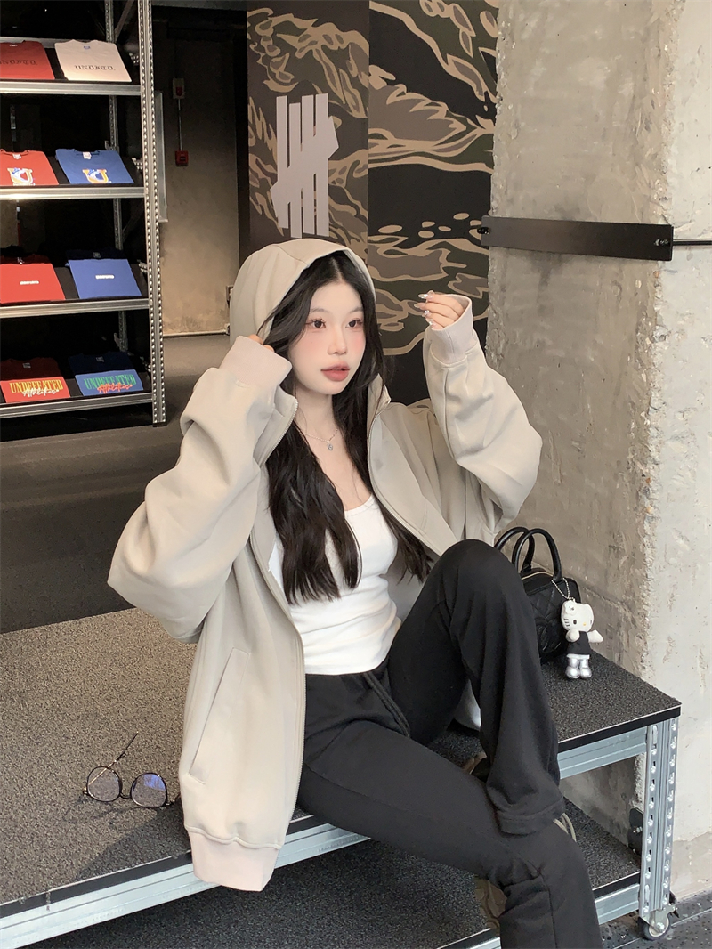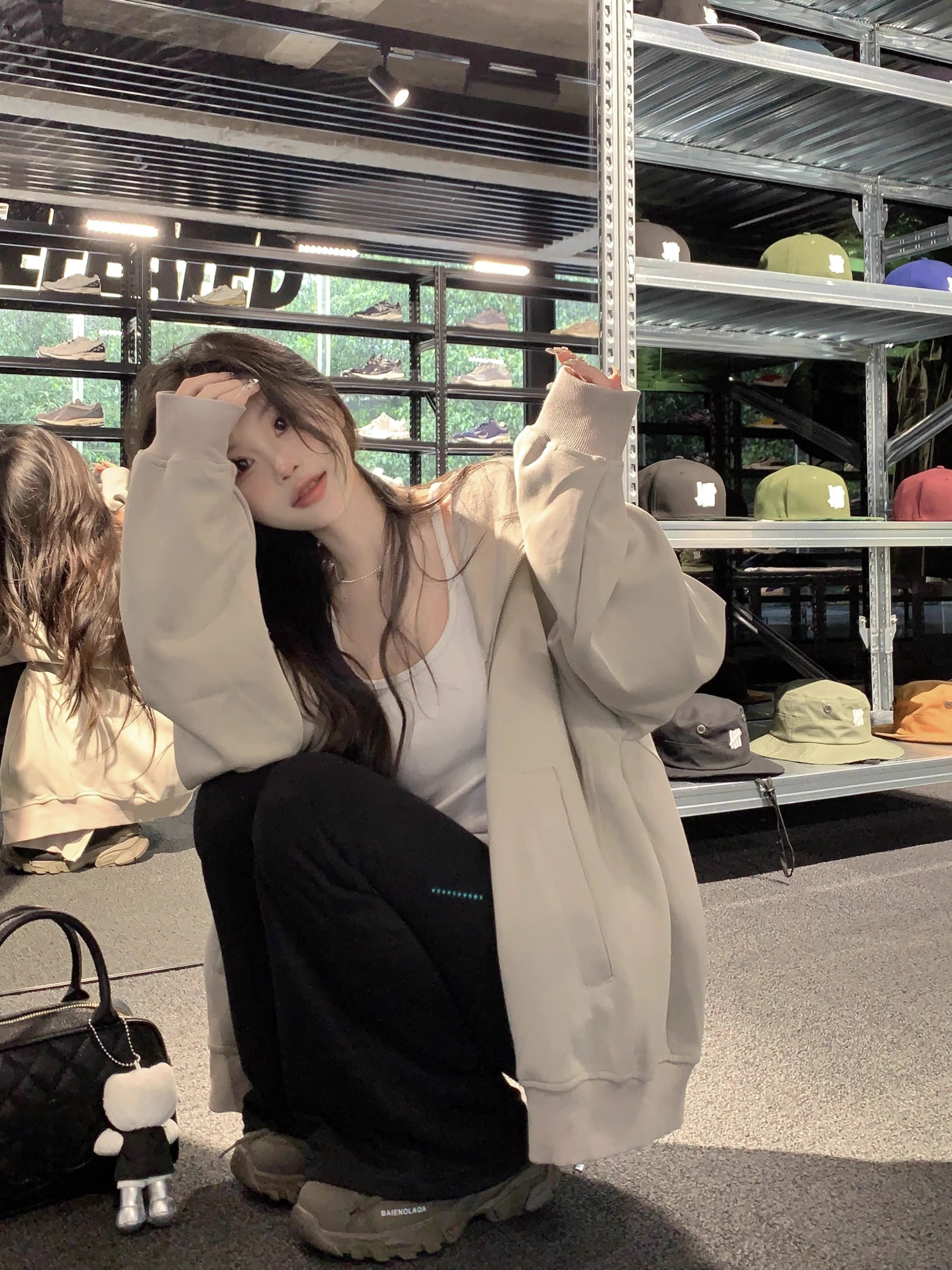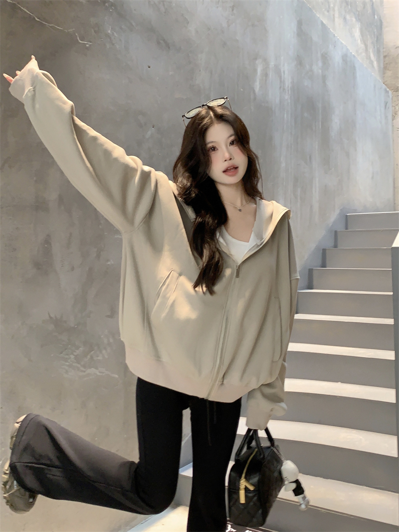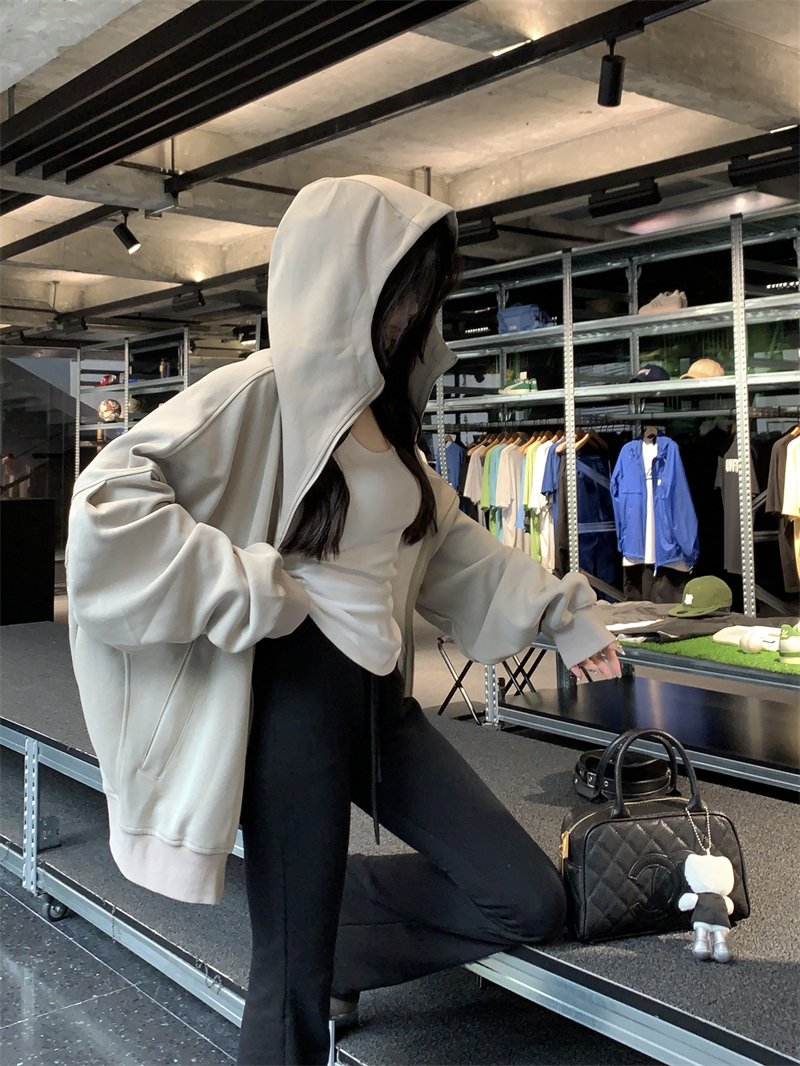 小個子灰色長袖連帽運動衫女裝外套秋季寬鬆慵懶風休閒開衫拉鍊上衣
