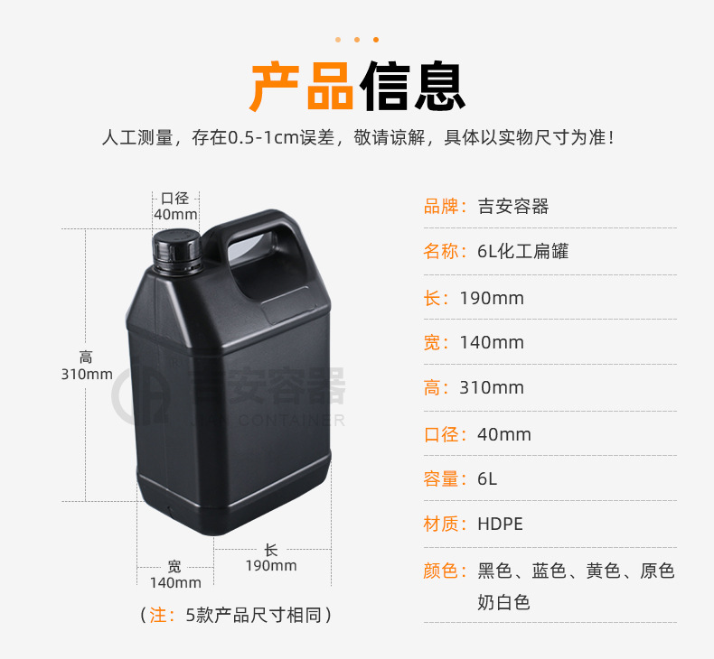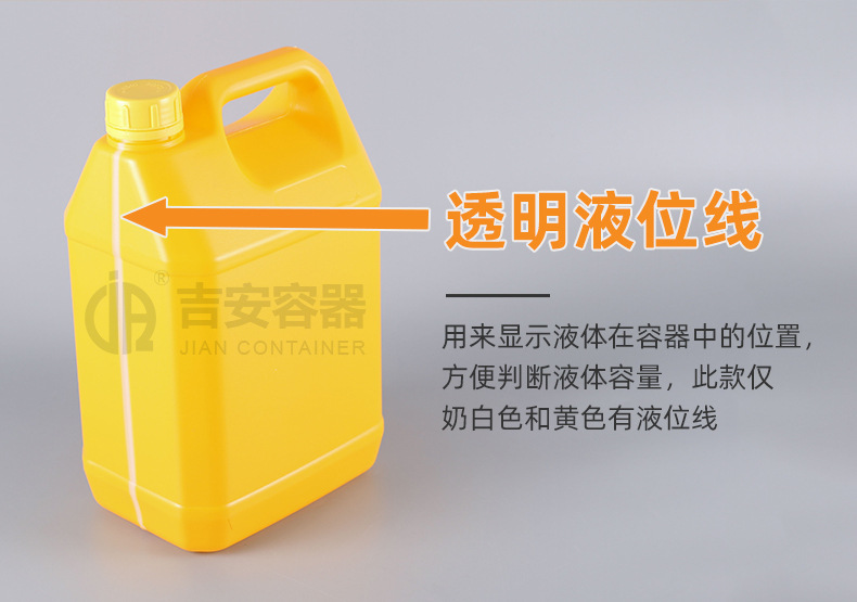 规格 6L化工扁罐蓝色,6L化工扁罐黄色(带液位线),6L化工扁罐原色,6L化工扁罐奶白色(带液位线),6L化工扁罐黑色