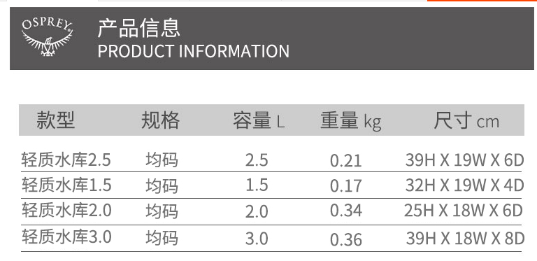 新款osprey小鷹揹包水袋1.5L 2.5L 3L 水袋 買就送防塵套和水袋