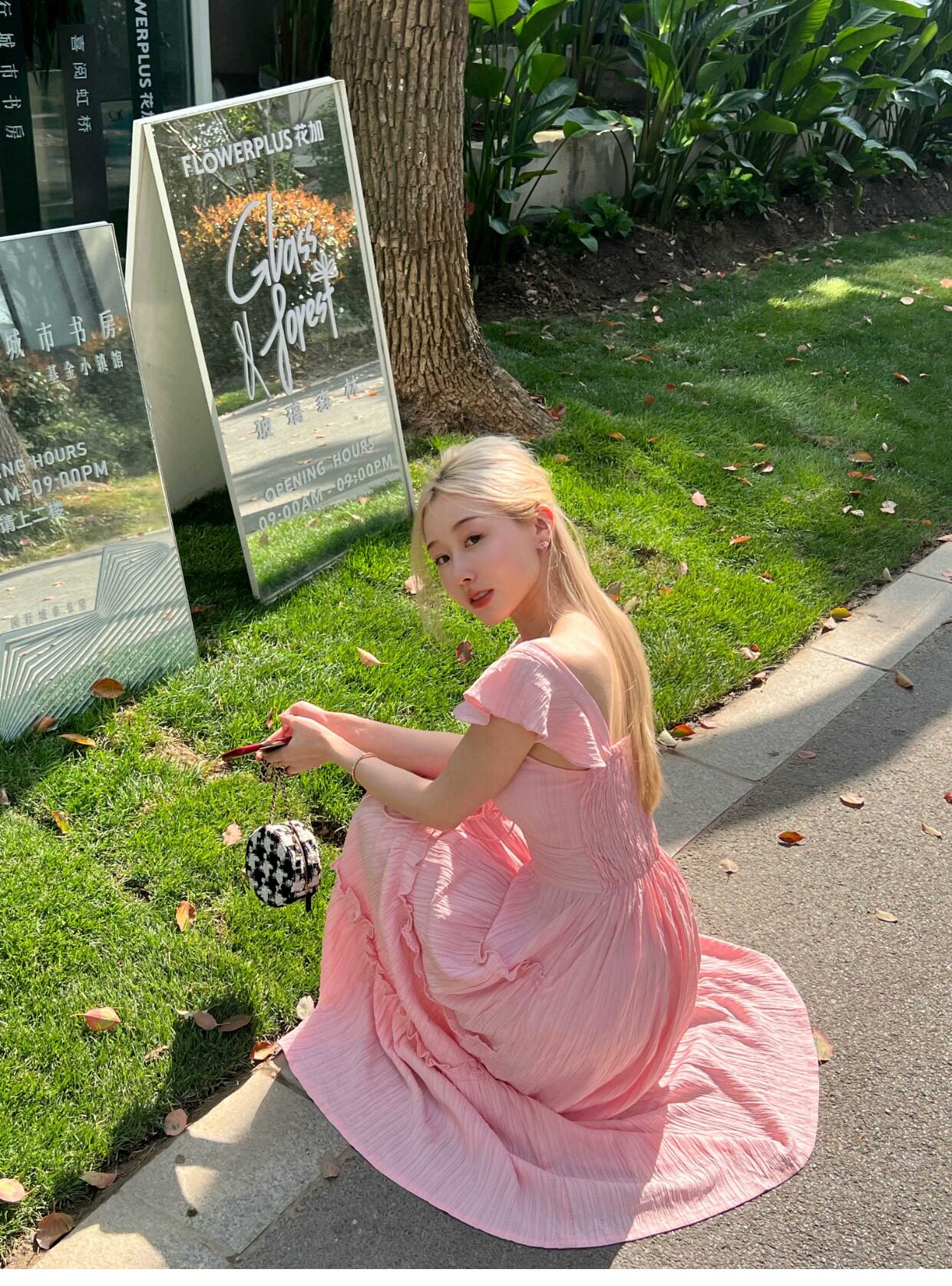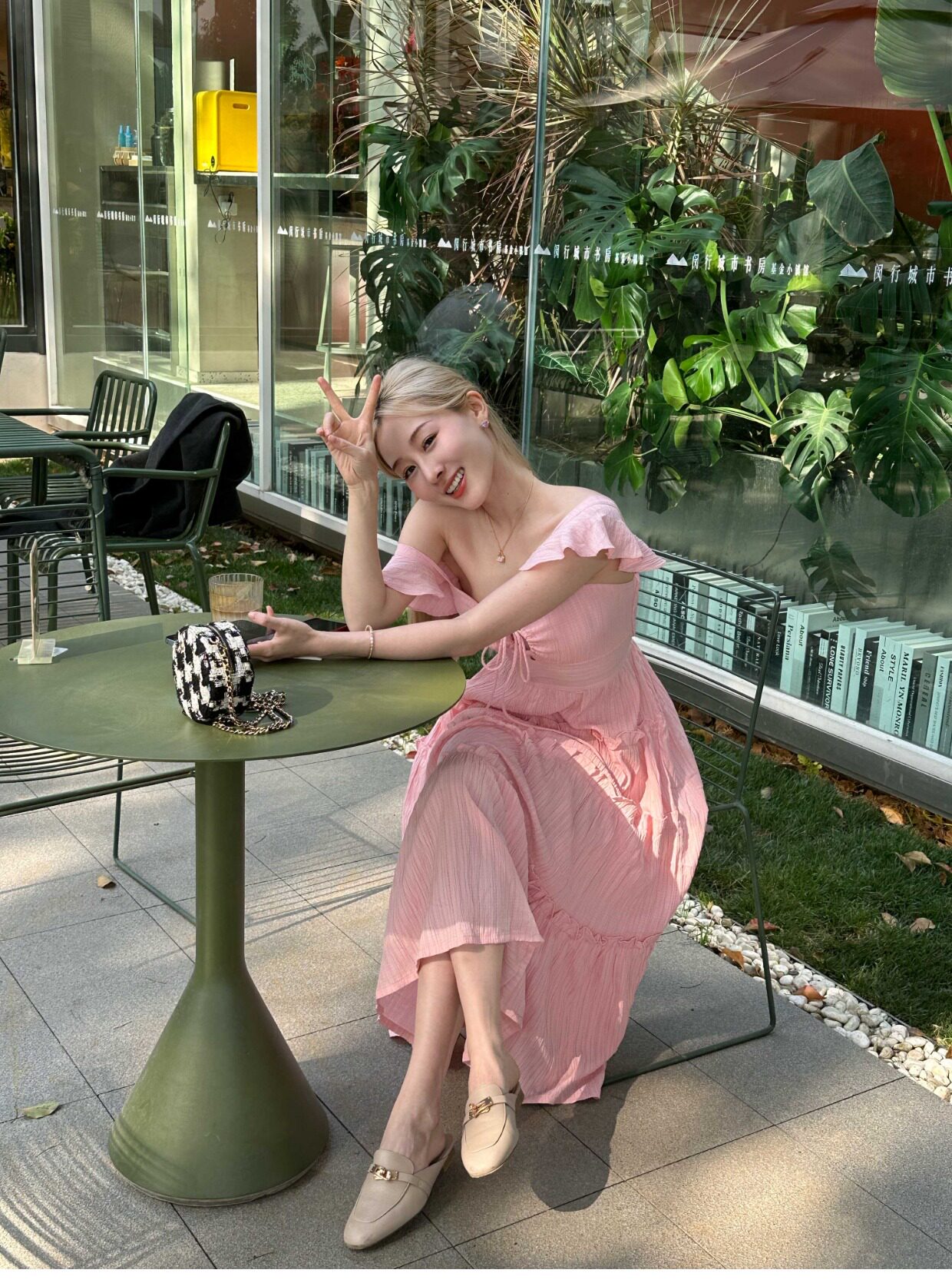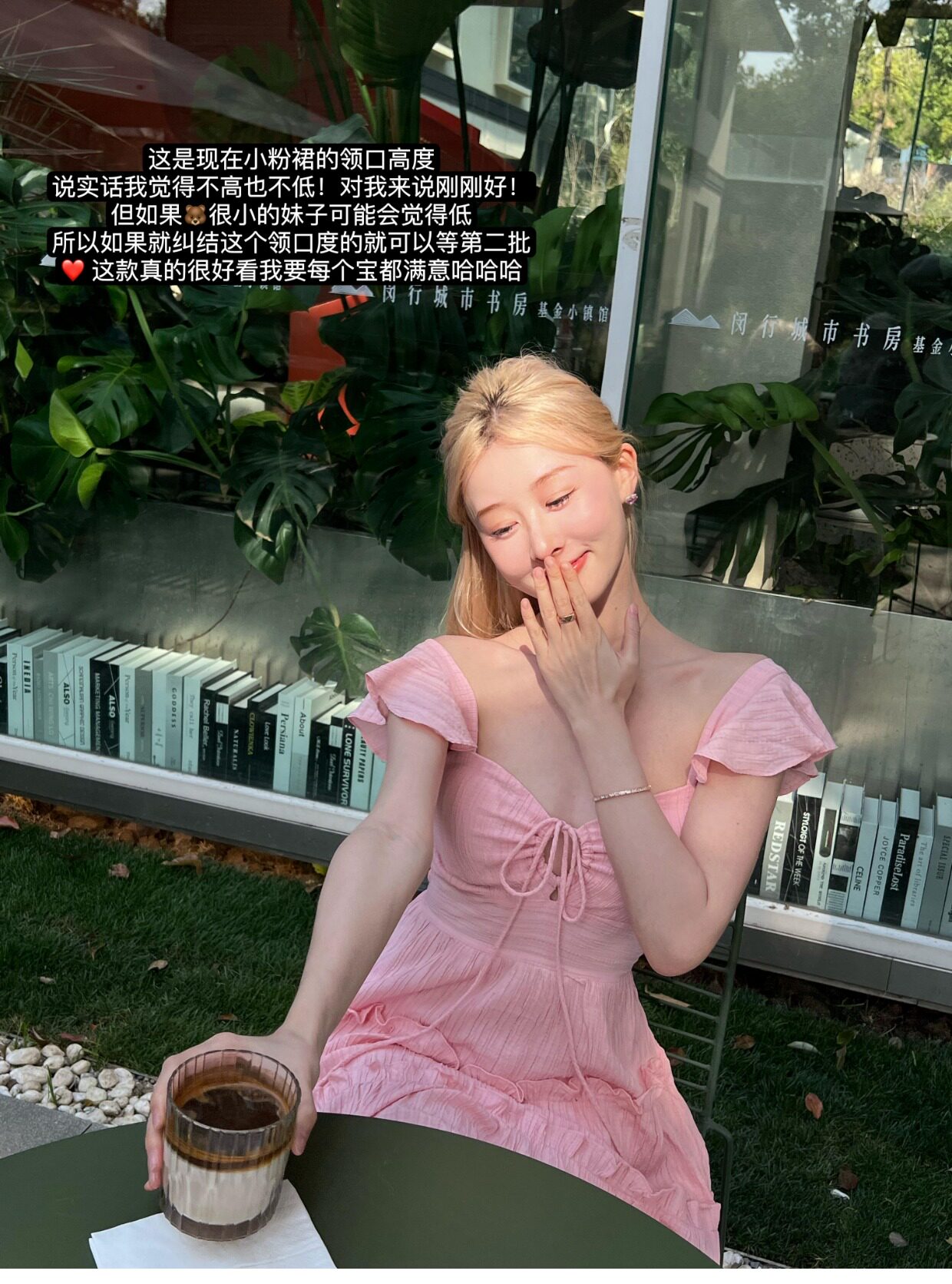 more than dress【愛的1/4吋套筒扳手袖】粉色溫柔收腰抹胸洋裝