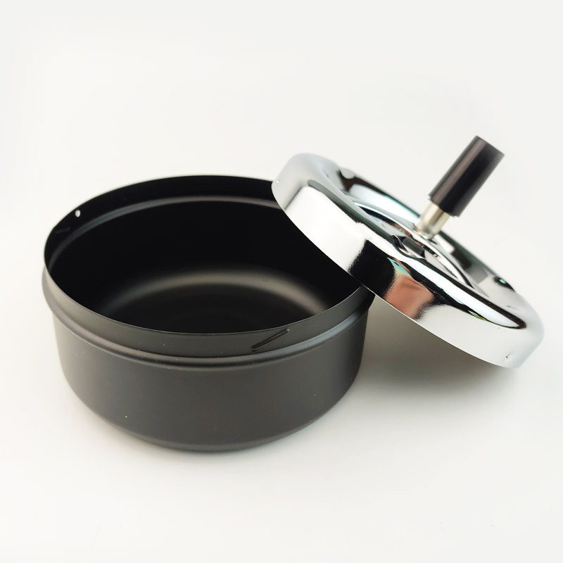 烟缸上盖带有一个塑胶手柄,手指按压内部圆盘就会自动快速旋转!