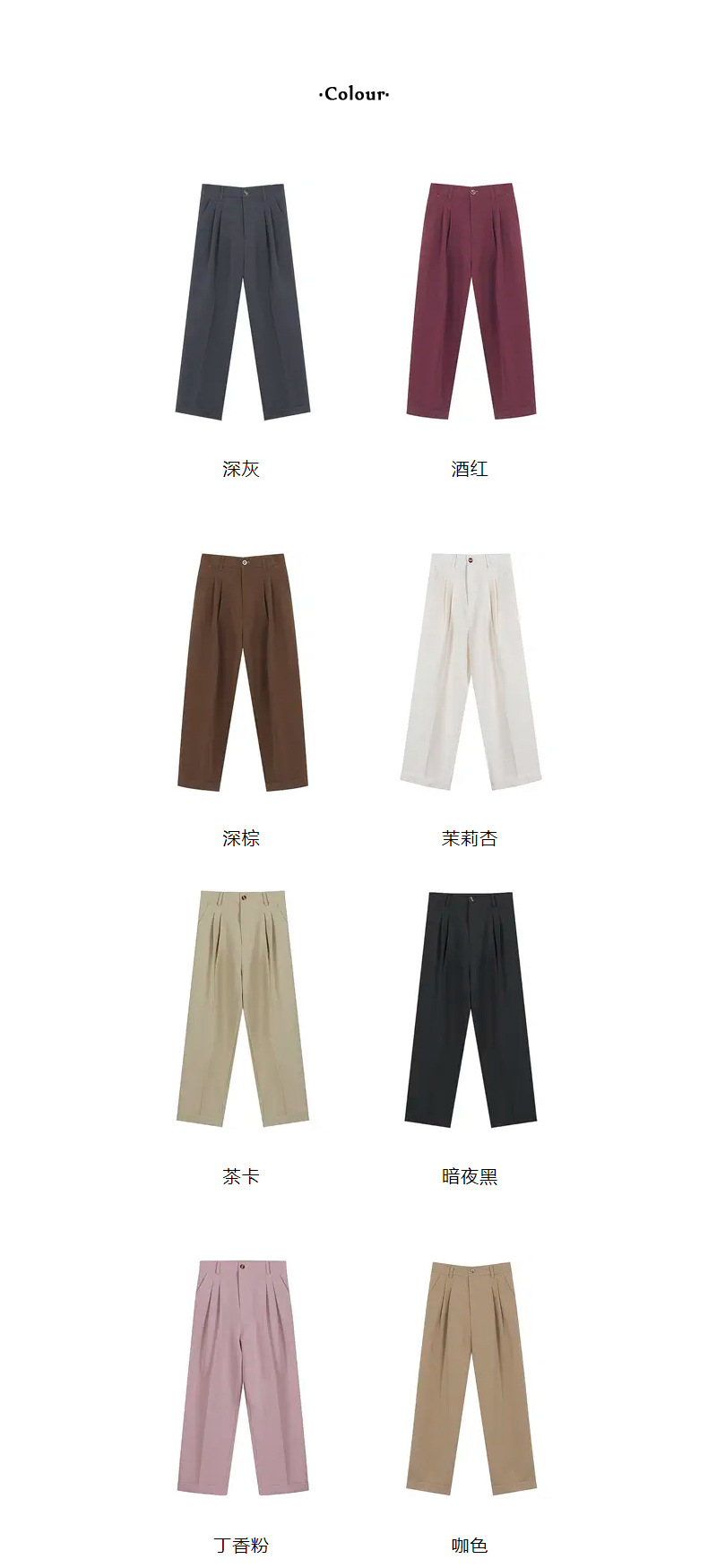 颜色 暗夜黑,茉莉杏,茶卡,丁香粉,深棕,酒红,咖色,深灰