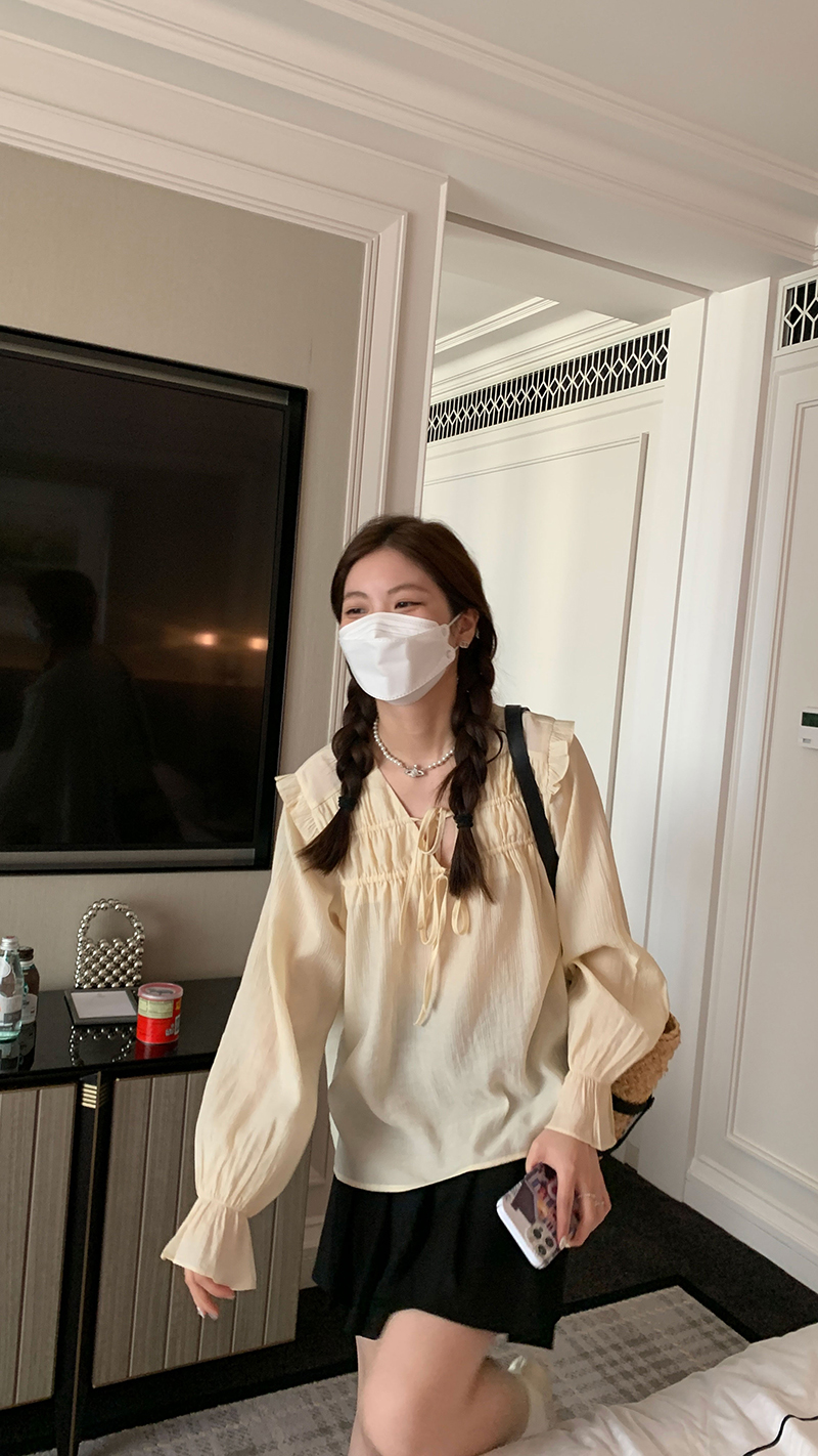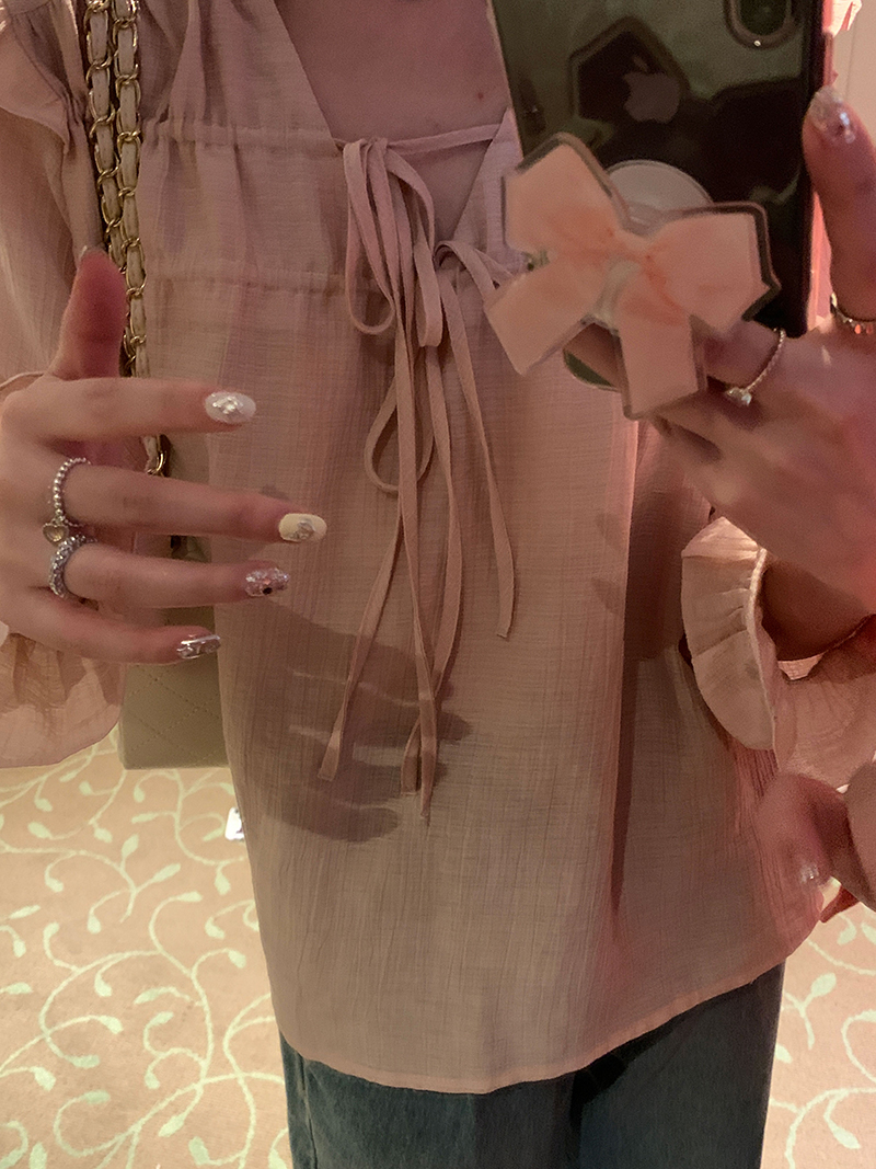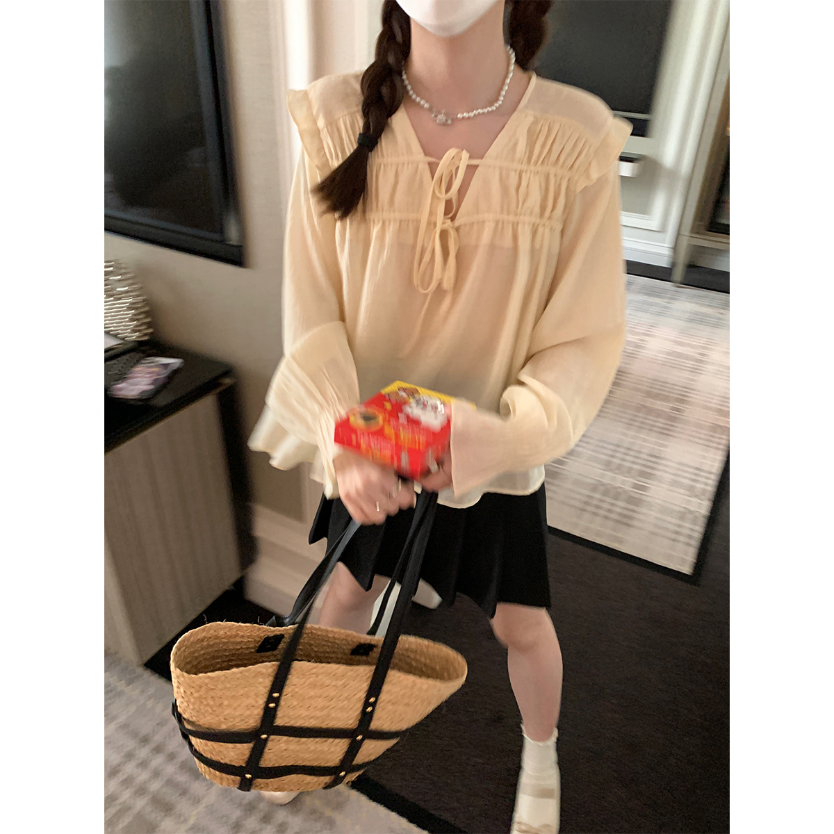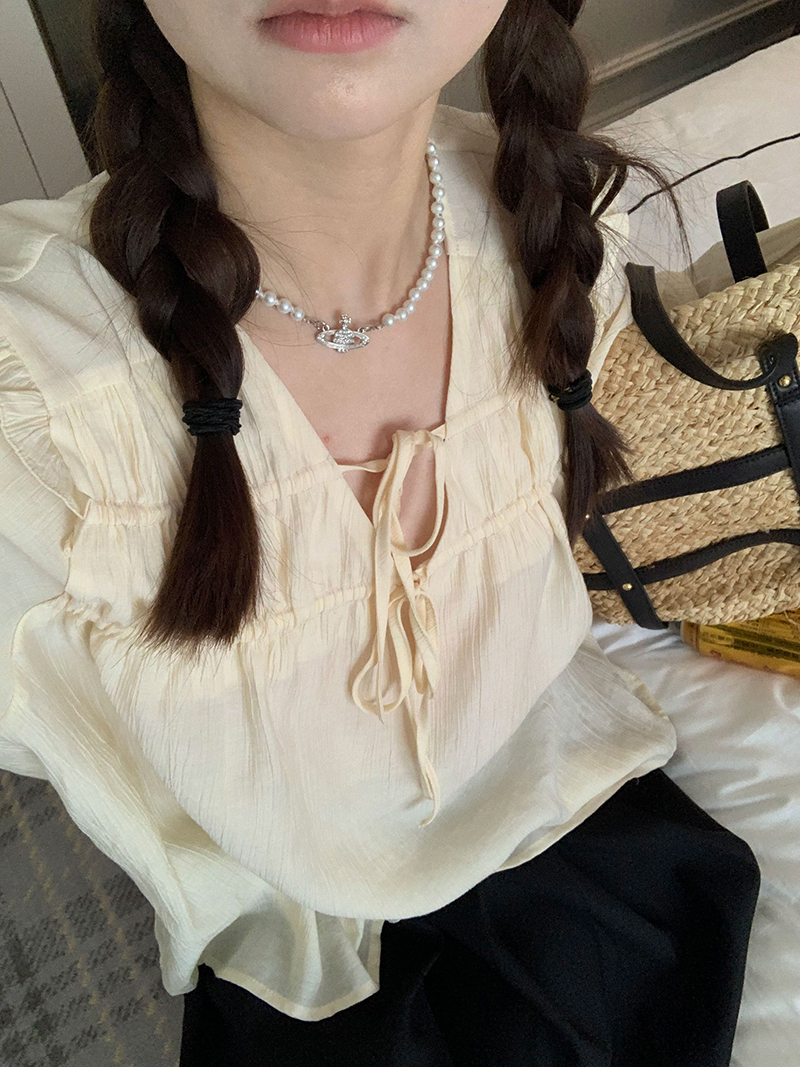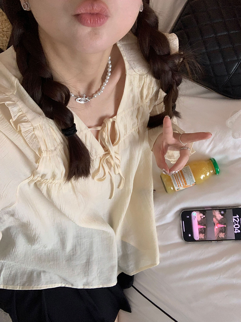 【現貨】im向奶油冰淇淋木耳邊繫帶襯衫女春夏肌理感V領長袖上衣