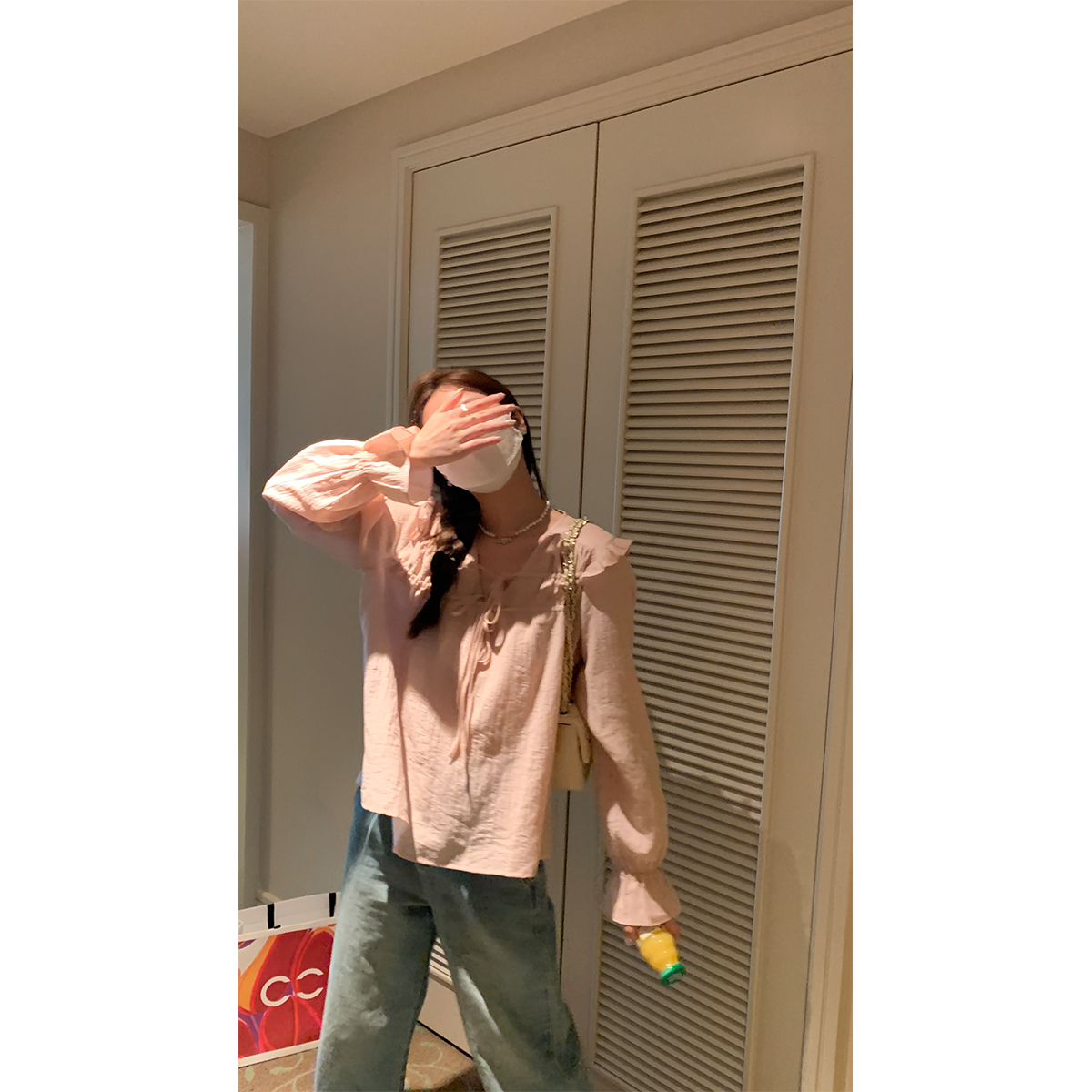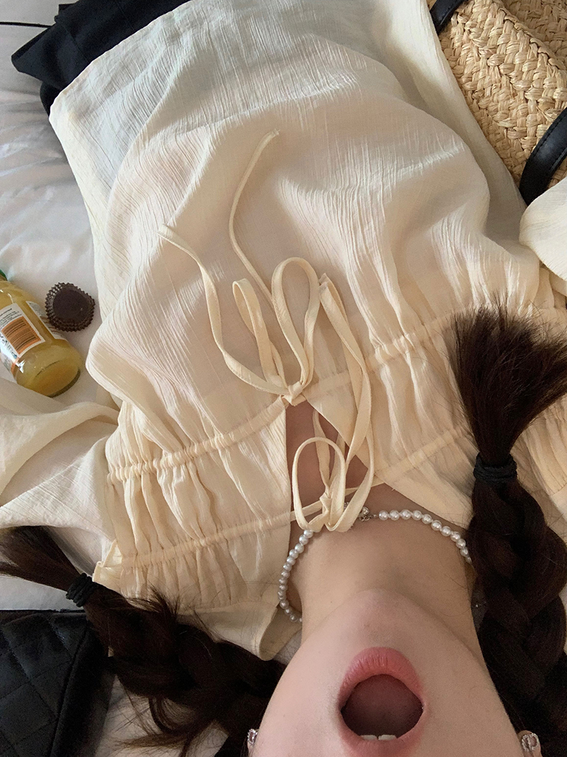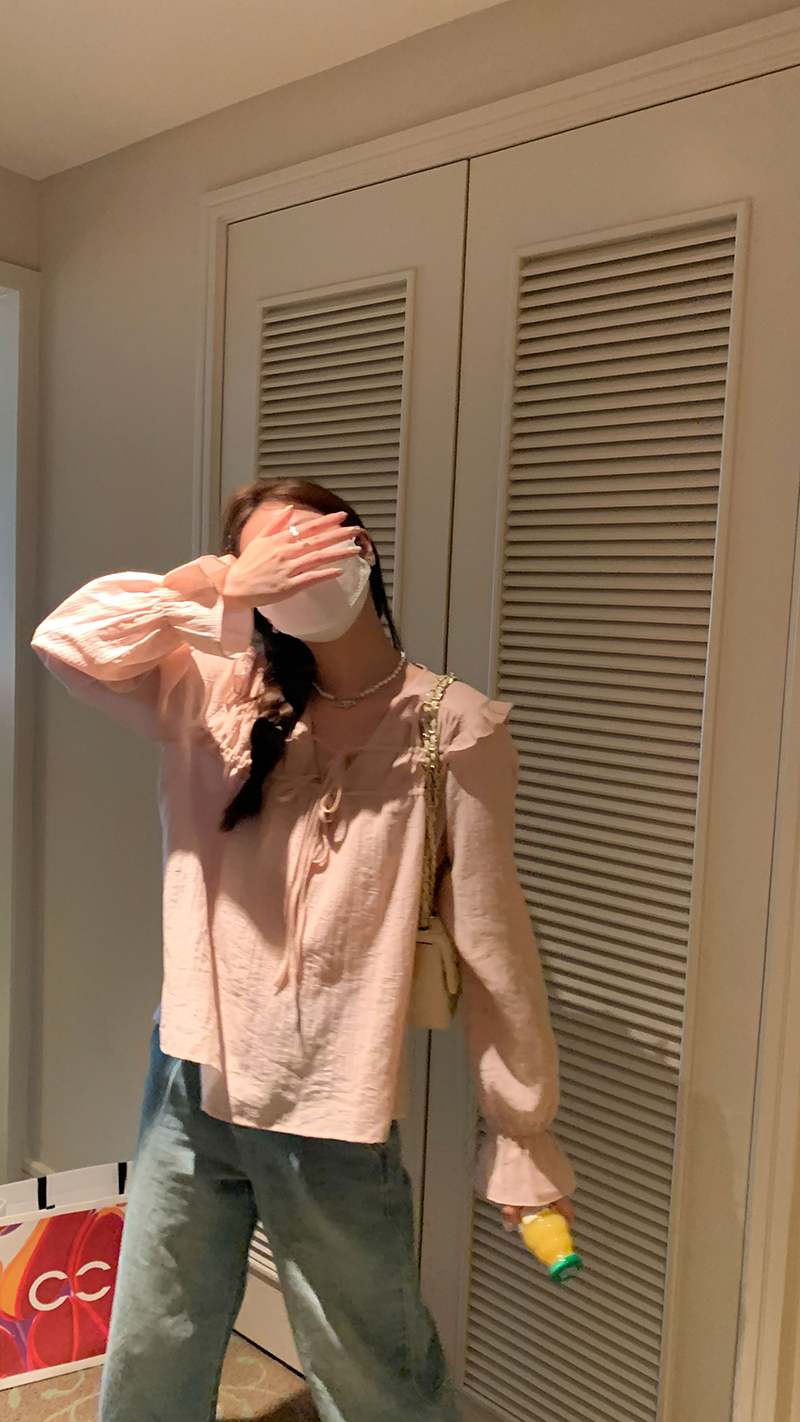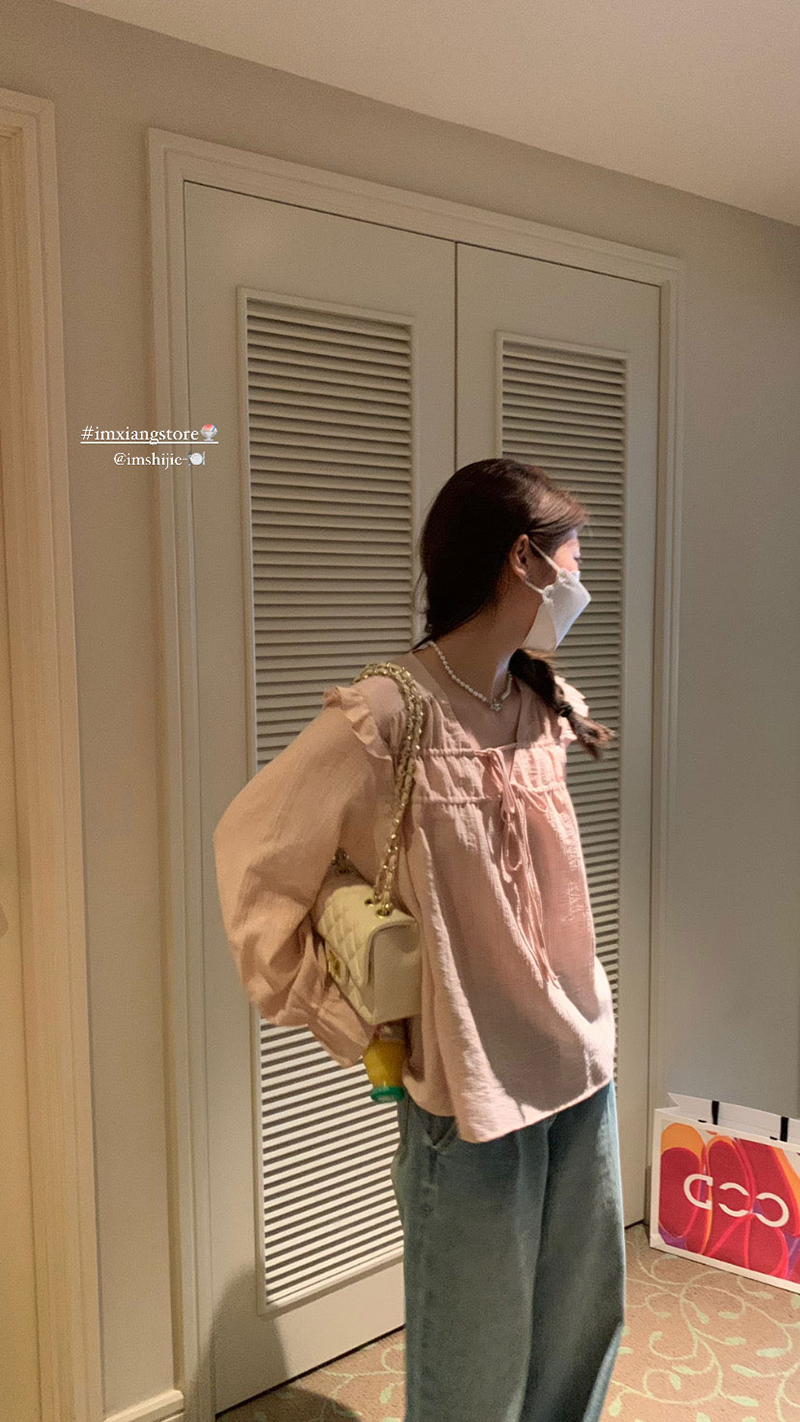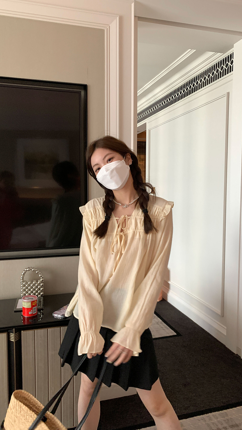 【現貨】im向奶油冰淇淋木耳邊繫帶襯衫女春夏肌理感V領長袖上衣