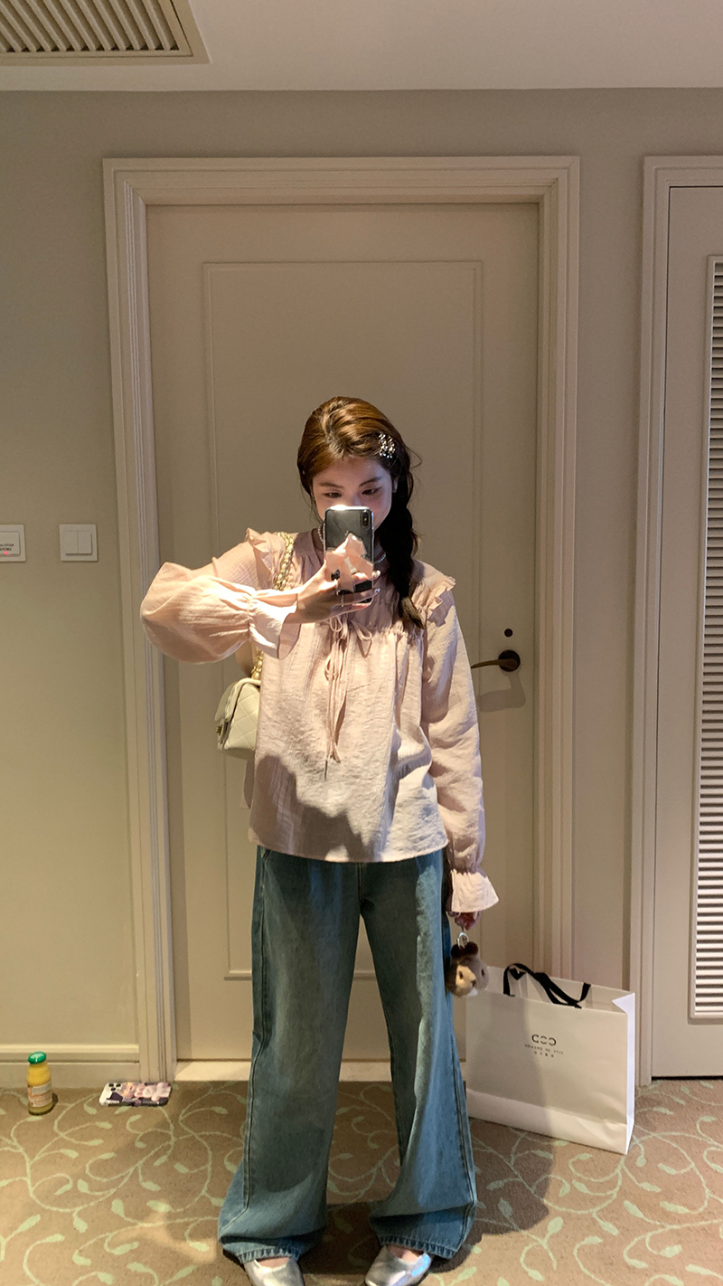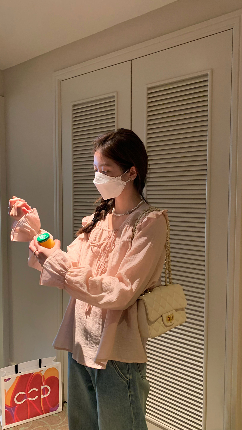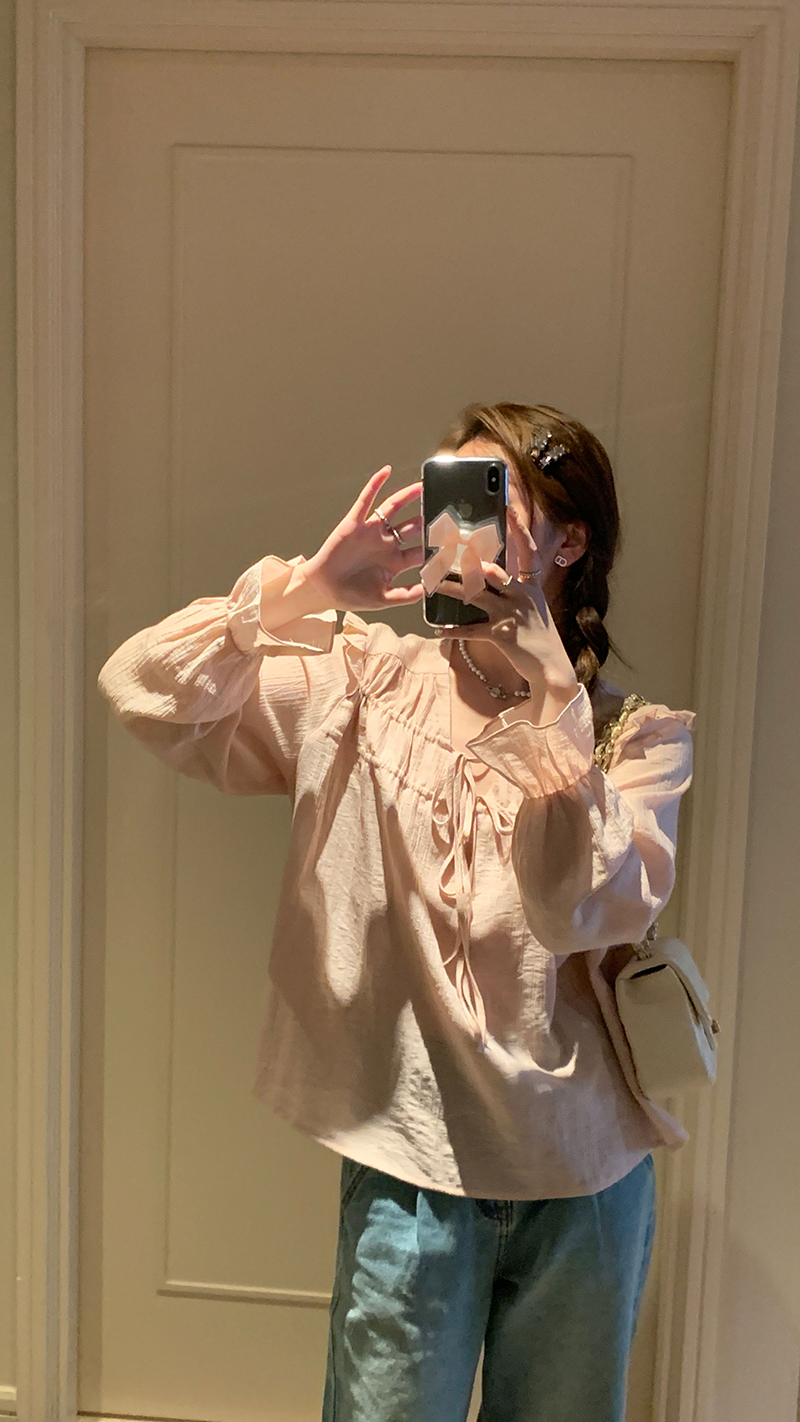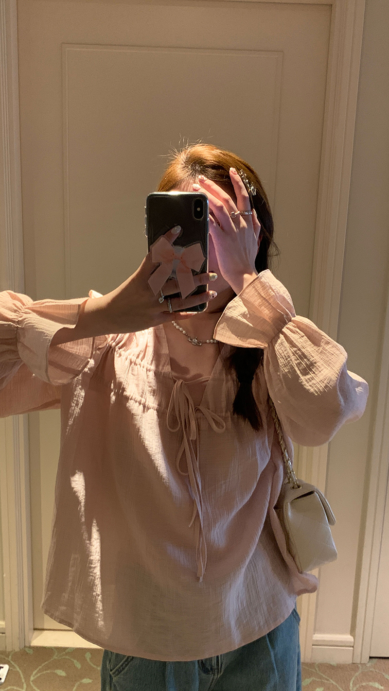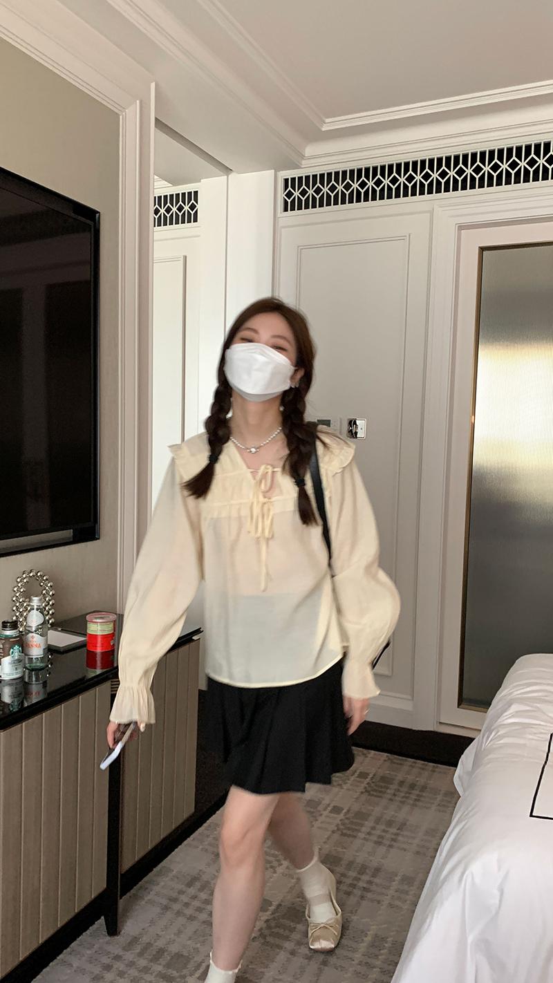 【現貨】im向奶油冰淇淋木耳邊繫帶襯衫女春夏肌理感V領長袖上衣
