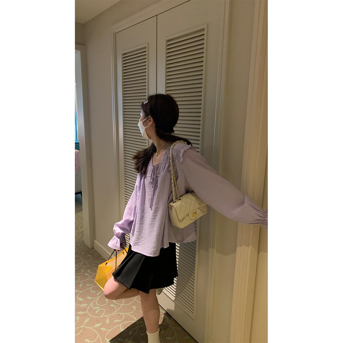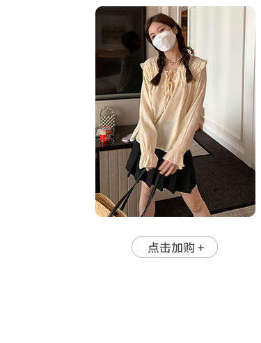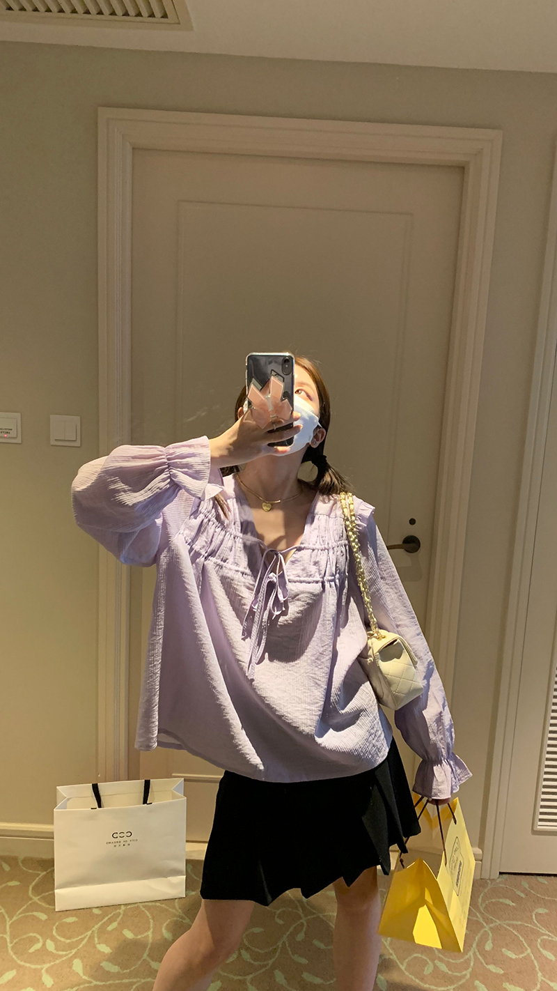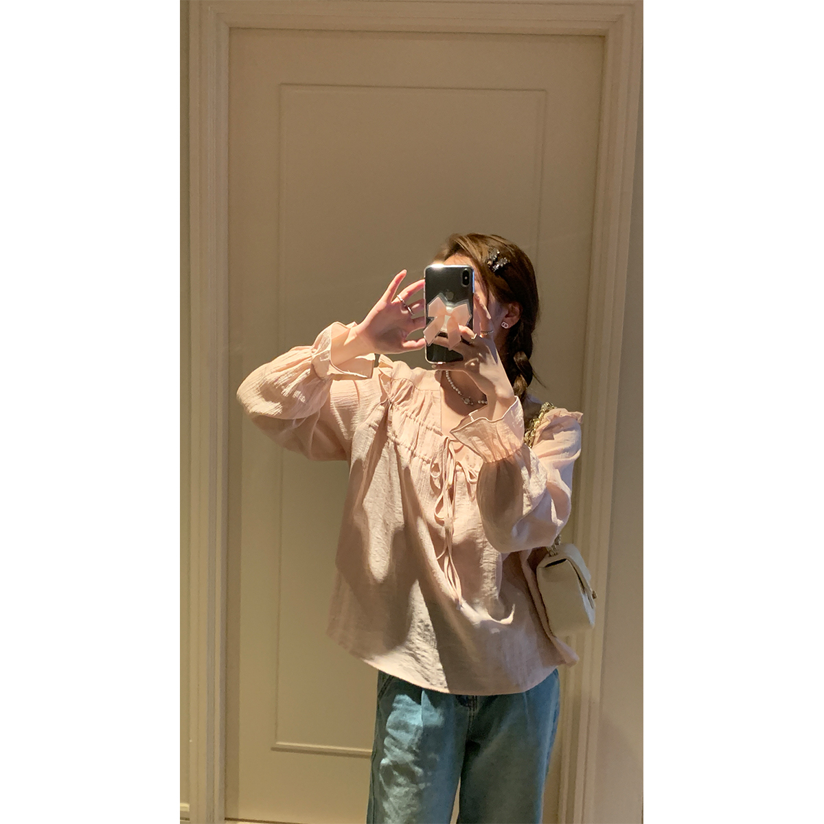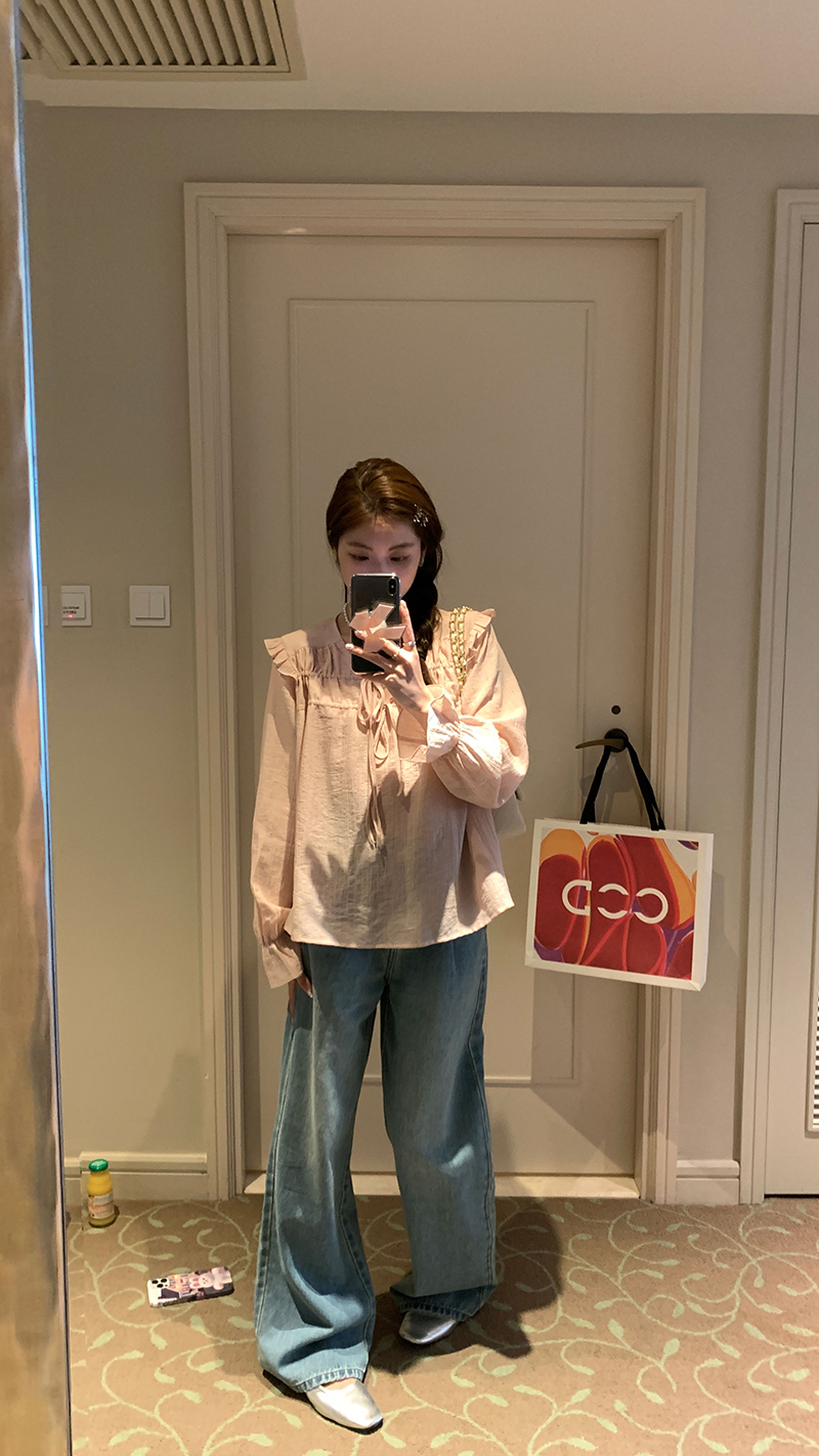 【現貨】im向奶油冰淇淋木耳邊繫帶襯衫女春夏肌理感V領長袖上衣