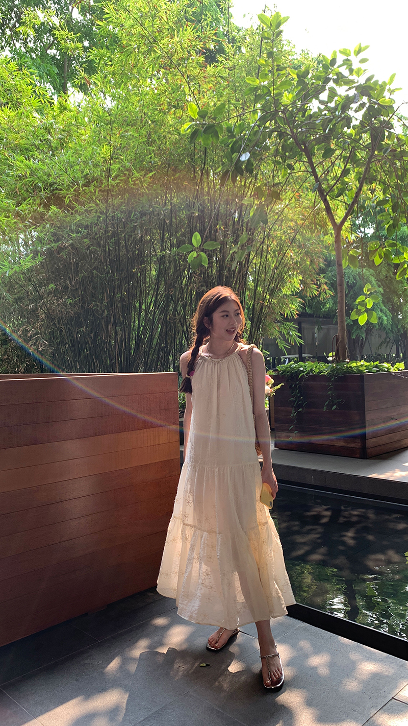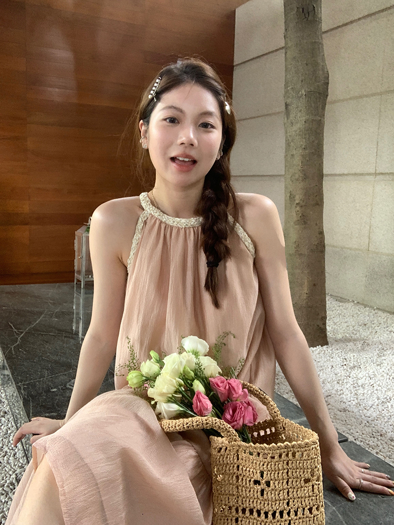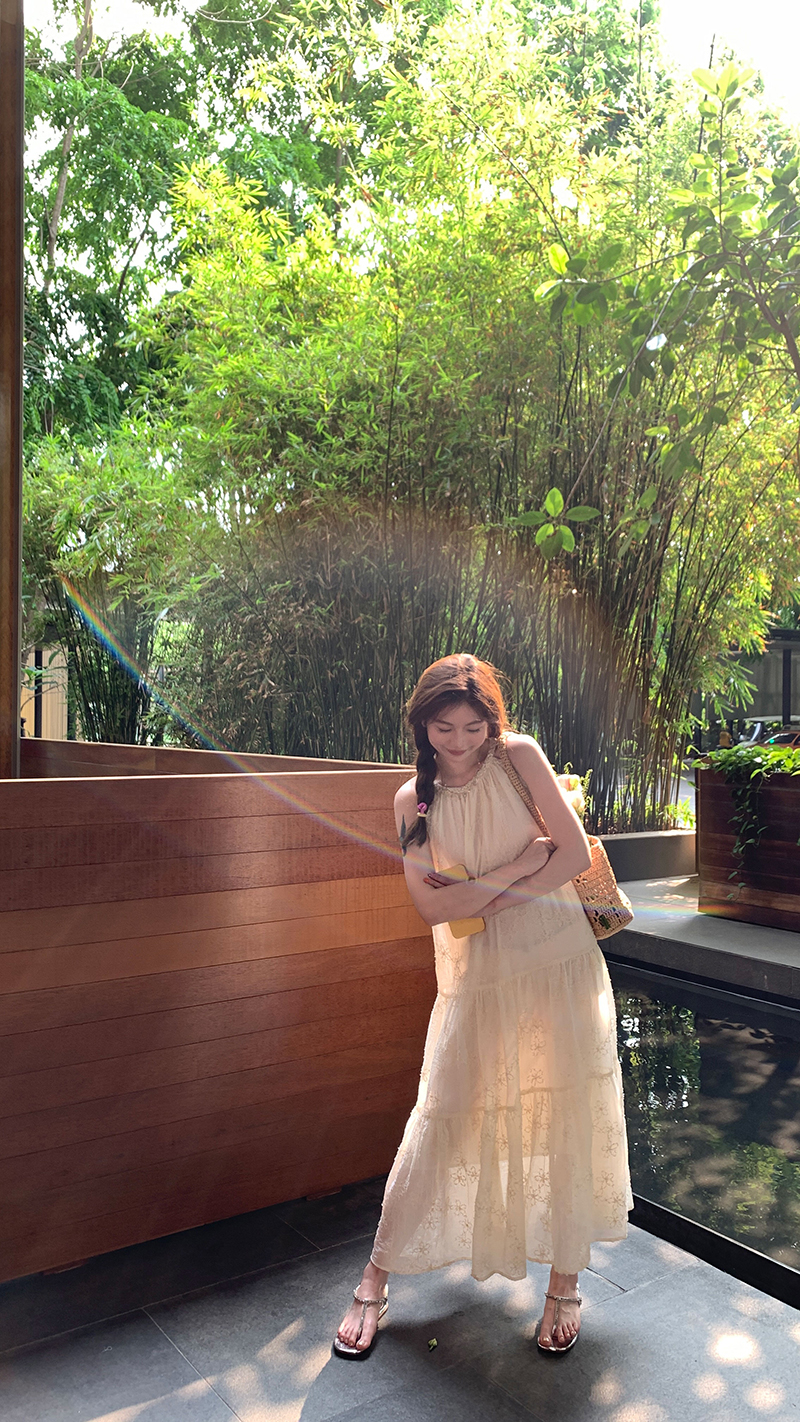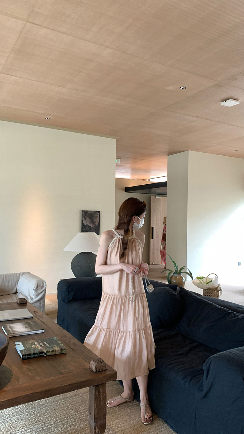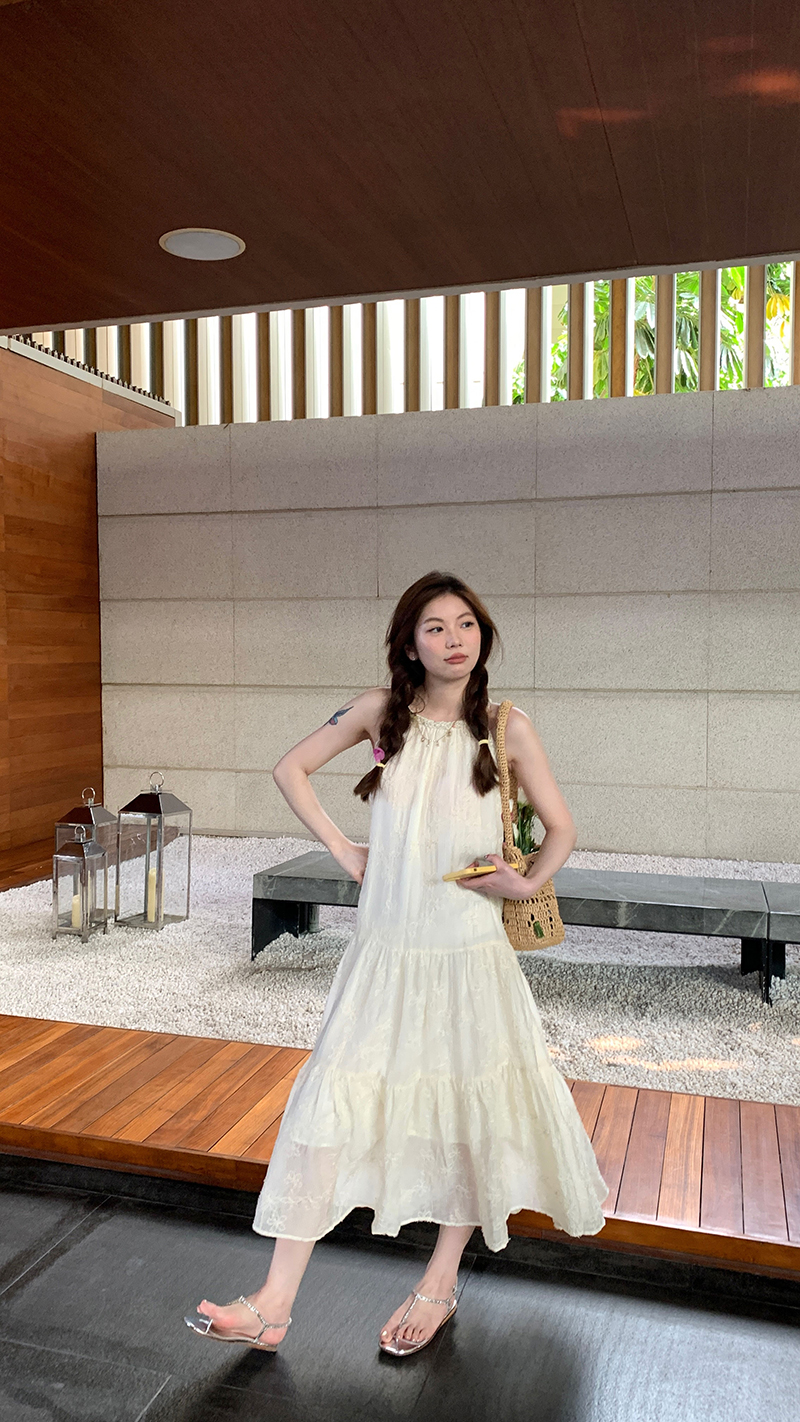 【現貨】im向帕尼達下午茶慵懶風掛頸削肩洋裝度假風織帶吊帶裙