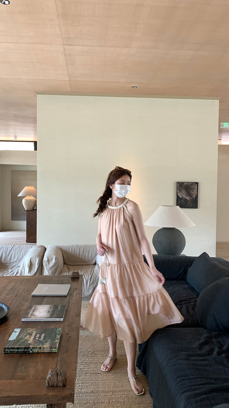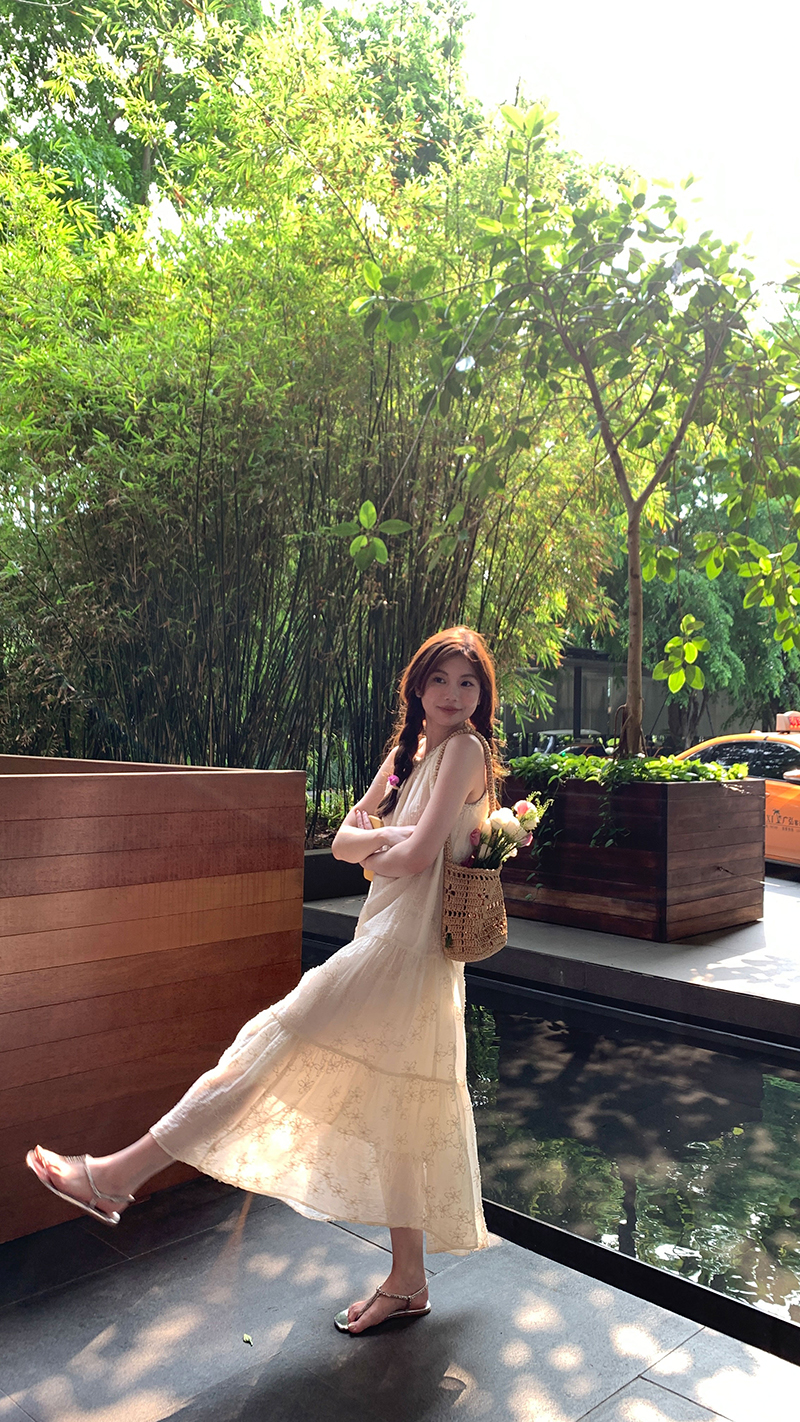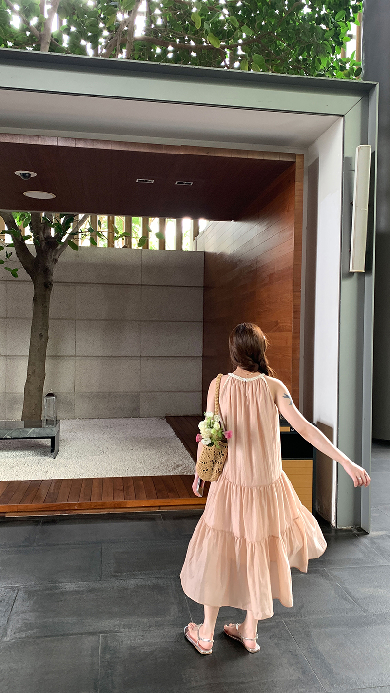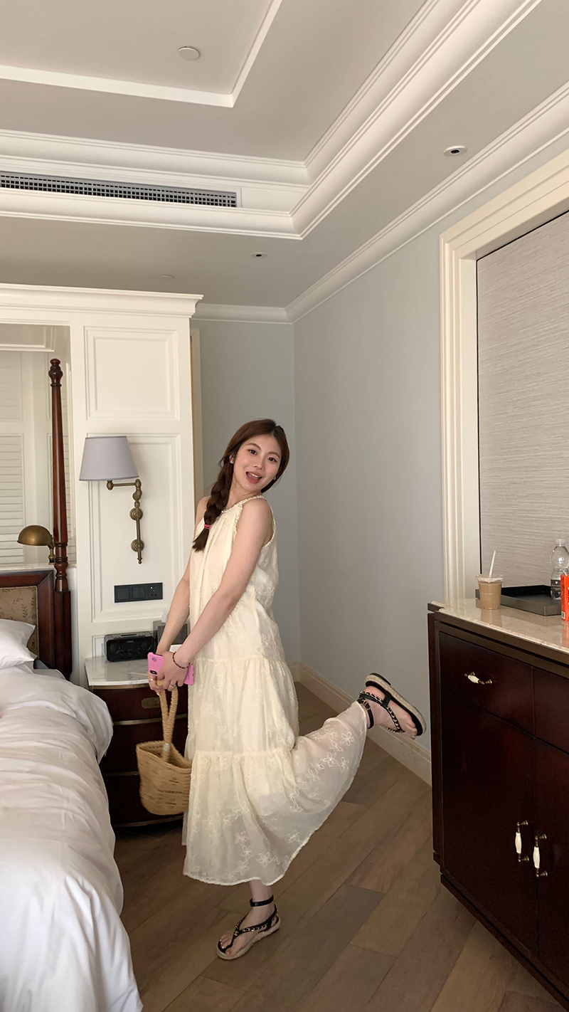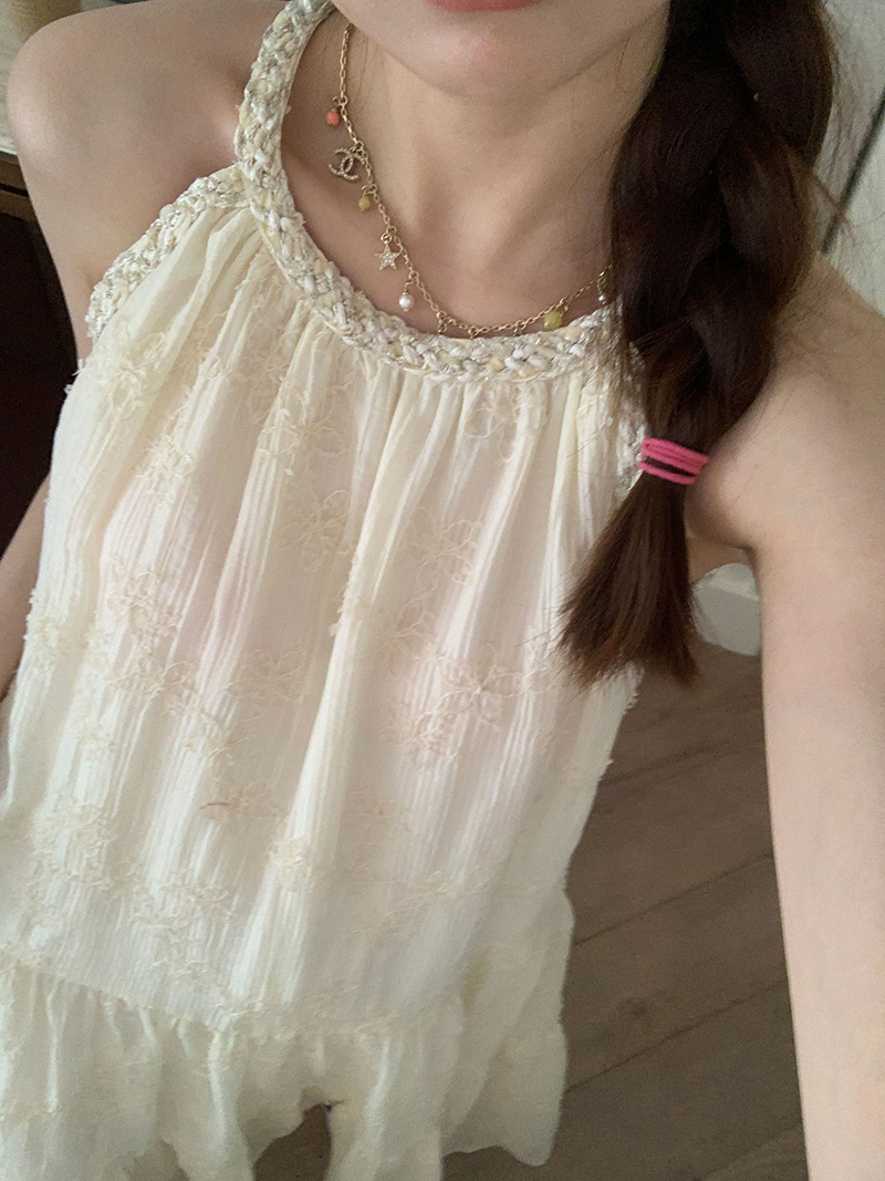 【現貨】im向帕尼達下午茶慵懶風掛頸削肩洋裝度假風織帶吊帶裙
