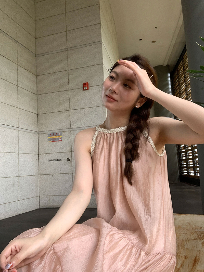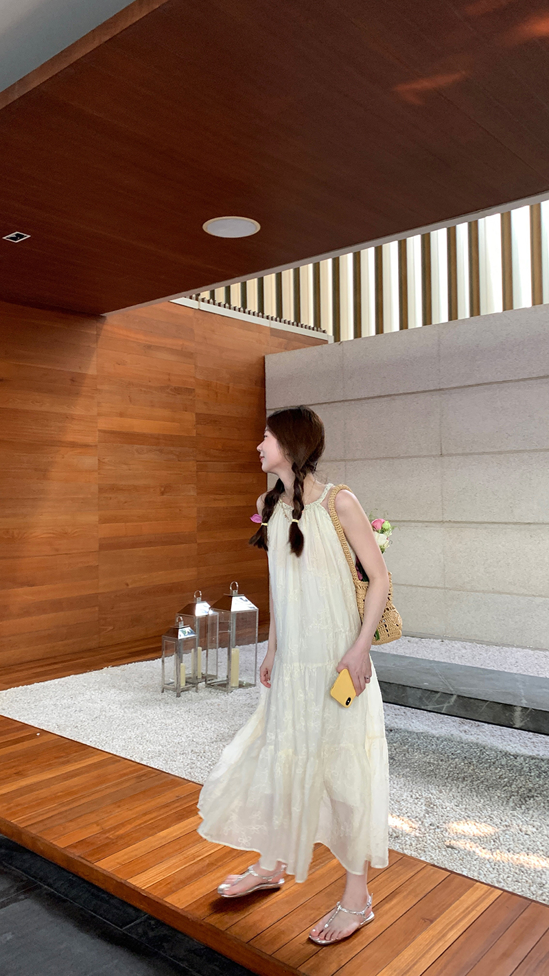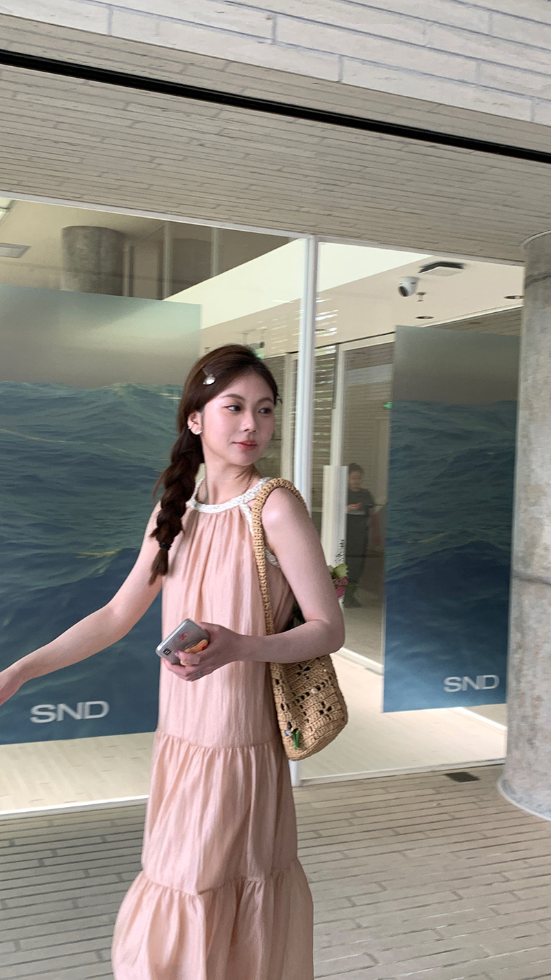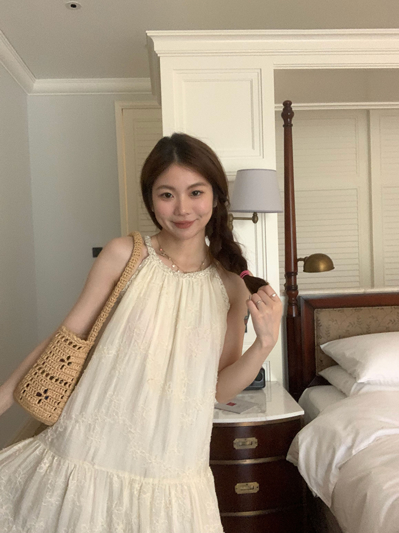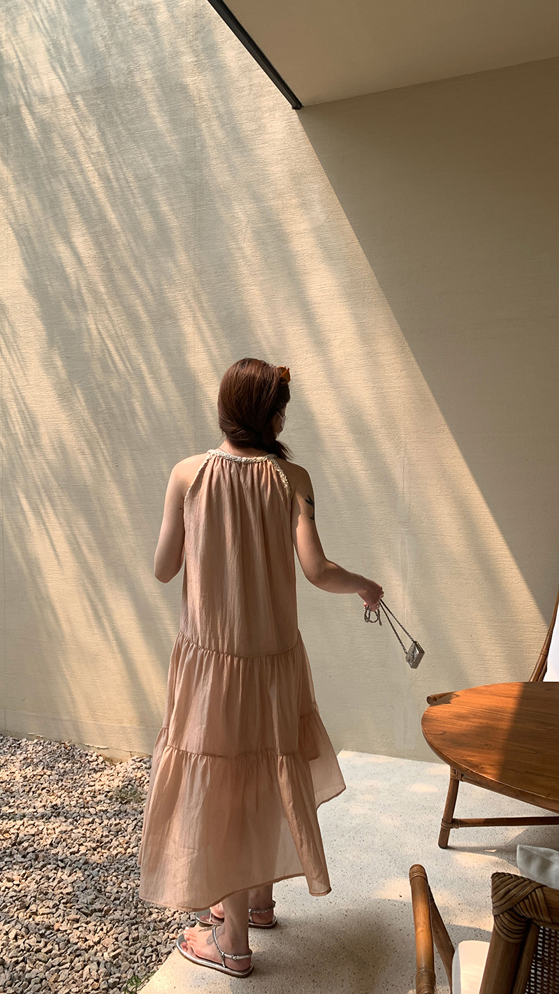 【現貨】im向帕尼達下午茶慵懶風掛頸削肩洋裝度假風織帶吊帶裙