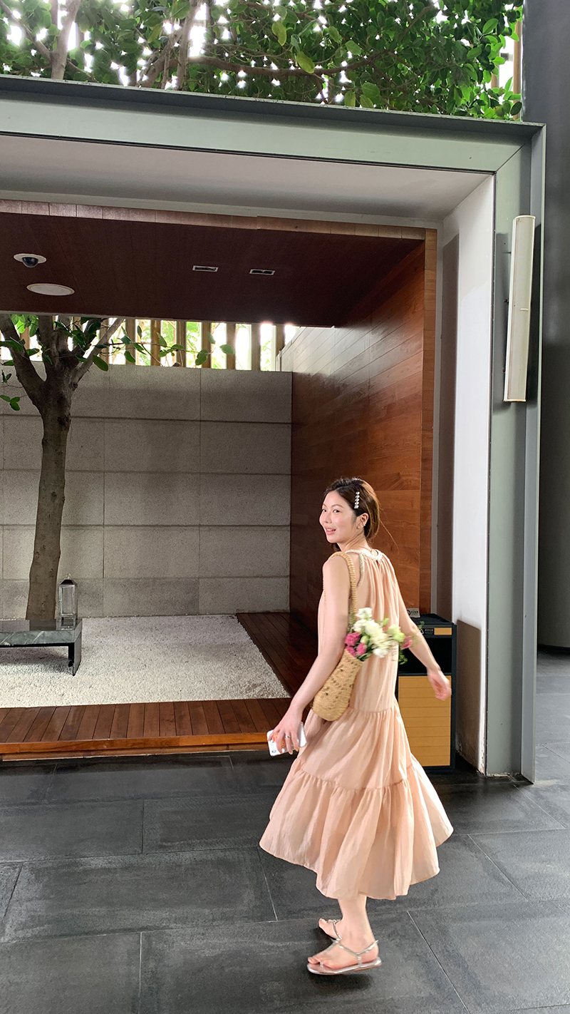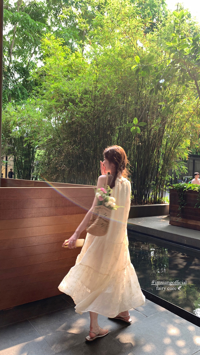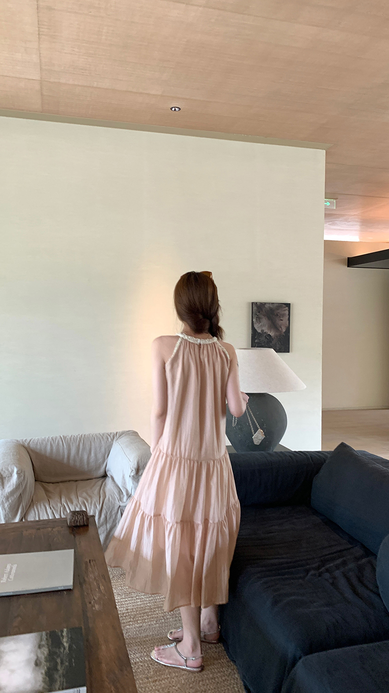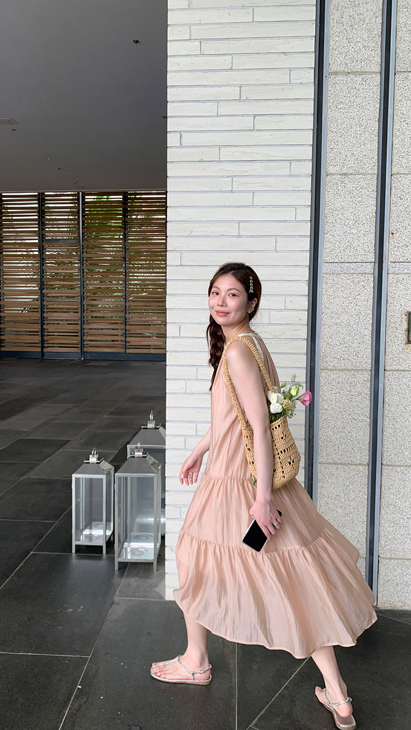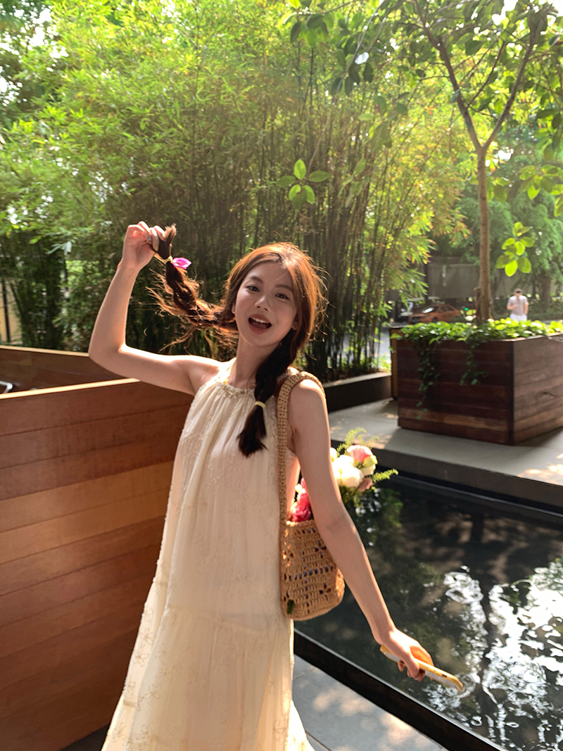 【現貨】im向帕尼達下午茶慵懶風掛頸削肩洋裝度假風織帶吊帶裙