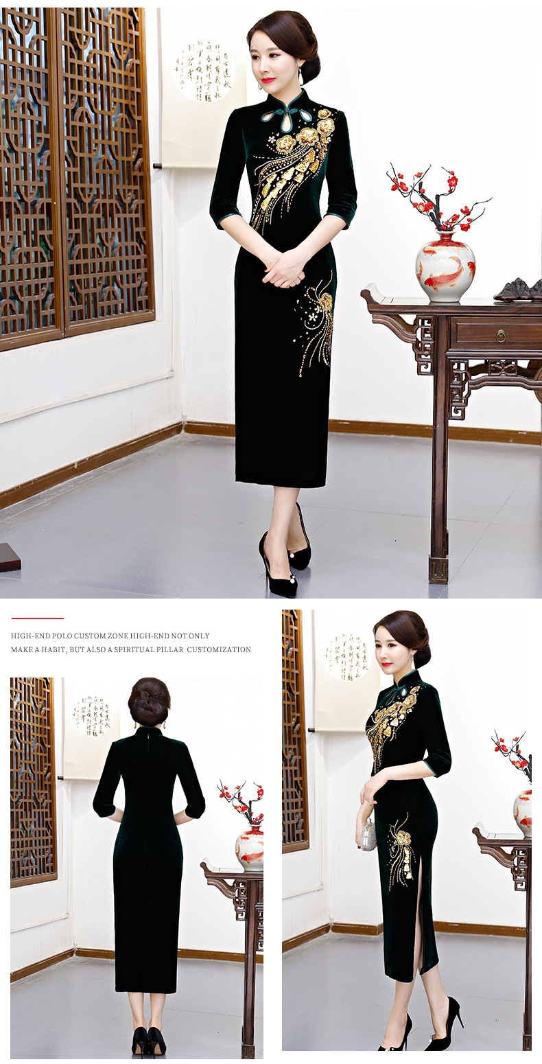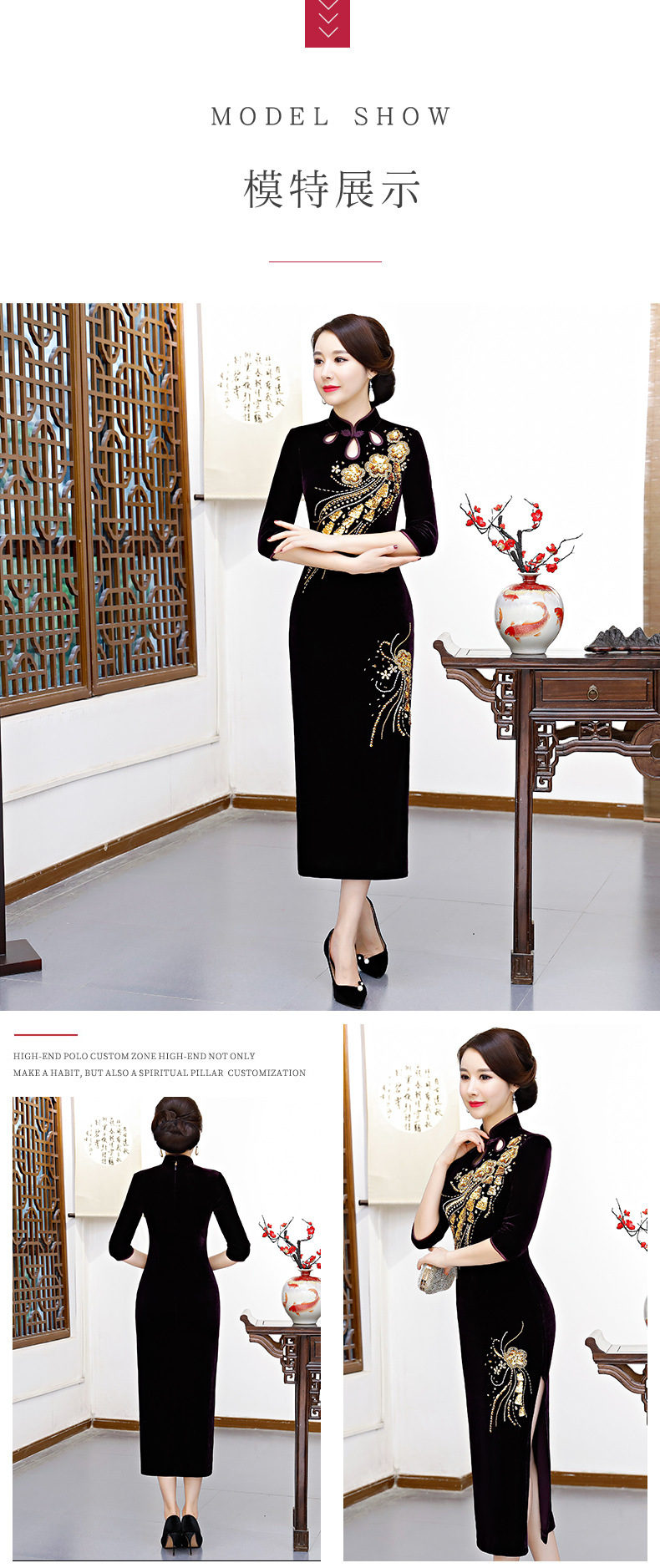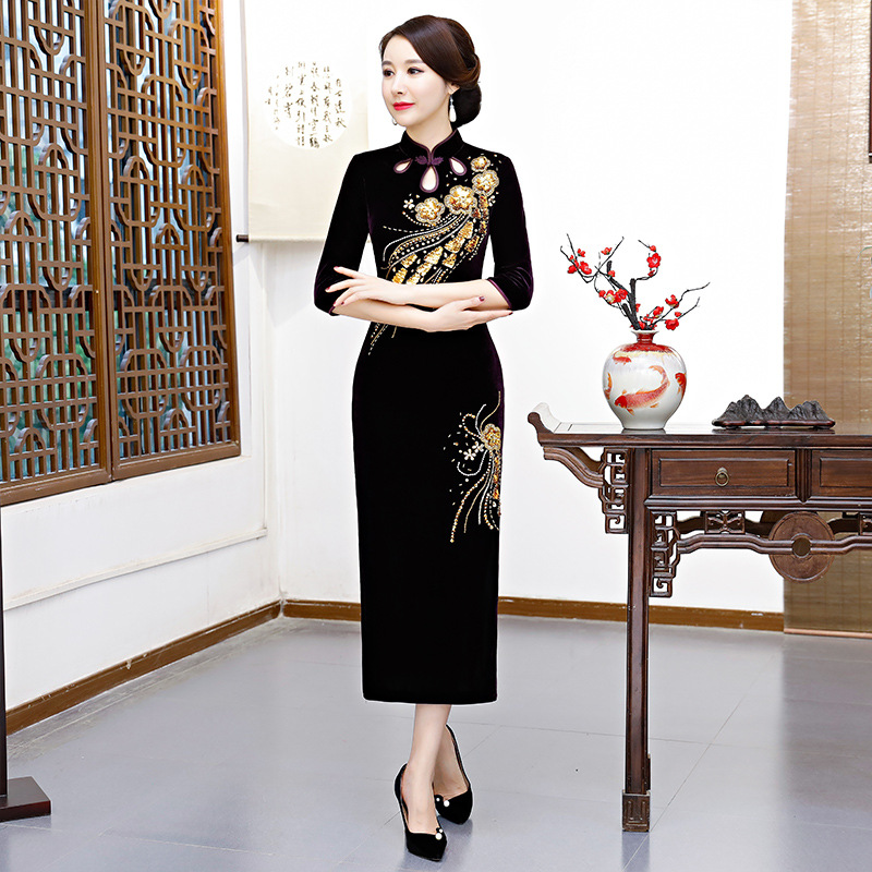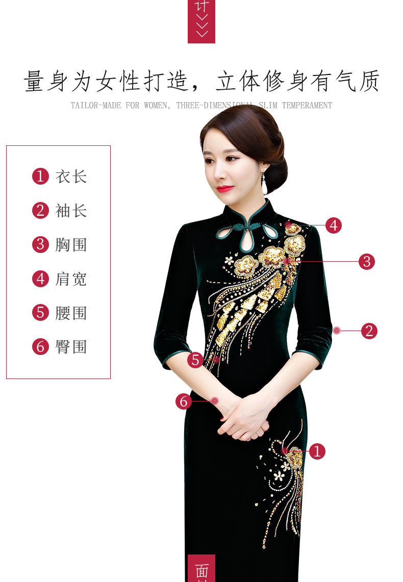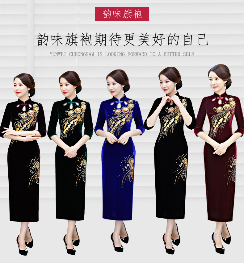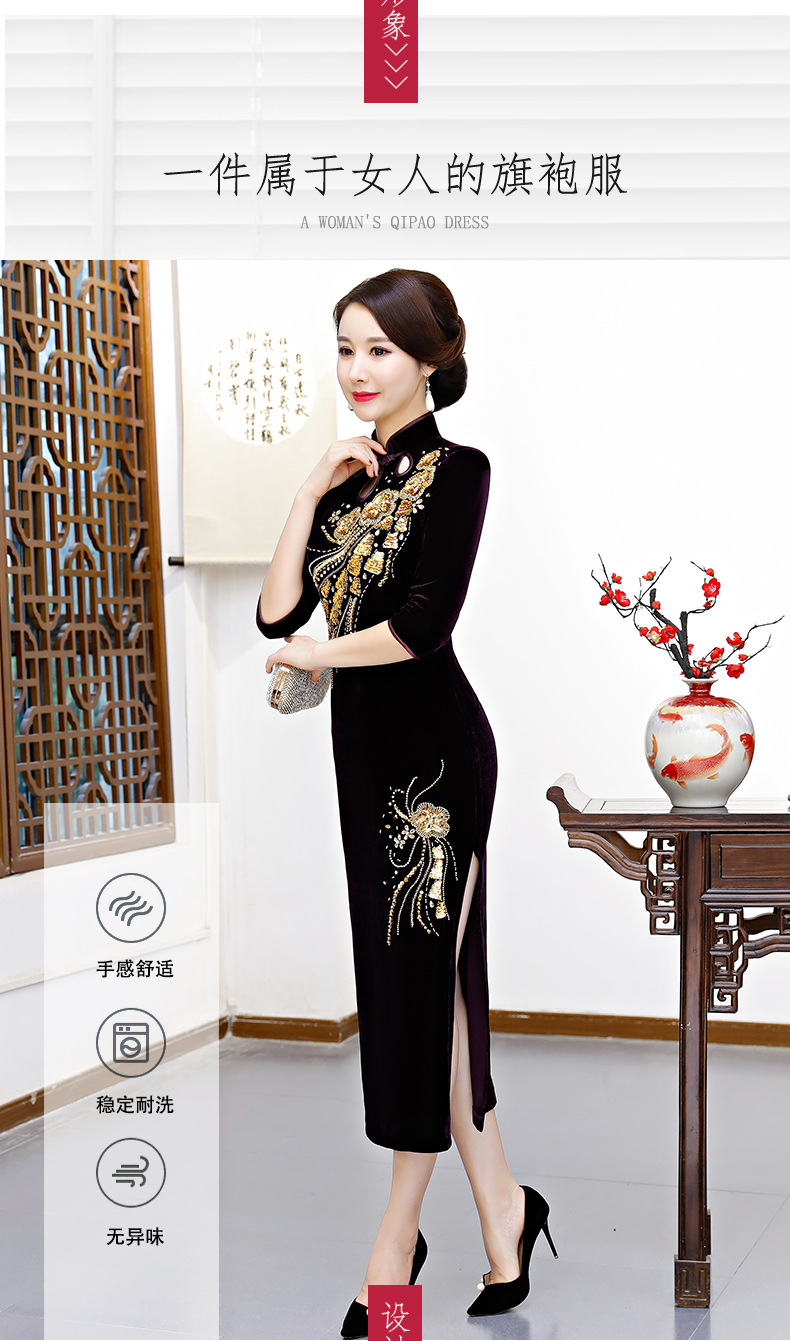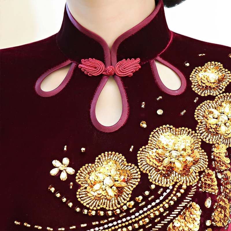 厂家直供2021新款旗袍手工串珠丝绒旗袍长款中老年复古宴会旗袍裙