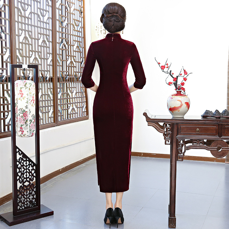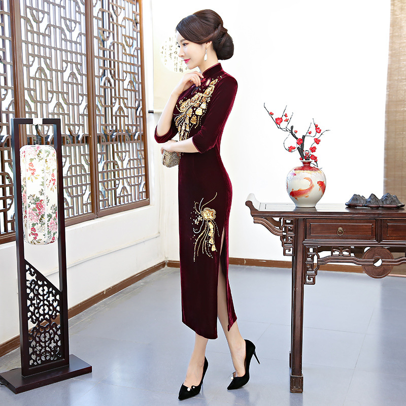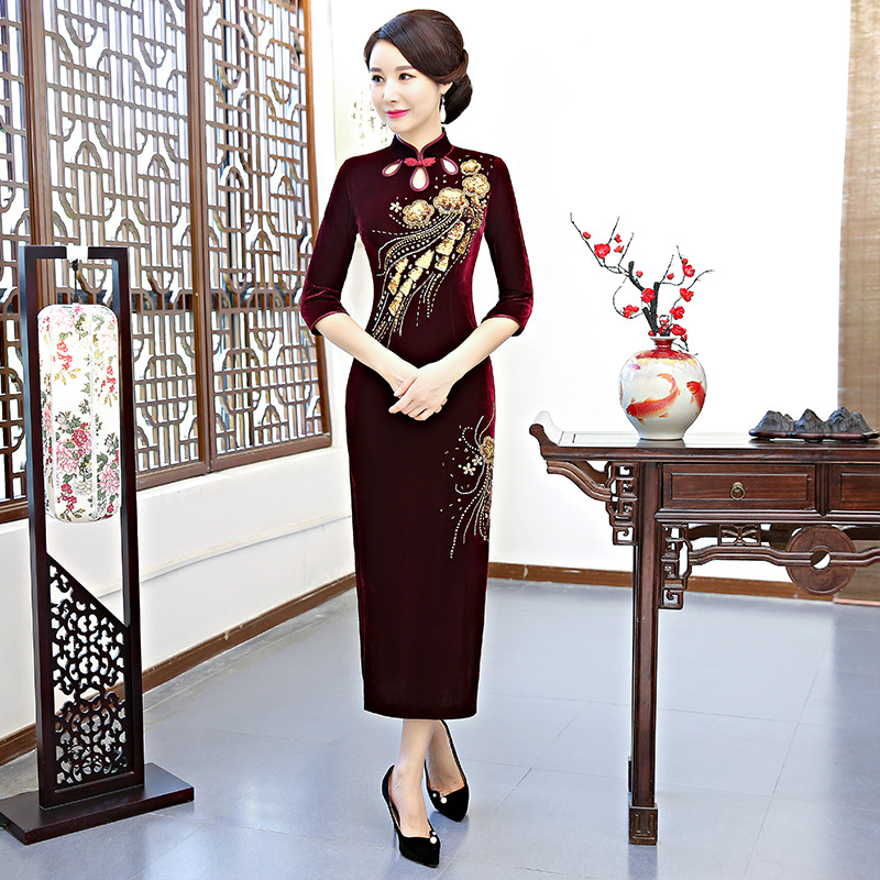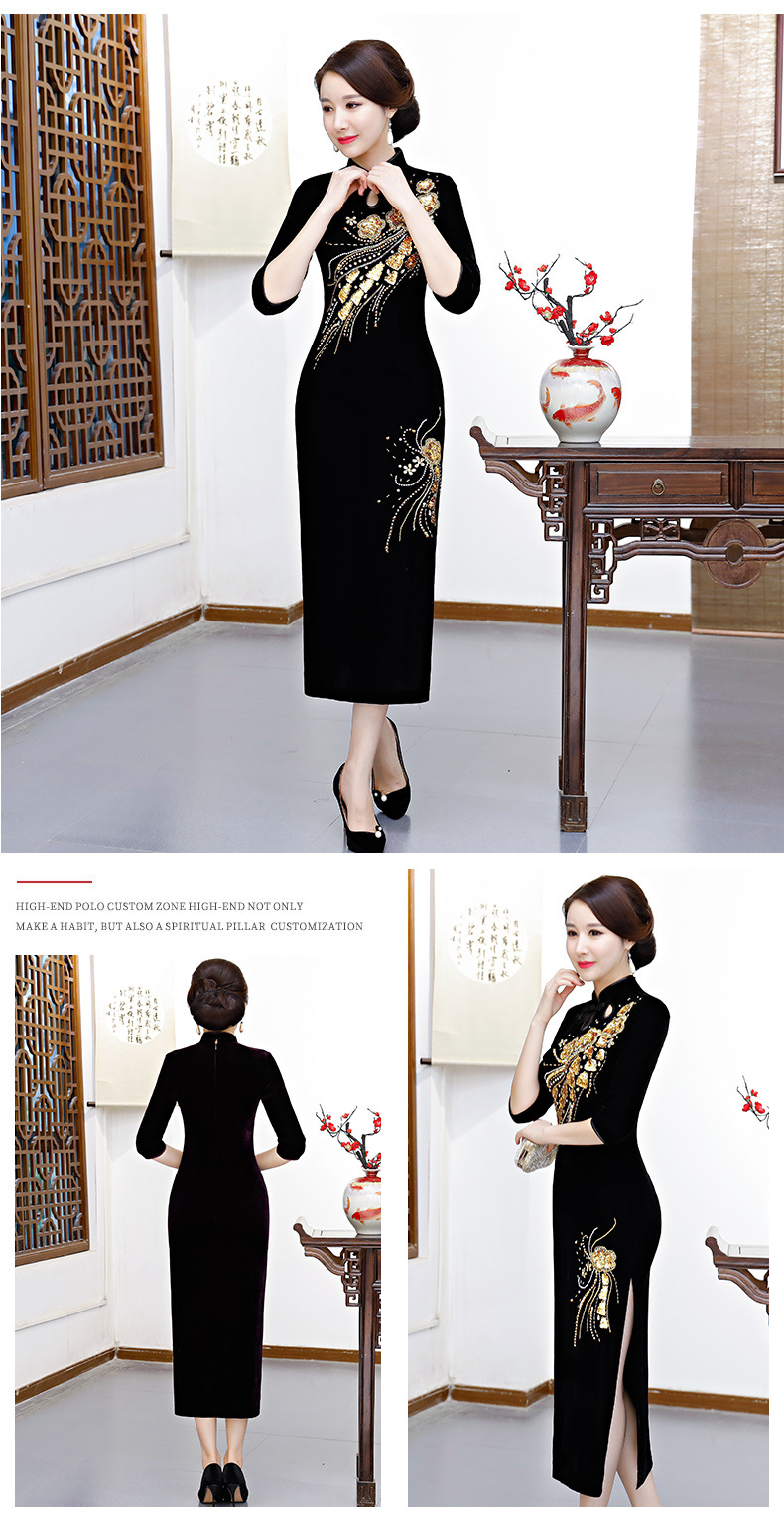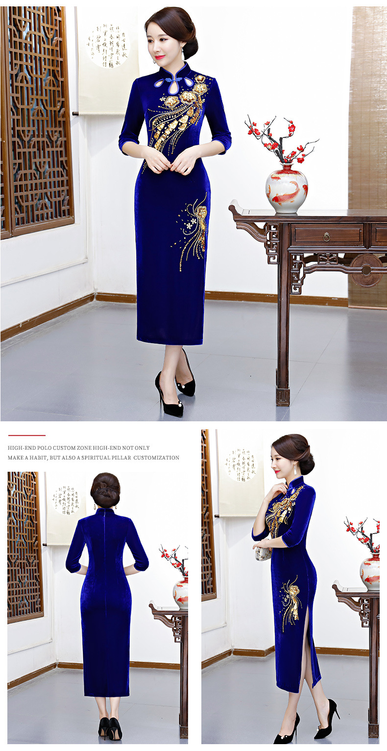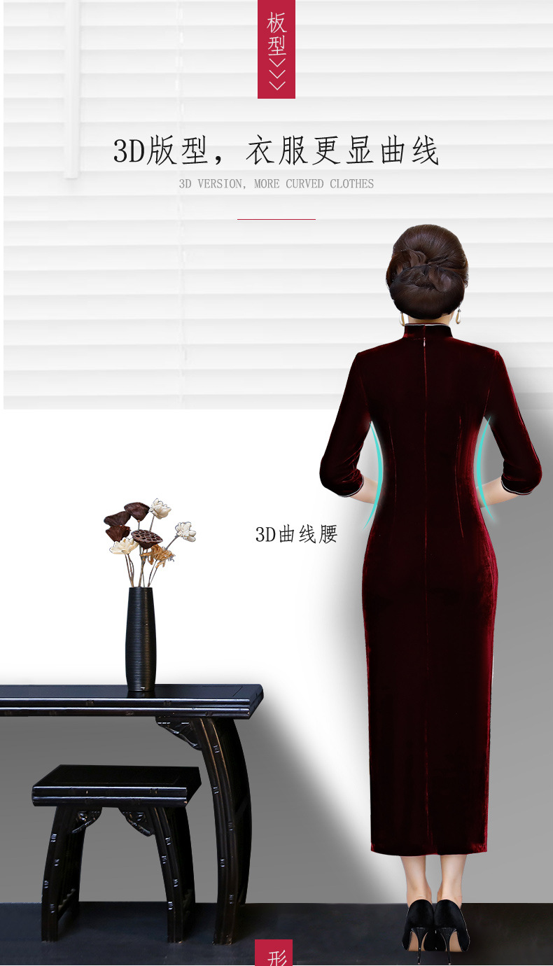 厂家直供2021新款旗袍手工串珠丝绒旗袍长款中老年复古宴会旗袍裙