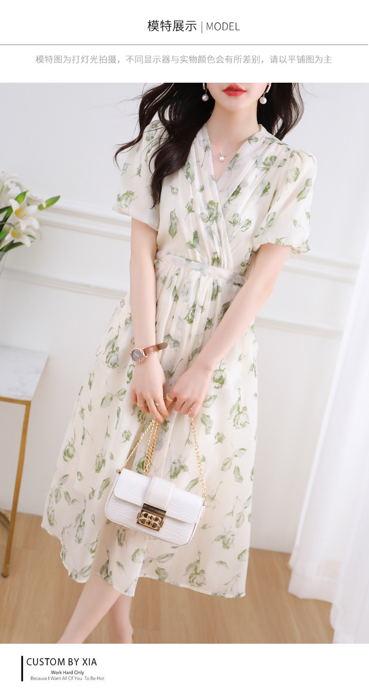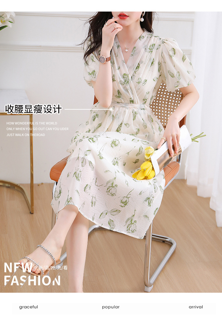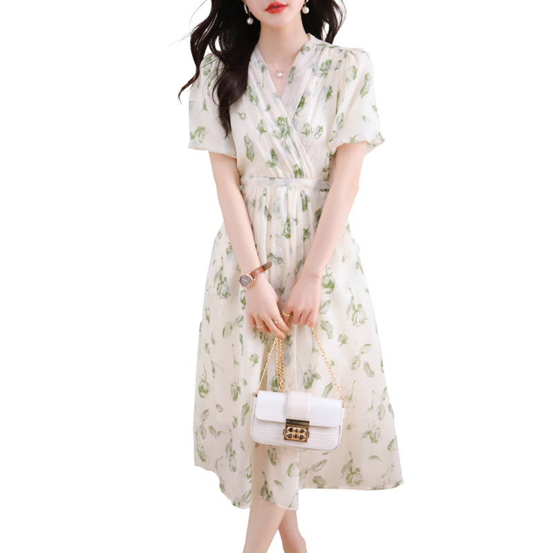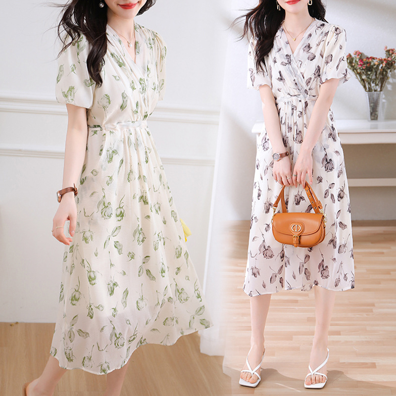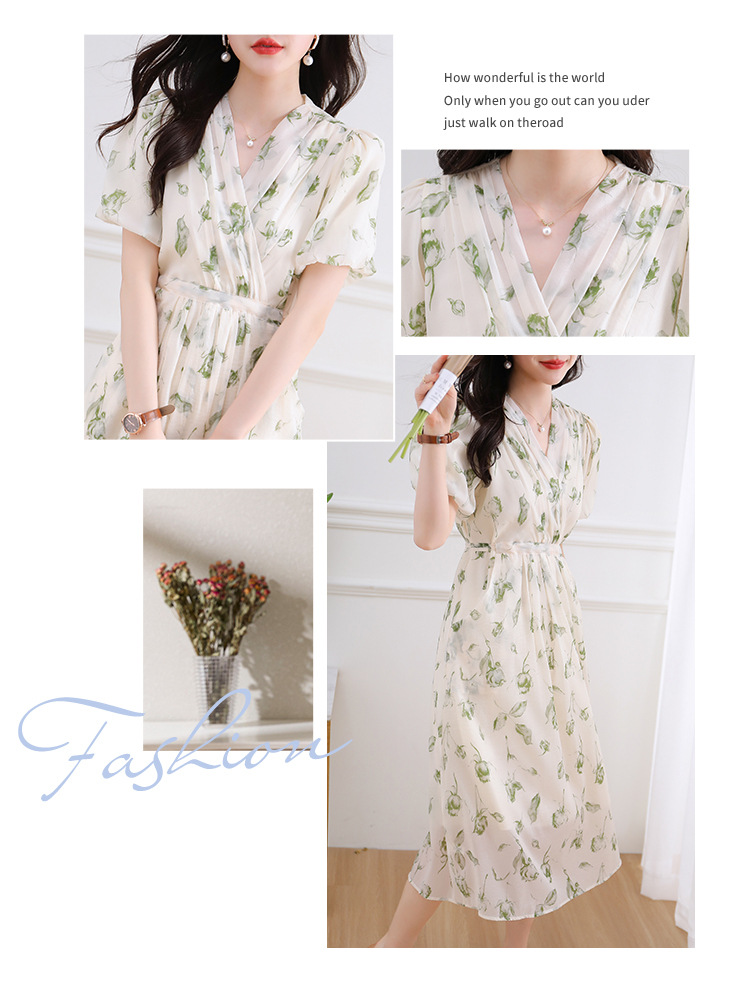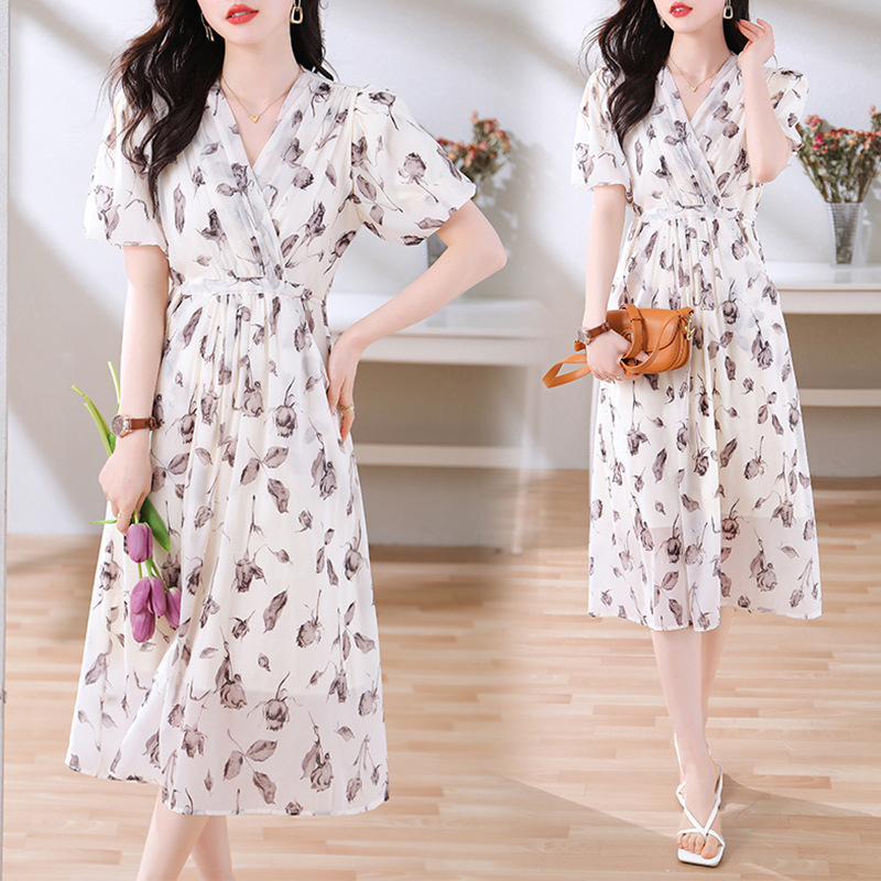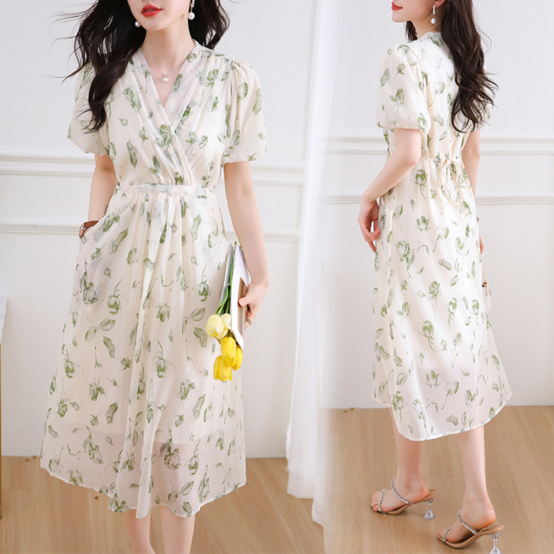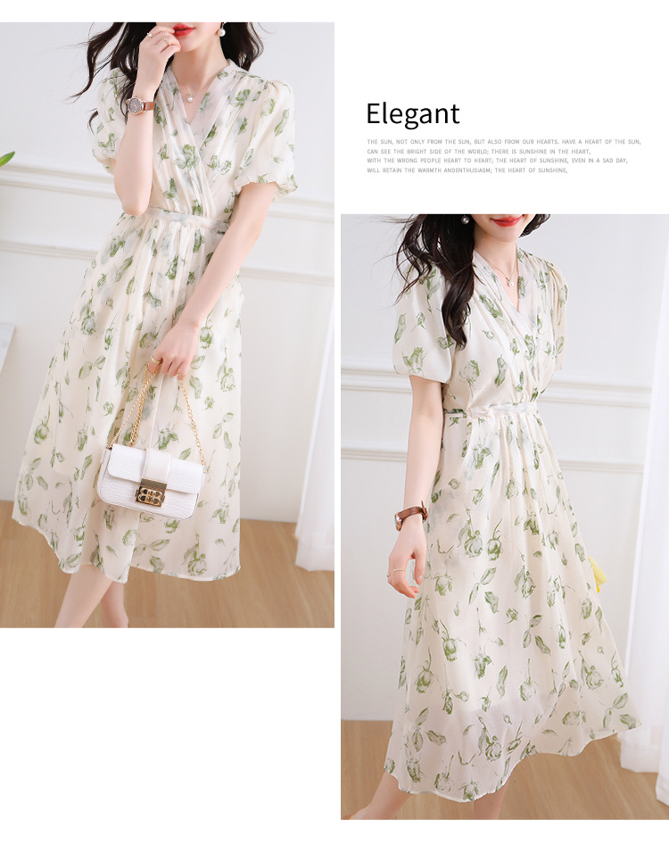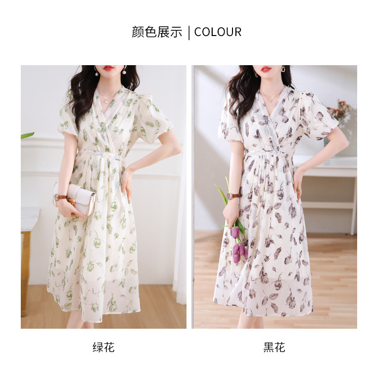 2023夏新款V领蝴蝶结系带收腰显瘦碎花文艺桔梗雪纺短袖连衣裙