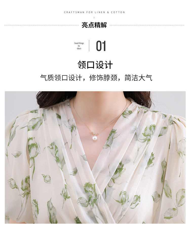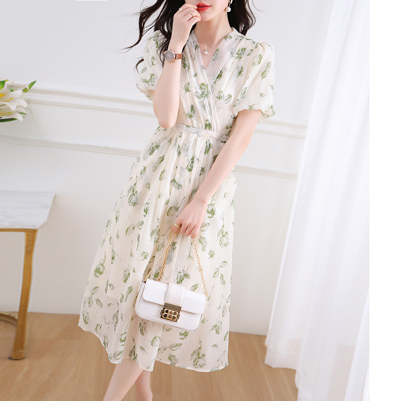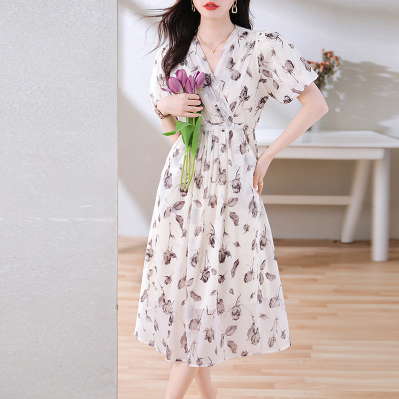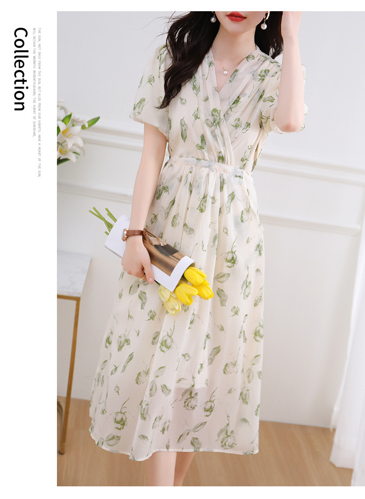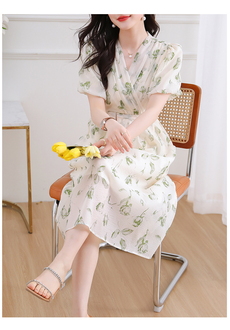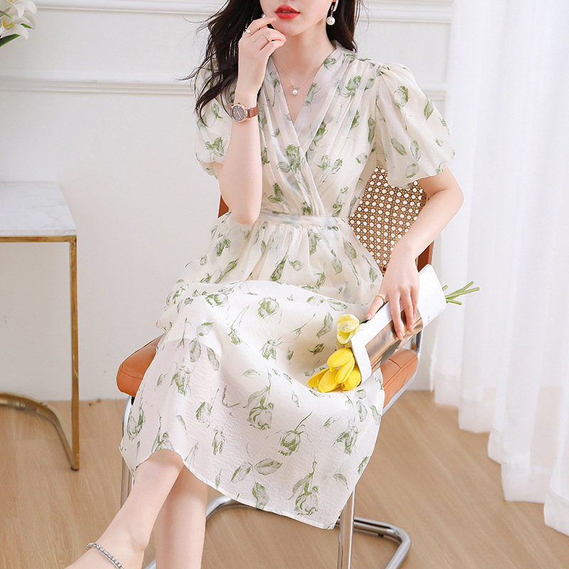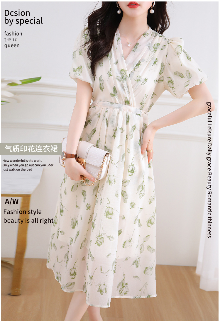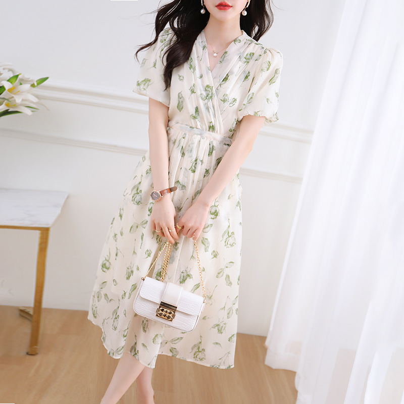 2023夏新款V领蝴蝶结系带收腰显瘦碎花文艺桔梗雪纺短袖连衣裙