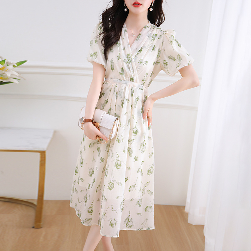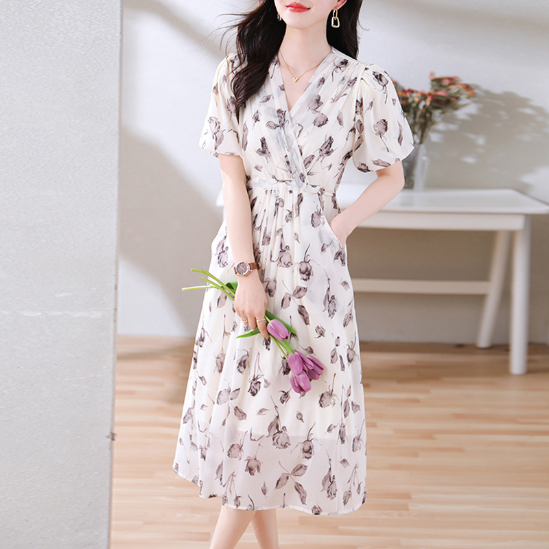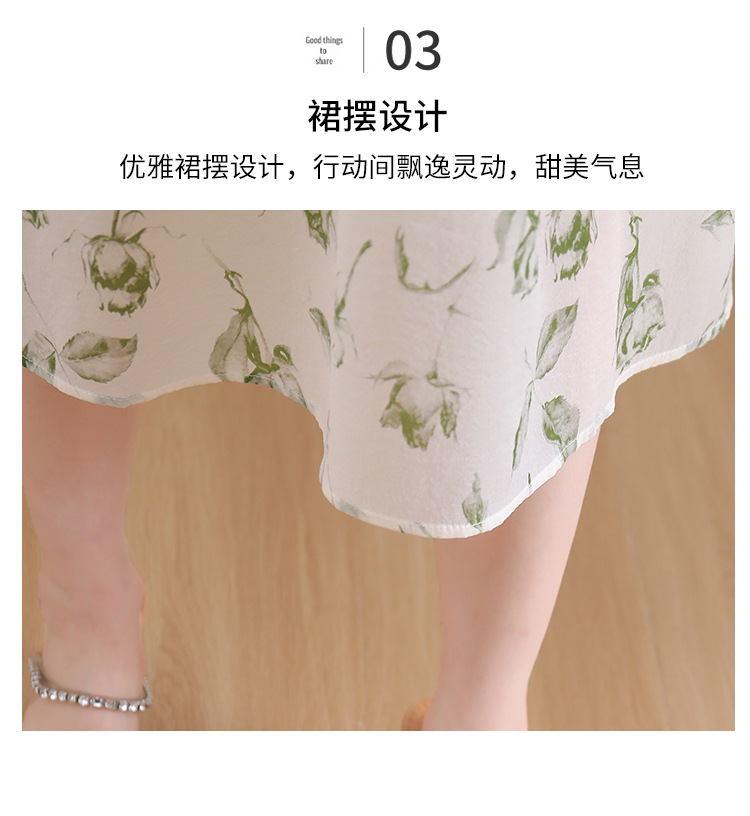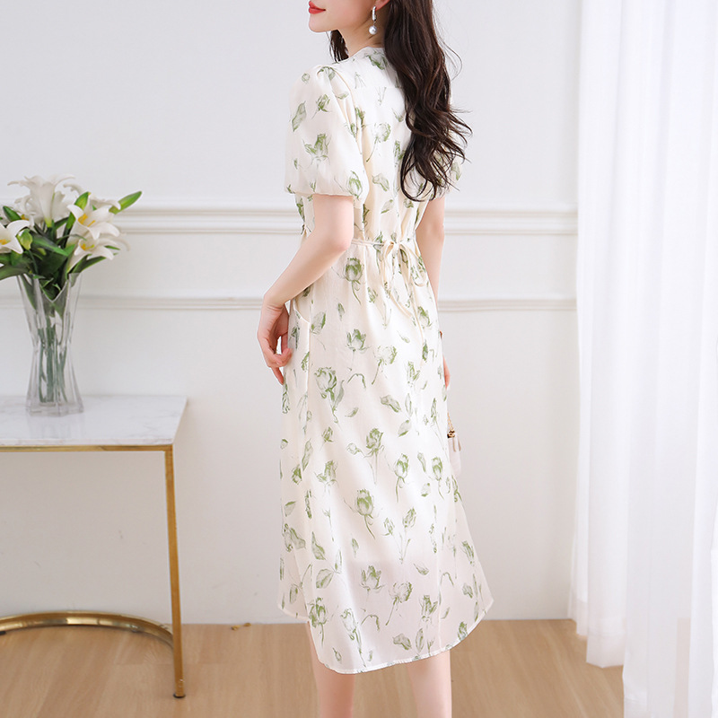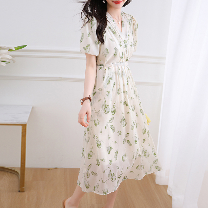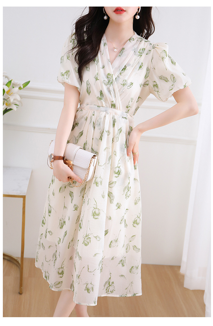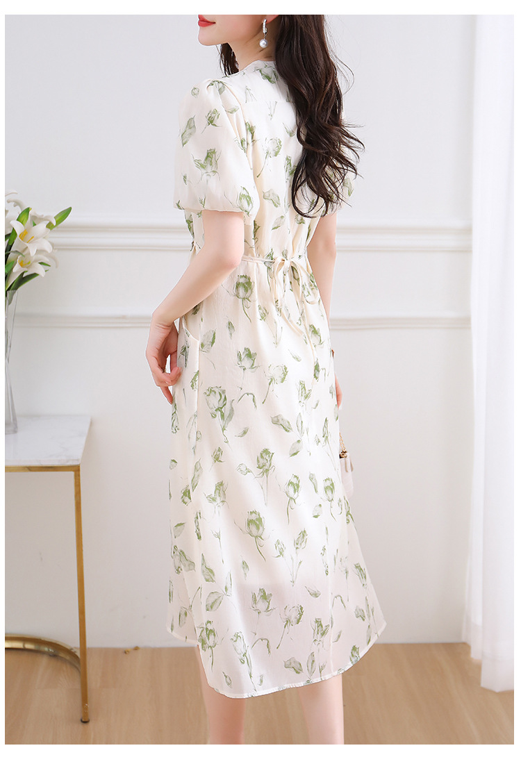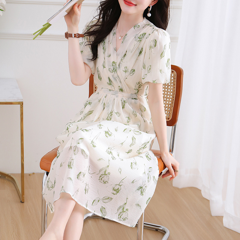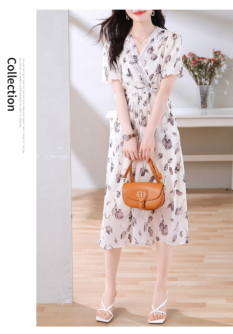 2023夏新款V领蝴蝶结系带收腰显瘦碎花文艺桔梗雪纺短袖连衣裙