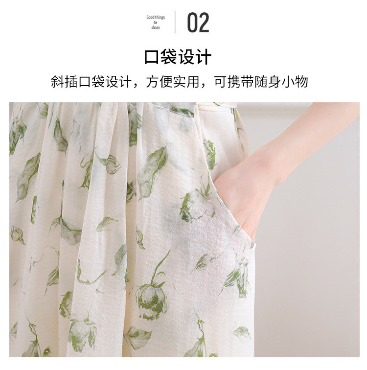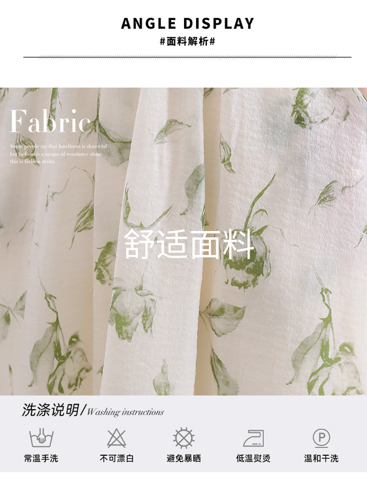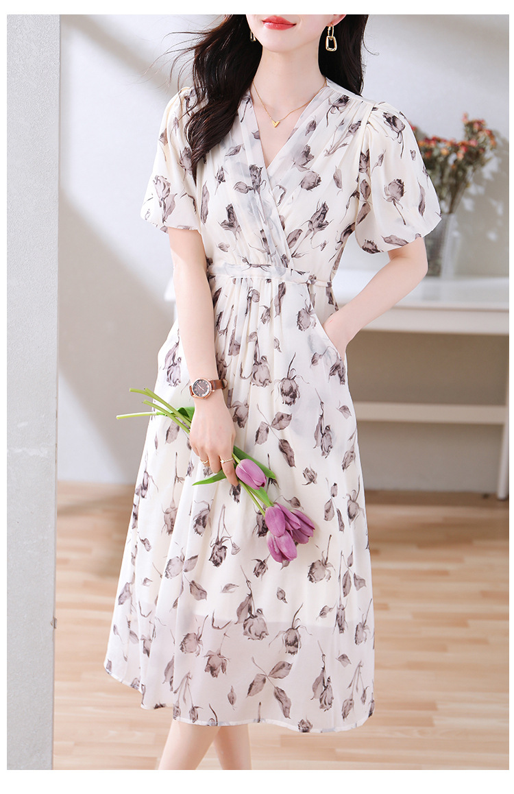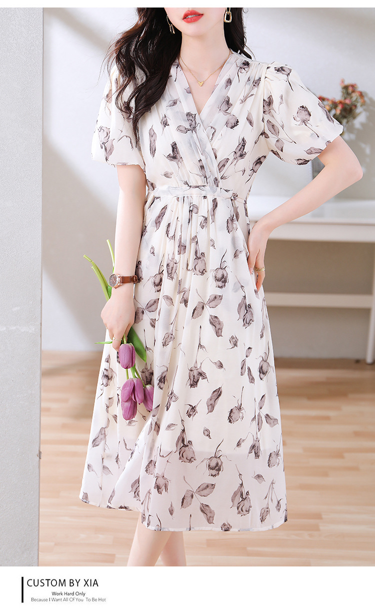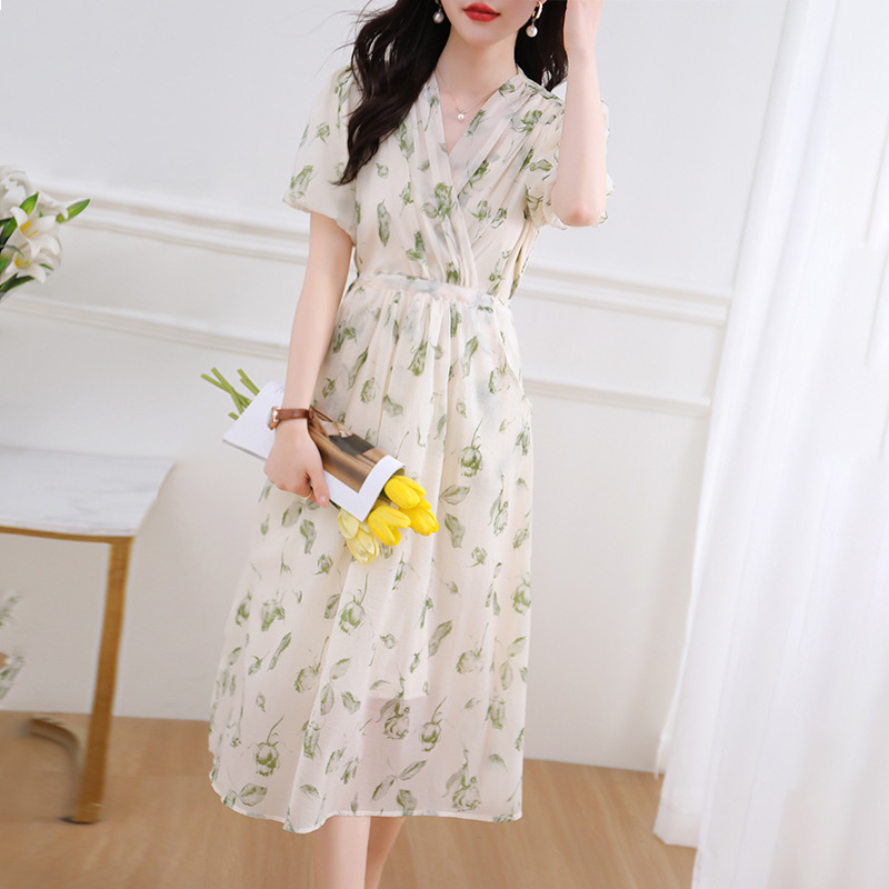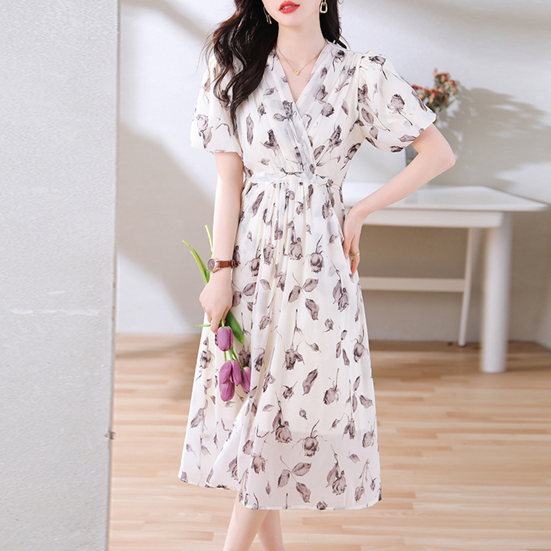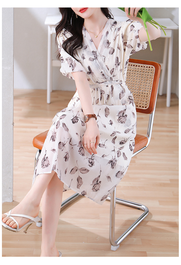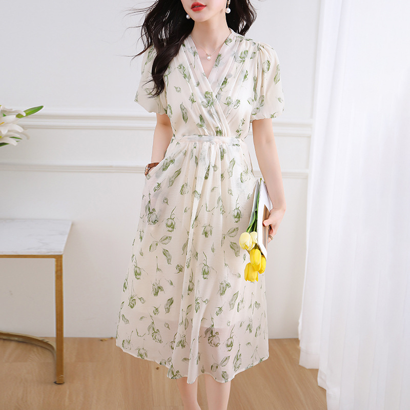 2023夏新款V领蝴蝶结系带收腰显瘦碎花文艺桔梗雪纺短袖连衣裙