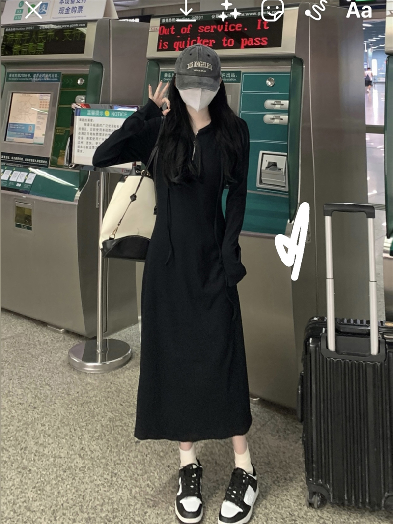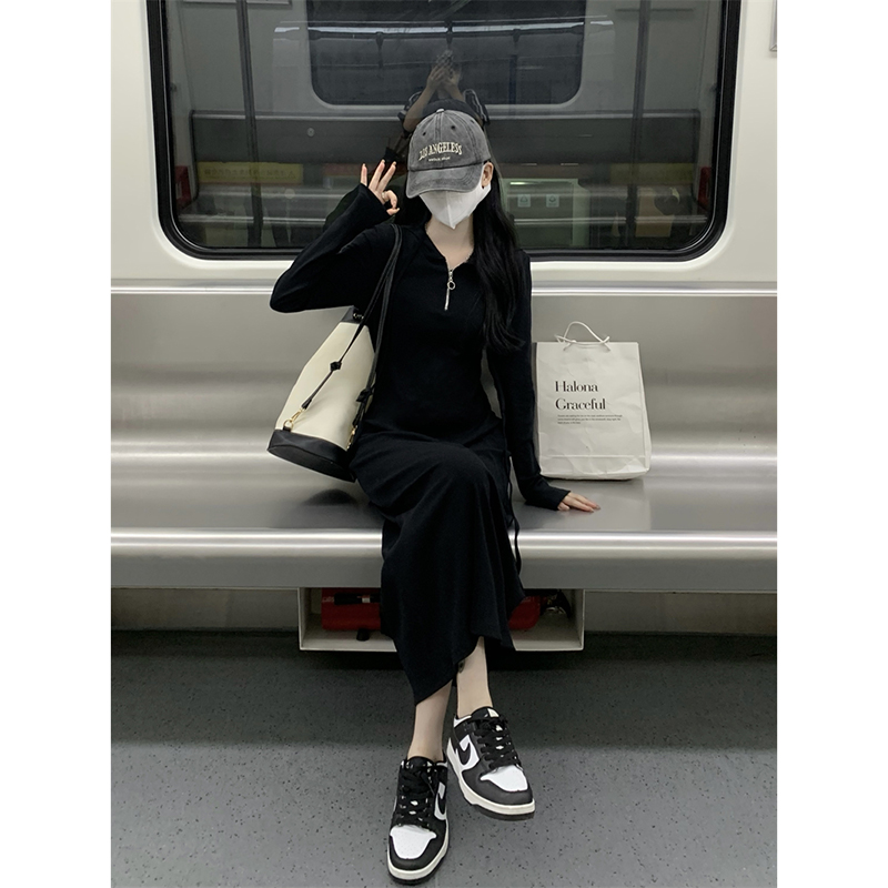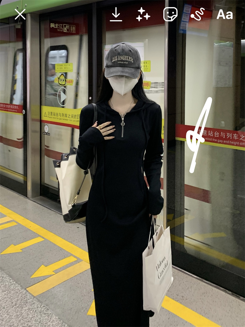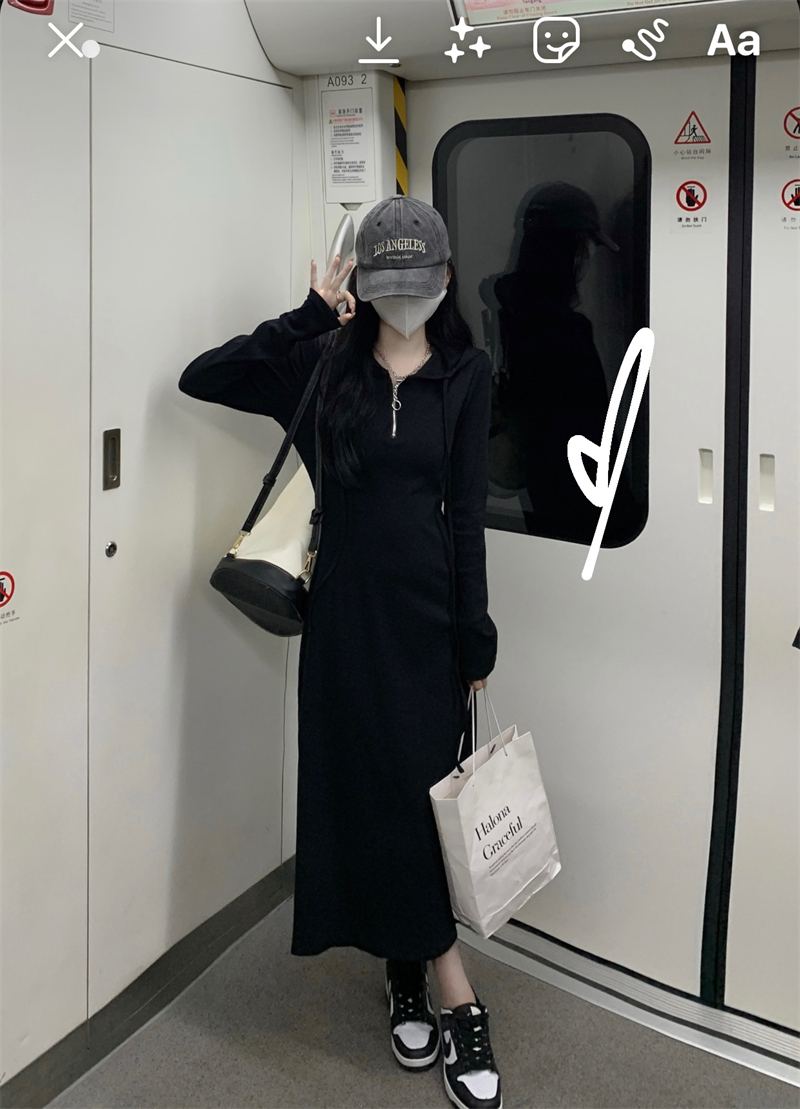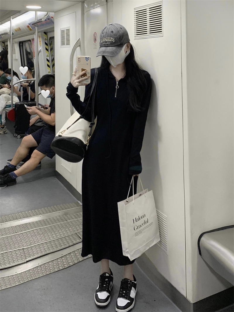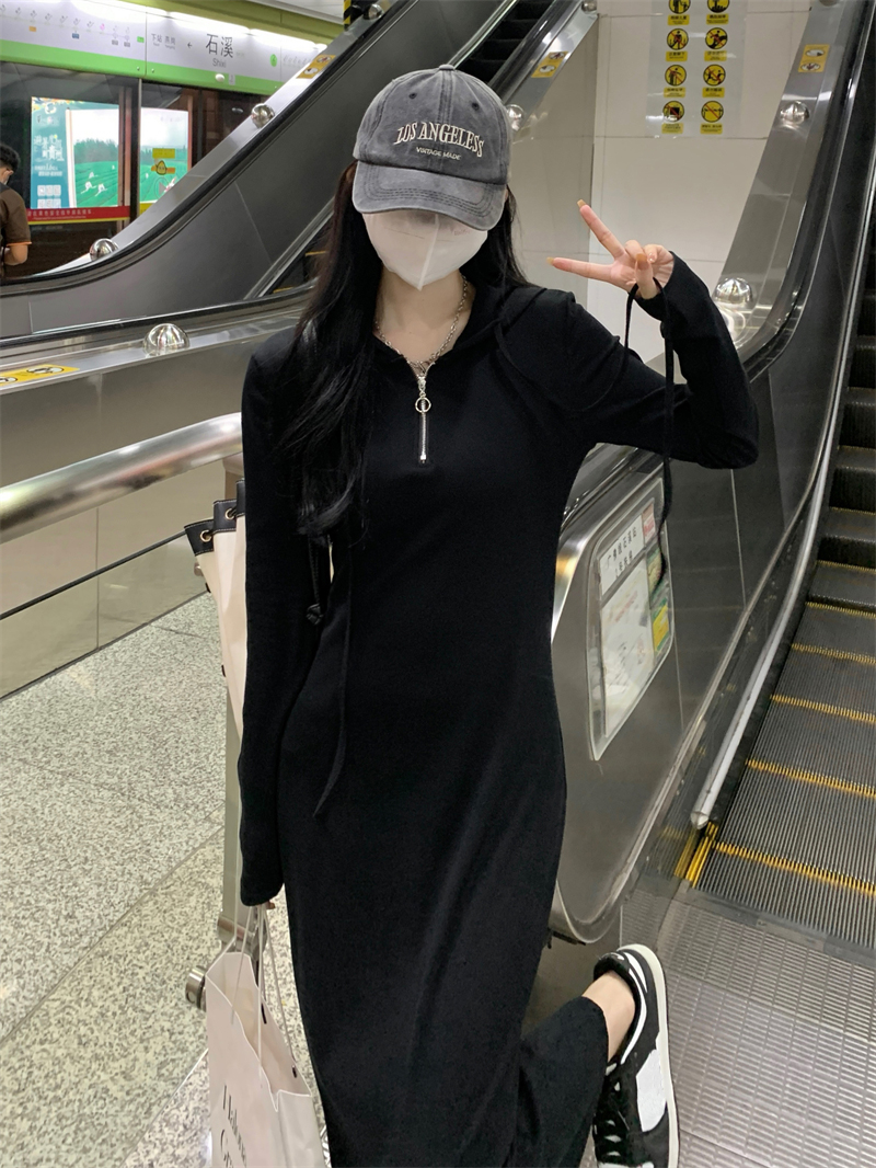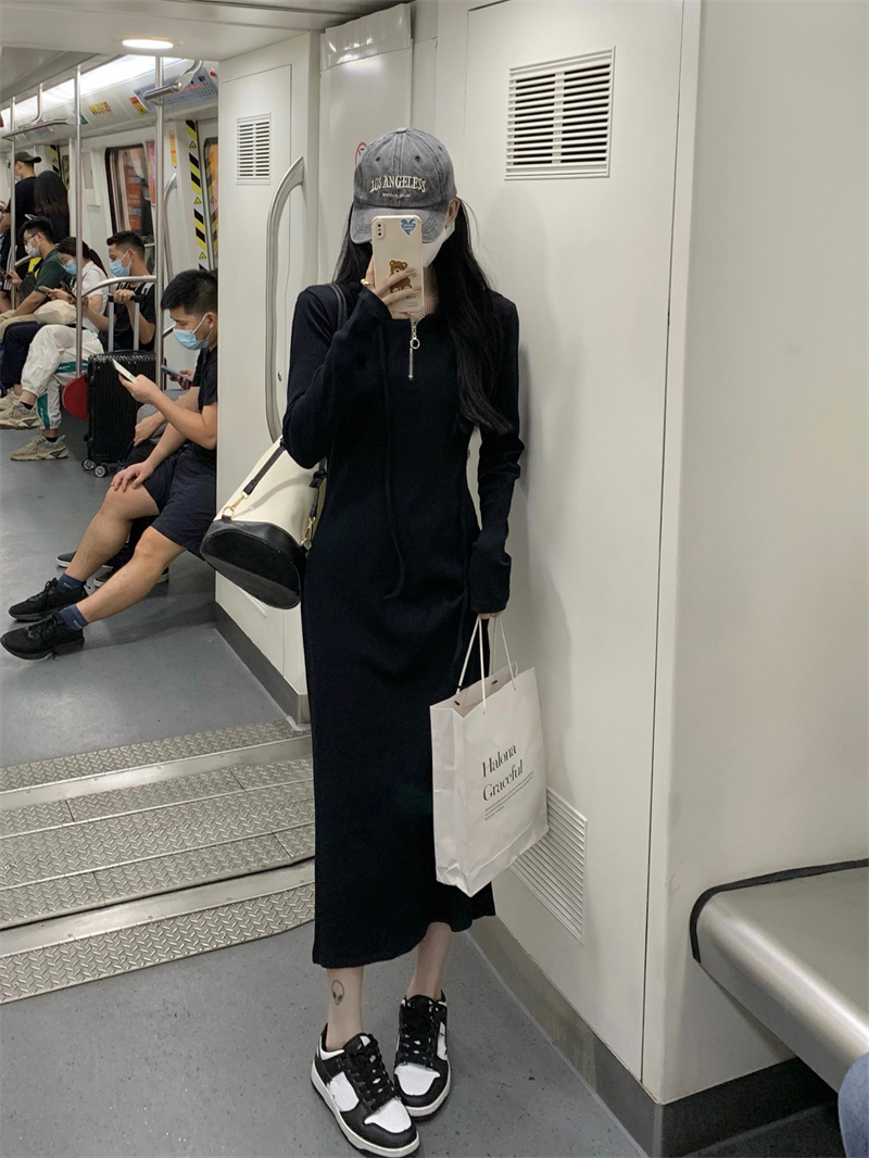 氣質黑色連帽針織洋裝秋季2023新款設計感修身高腰打底中長裙女