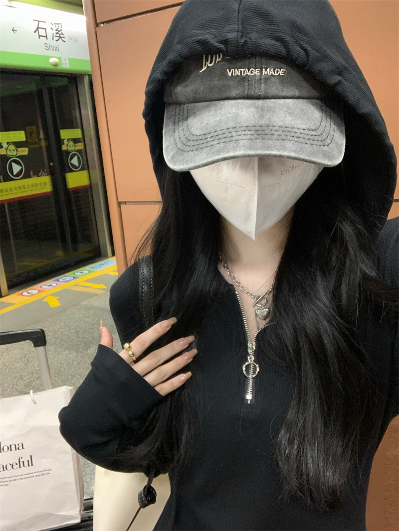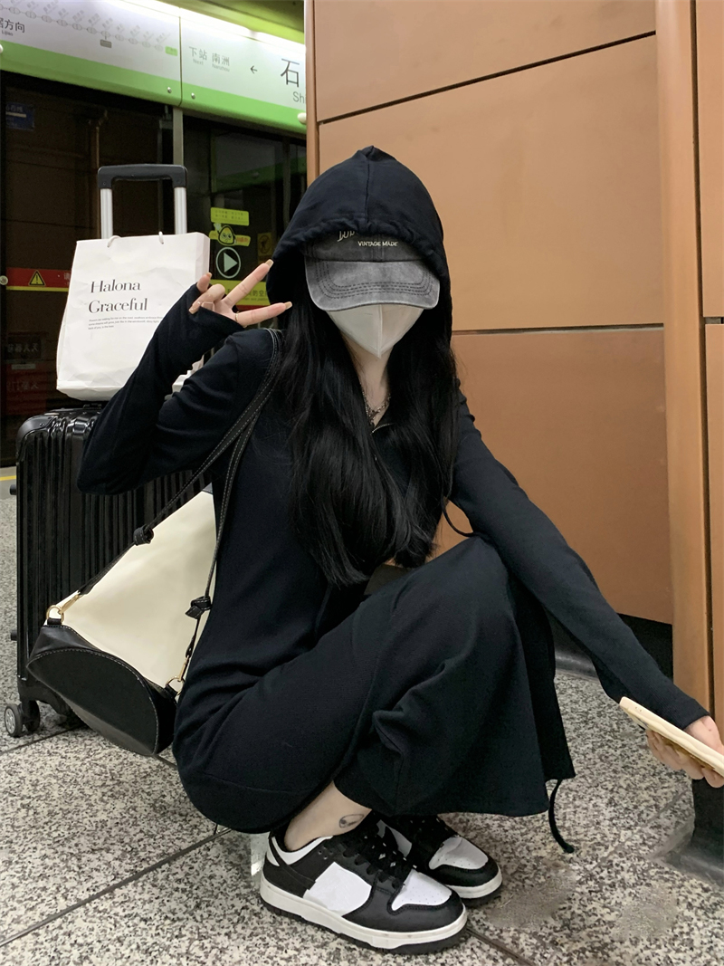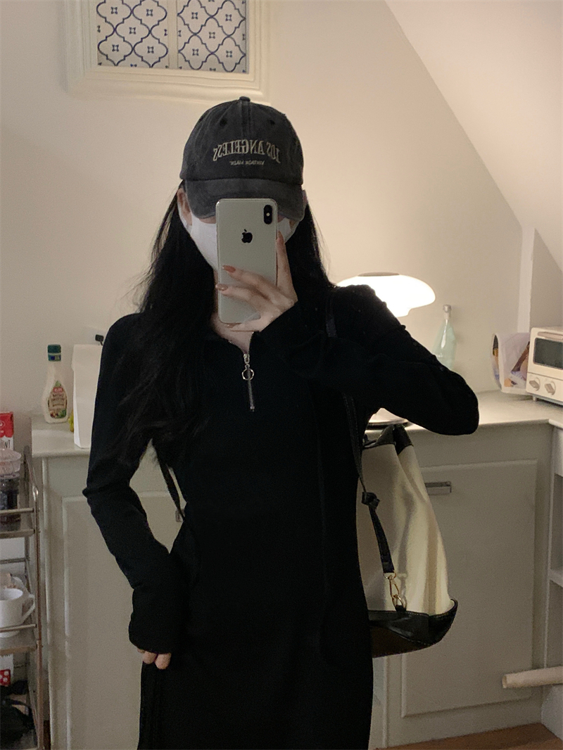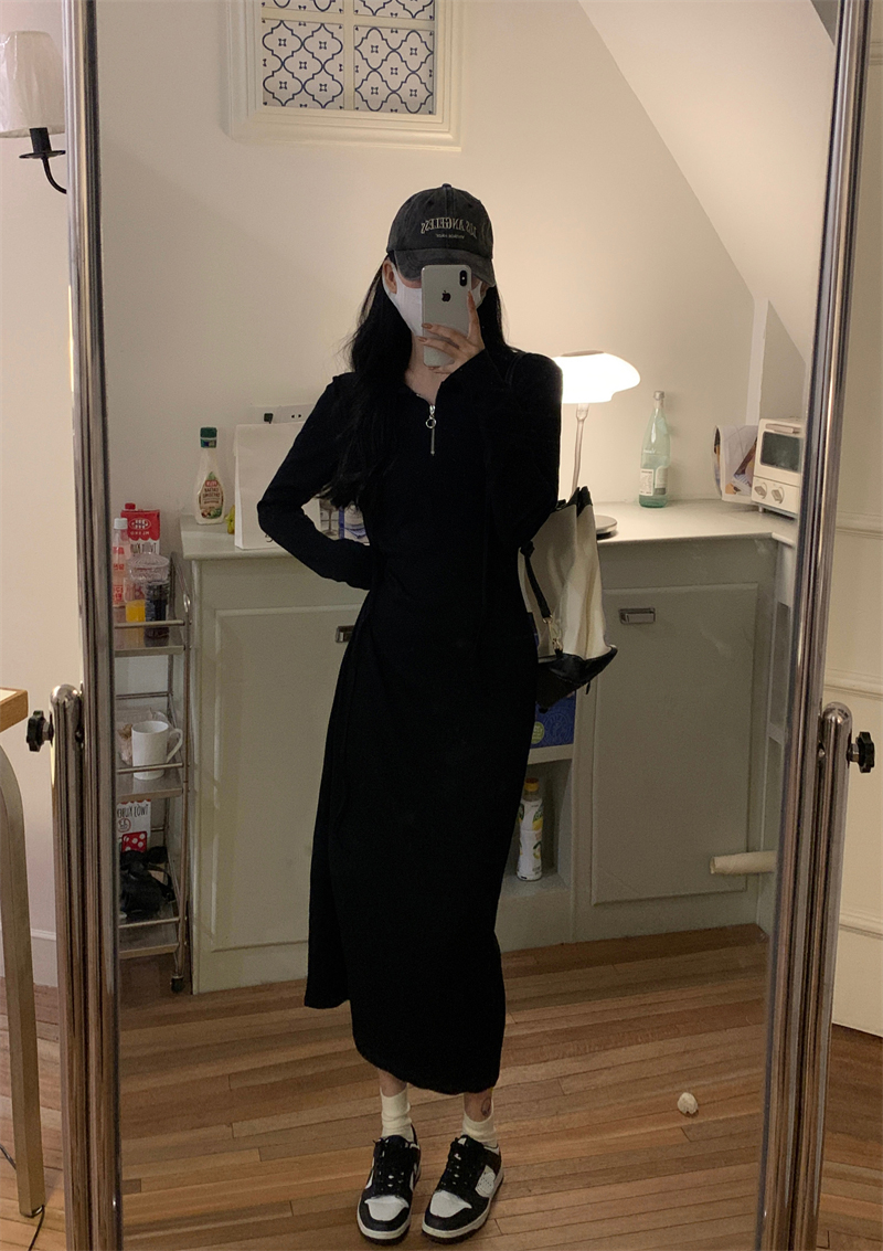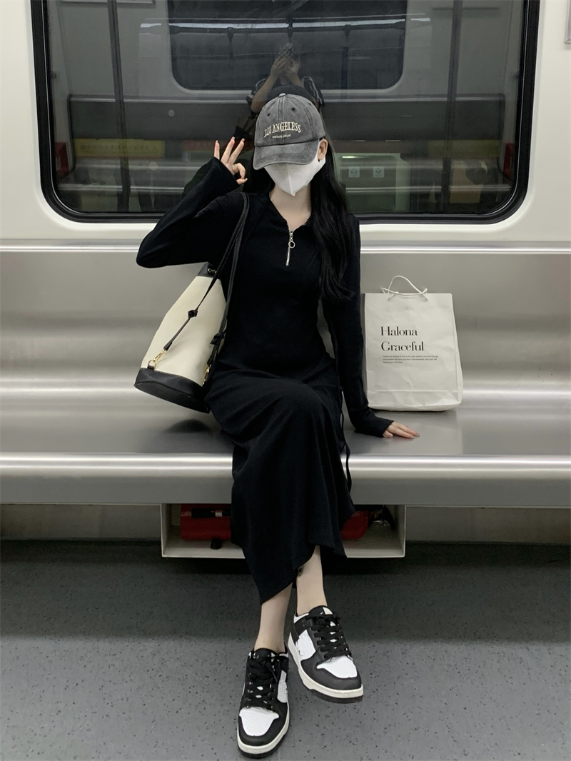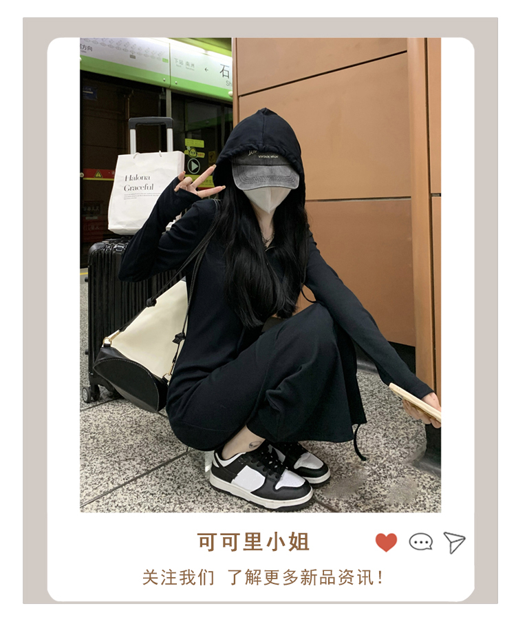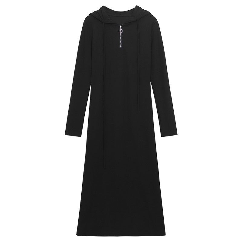 氣質黑色連帽針織洋裝秋季2023新款設計感修身高腰打底中長裙女
