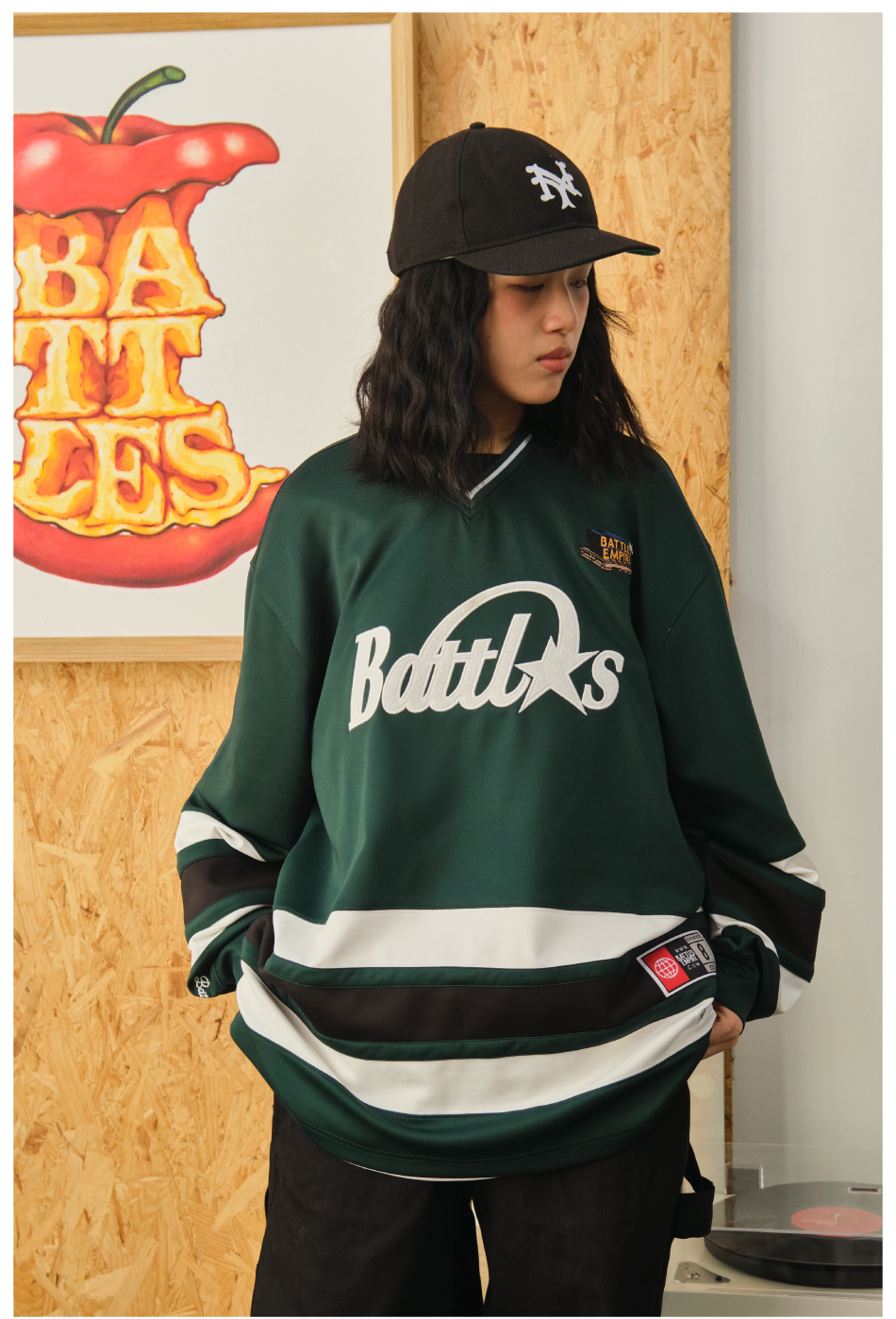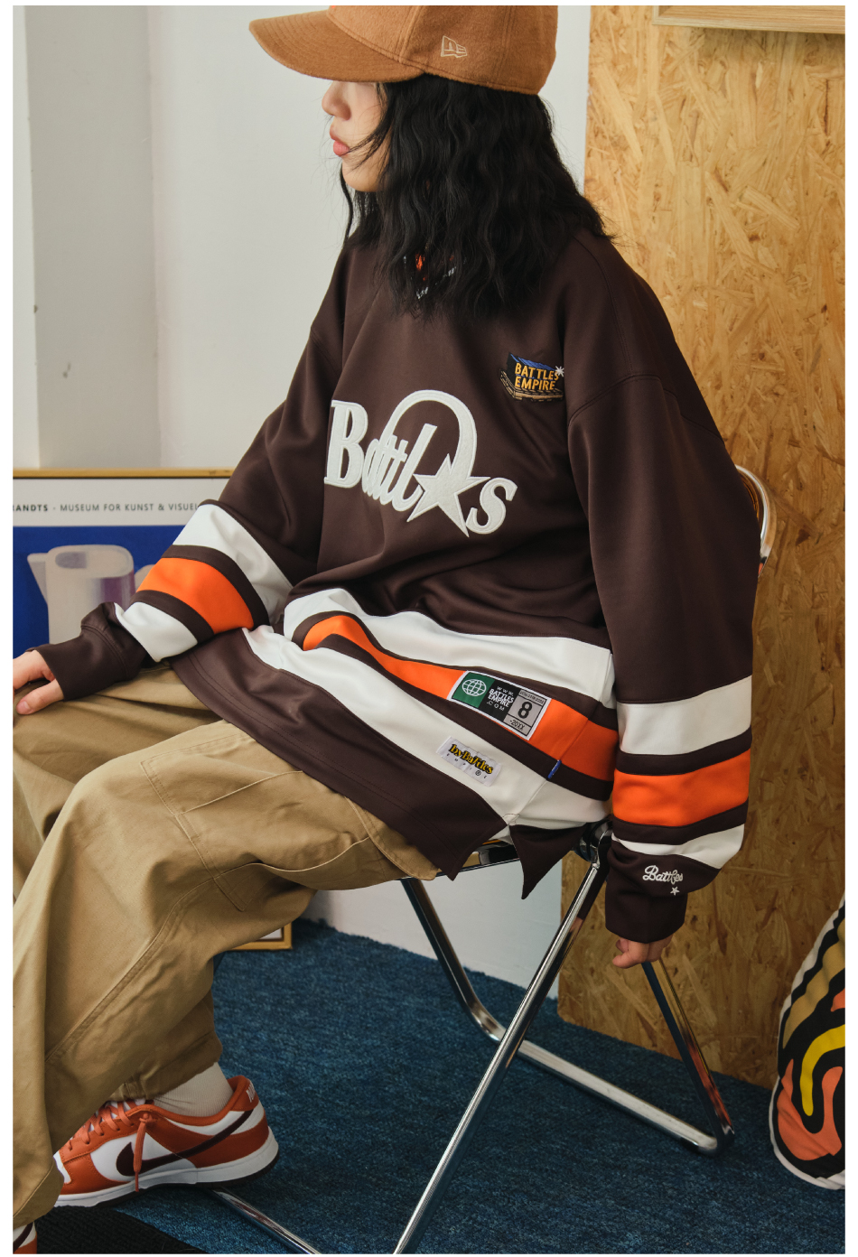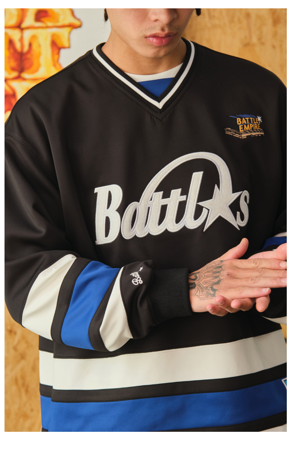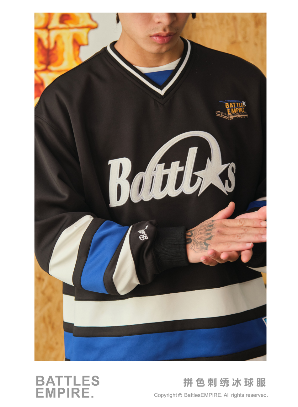 Battles秋冬美式復古重工刺繡梭織運動冰球服街頭寬鬆休閒長袖T恤