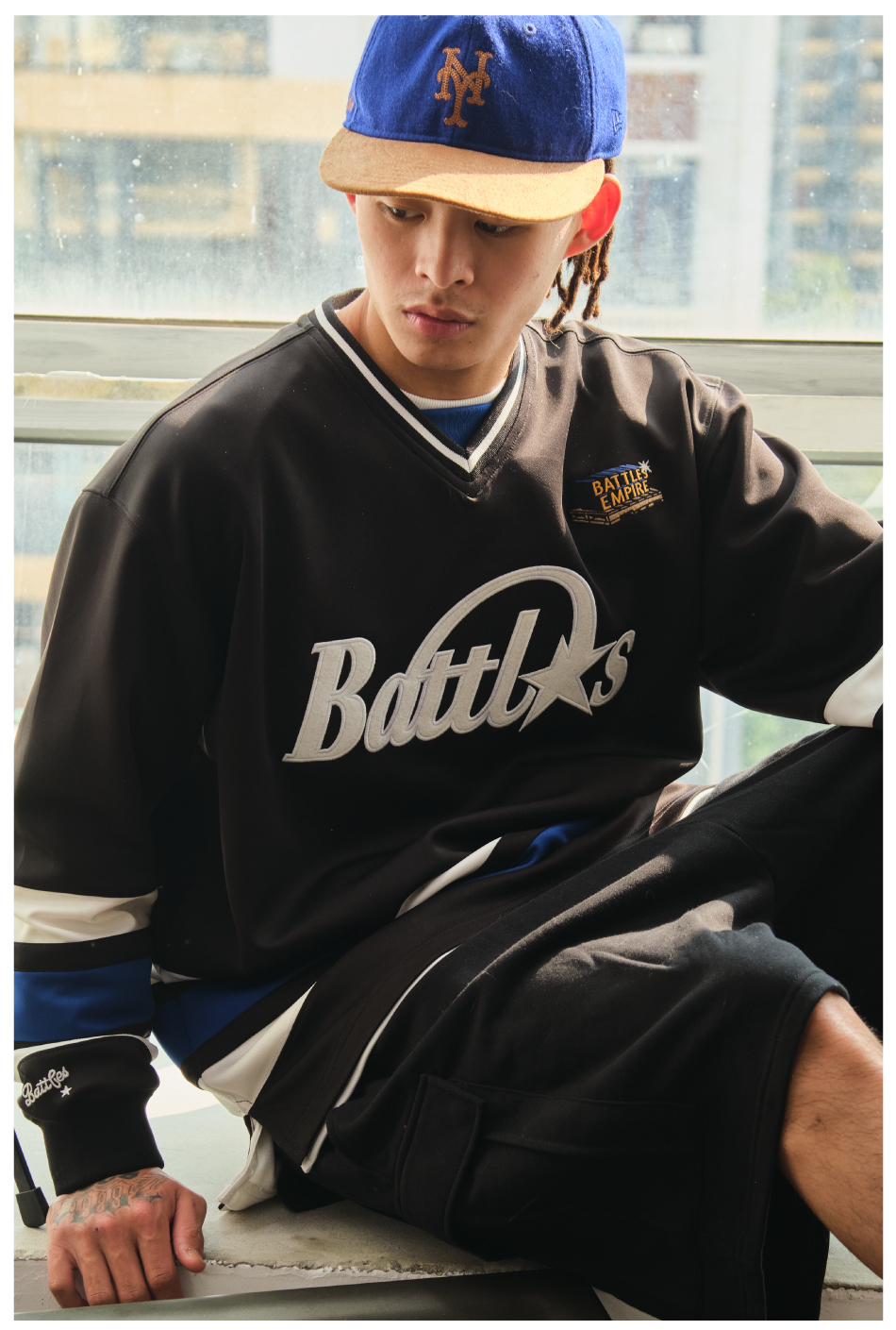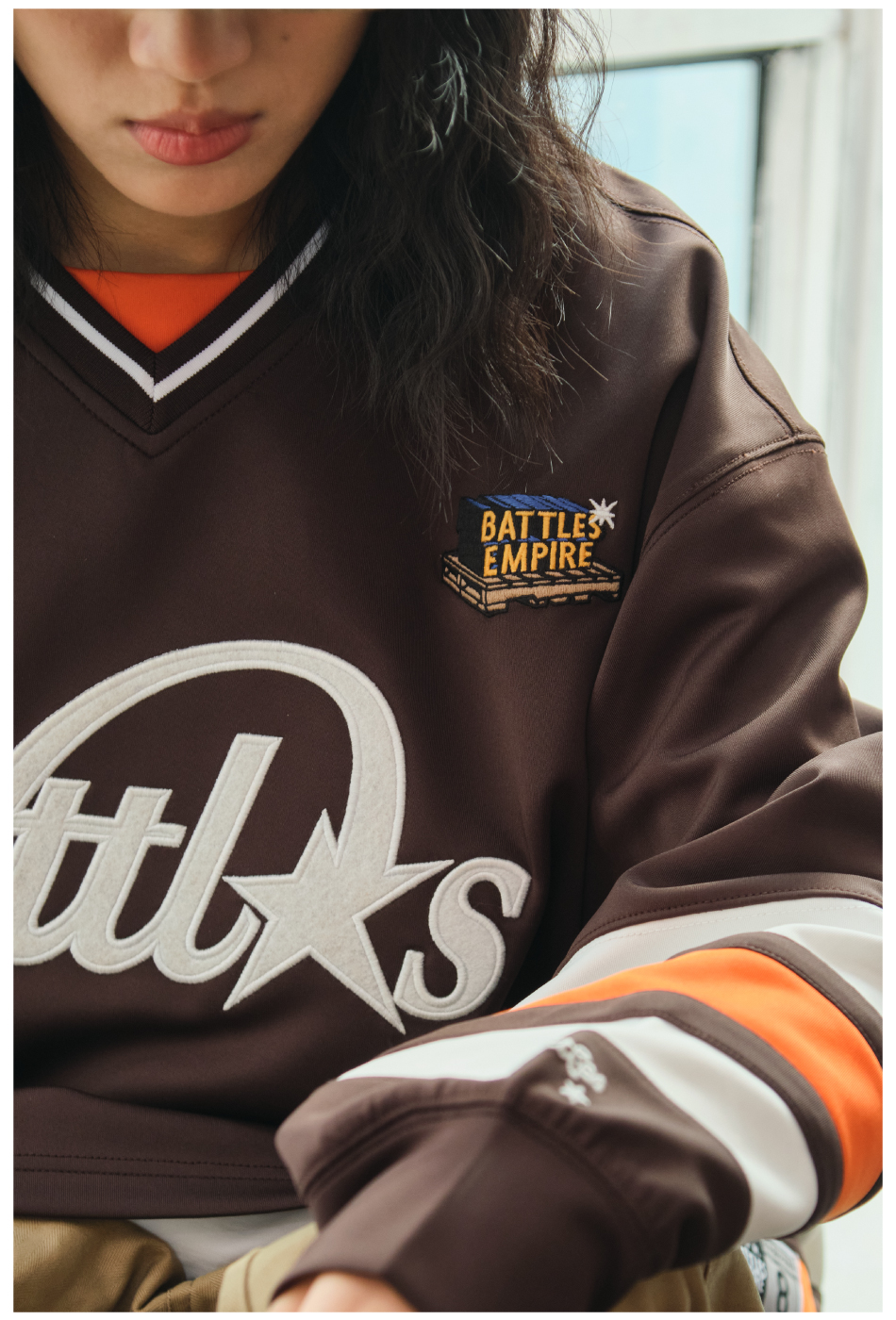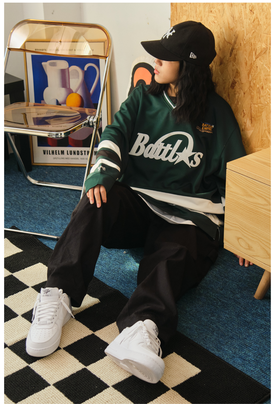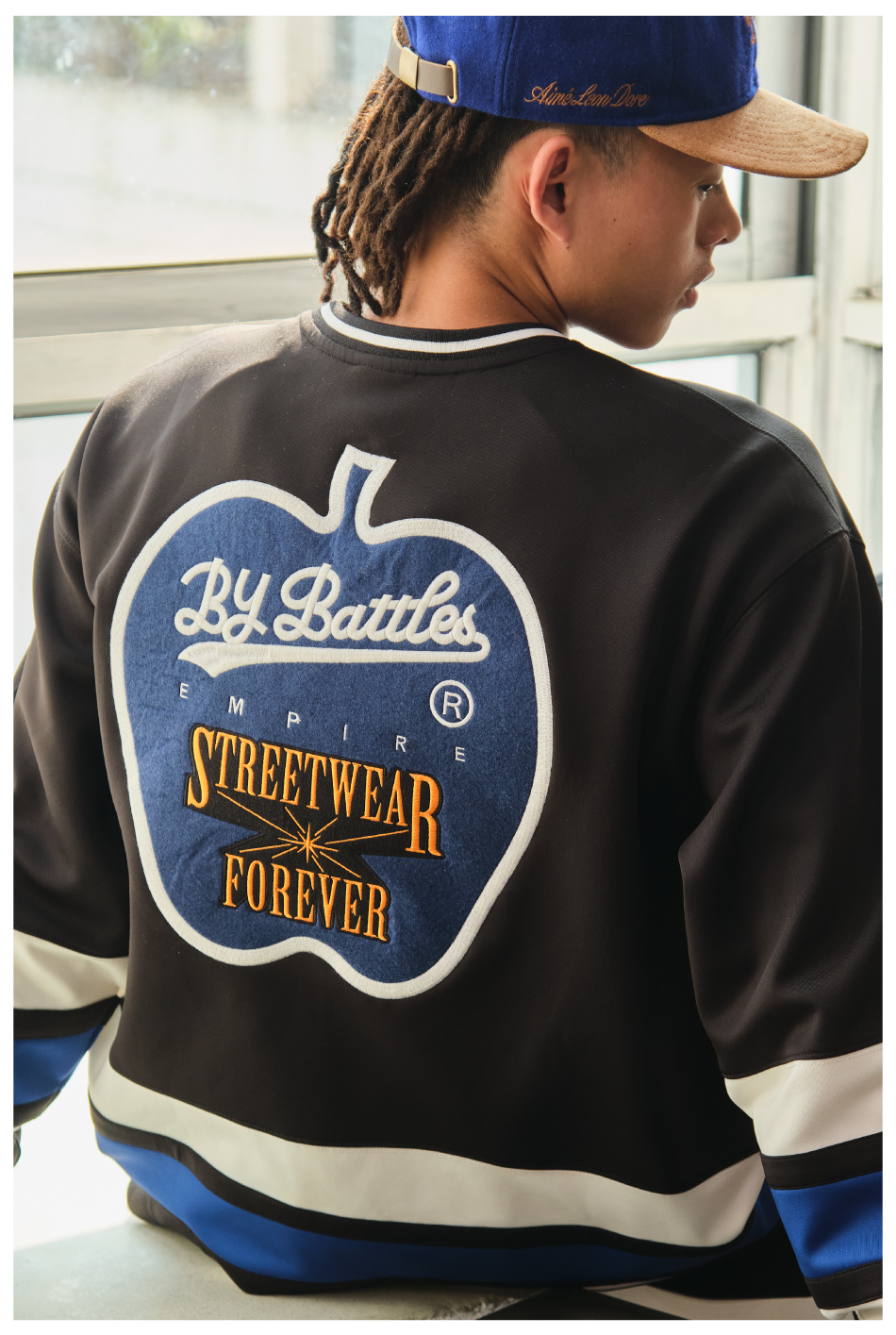 Battles秋冬美式復古重工刺繡梭織運動冰球服街頭寬鬆休閒長袖T恤