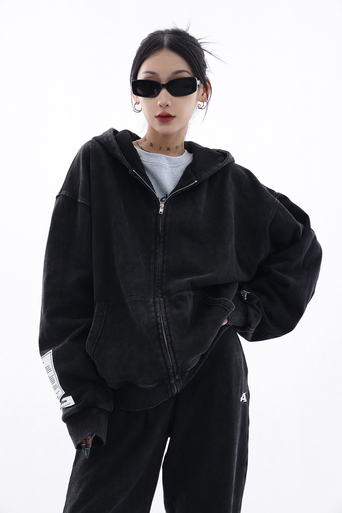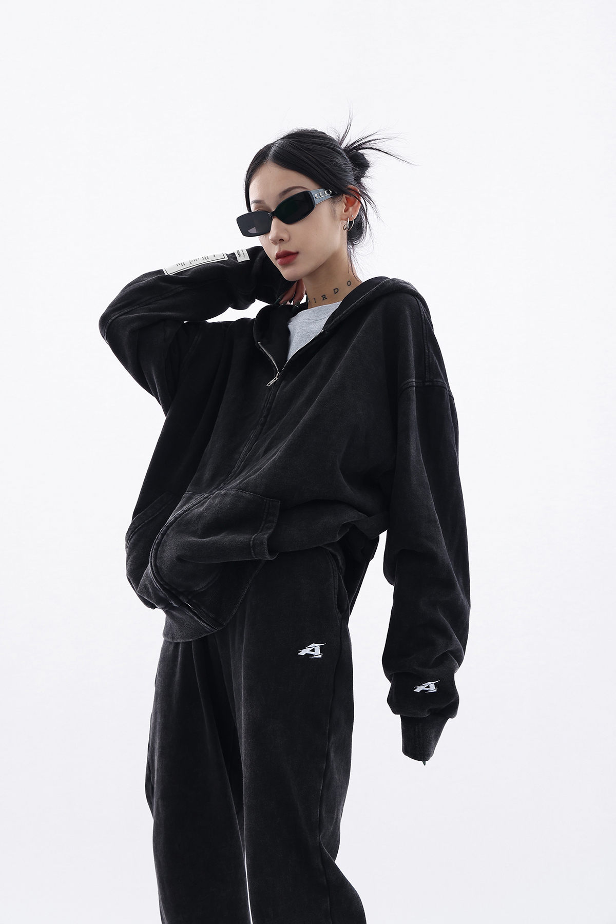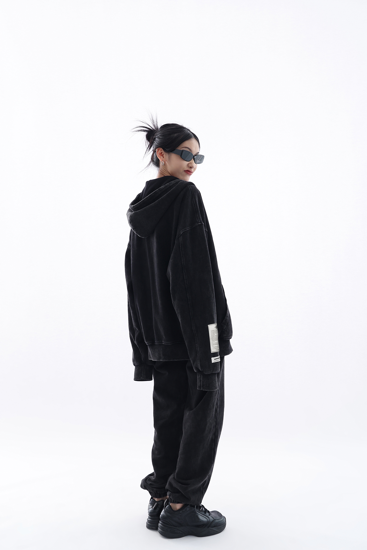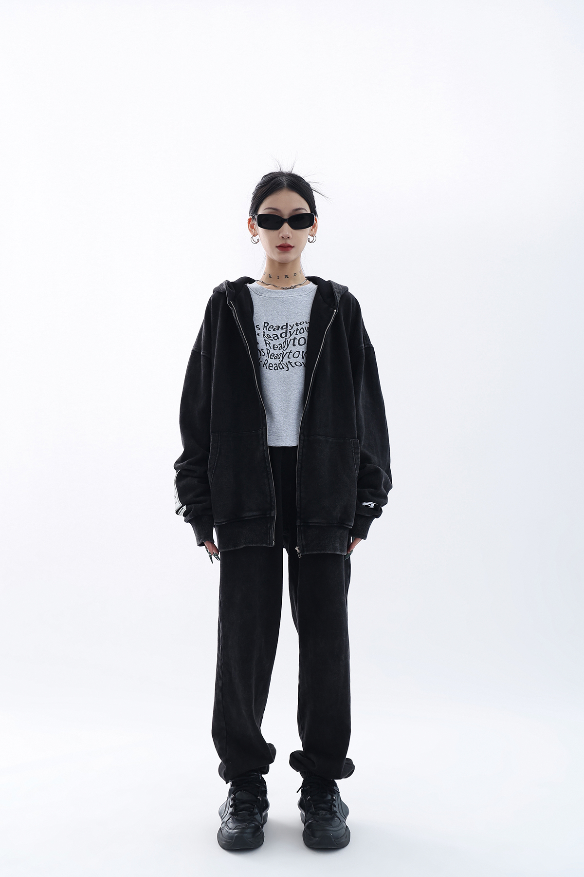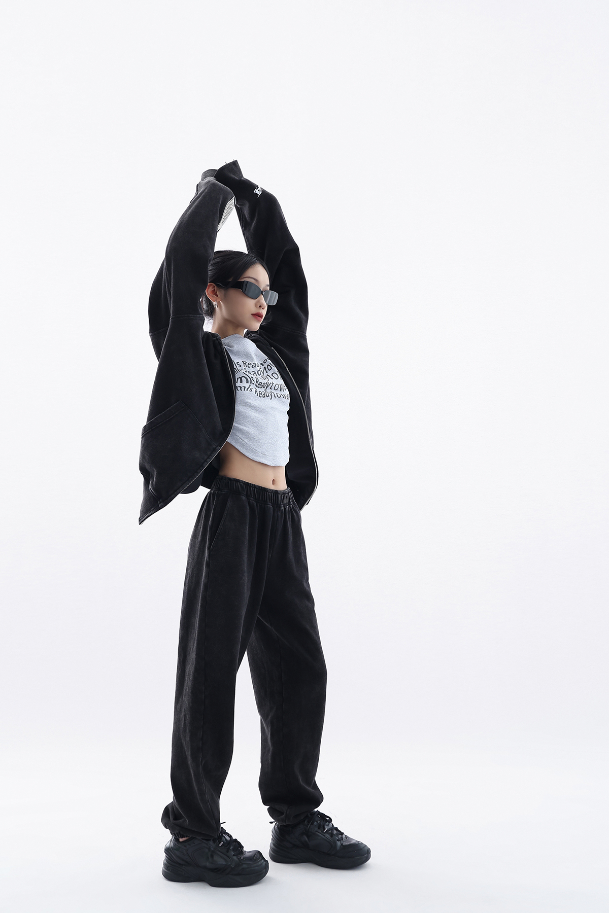 Acestudios 洗水炒色黑色開衫厚棉T+衛褲2件套女2023秋季新款套裝