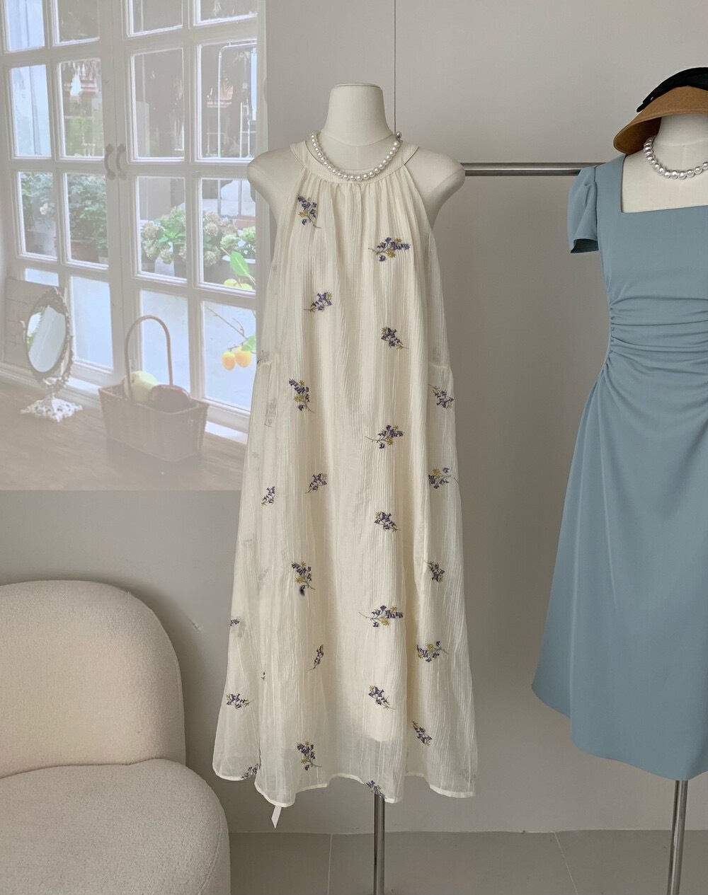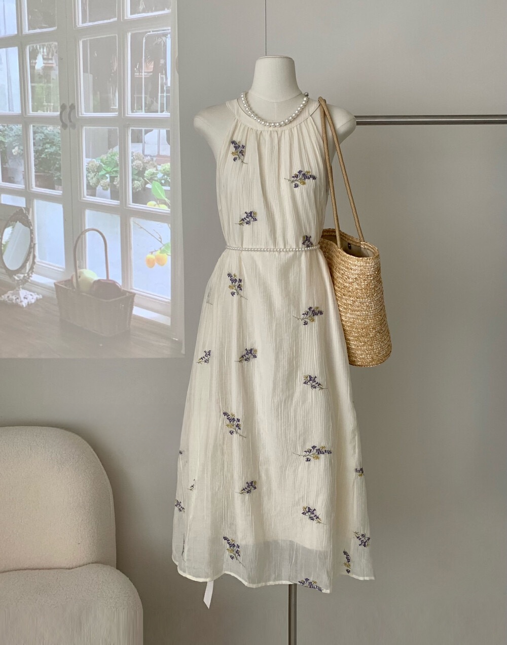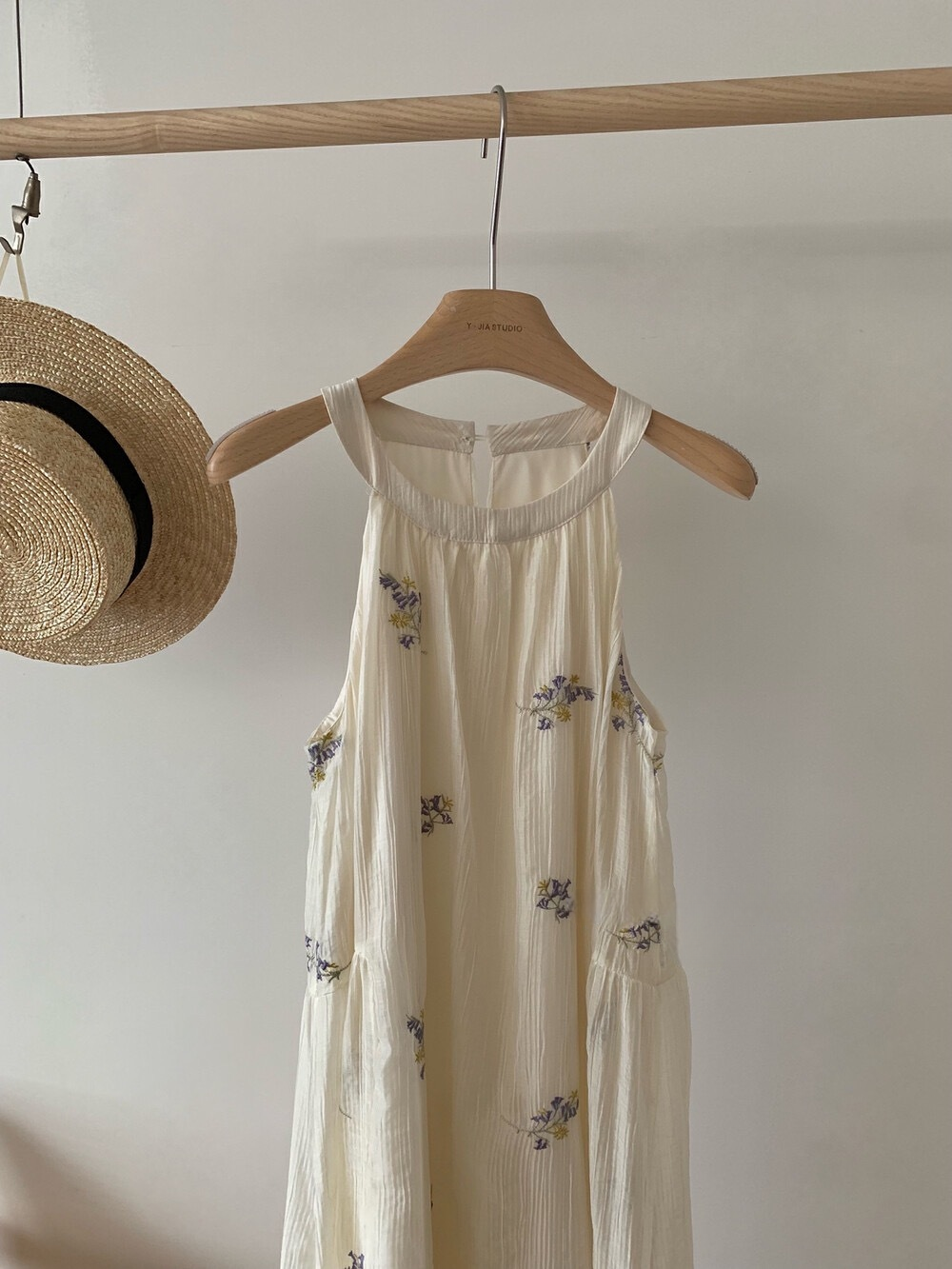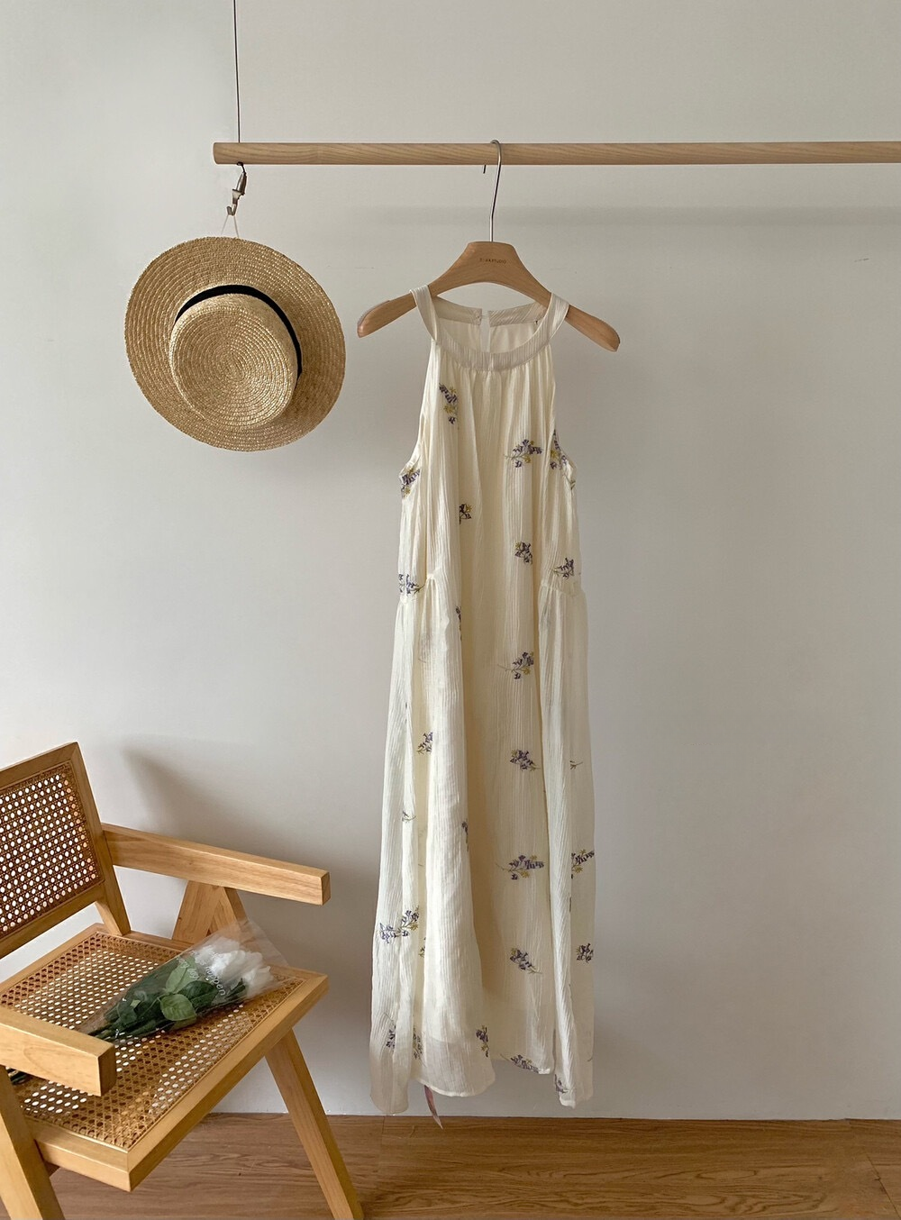 宛宛類卿 鈴蘭花刺繡掛頸洋裝女度假海邊無袖長裙