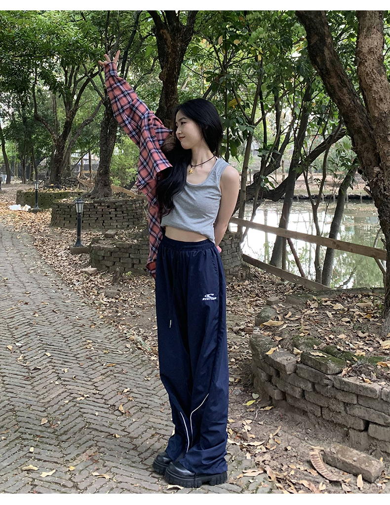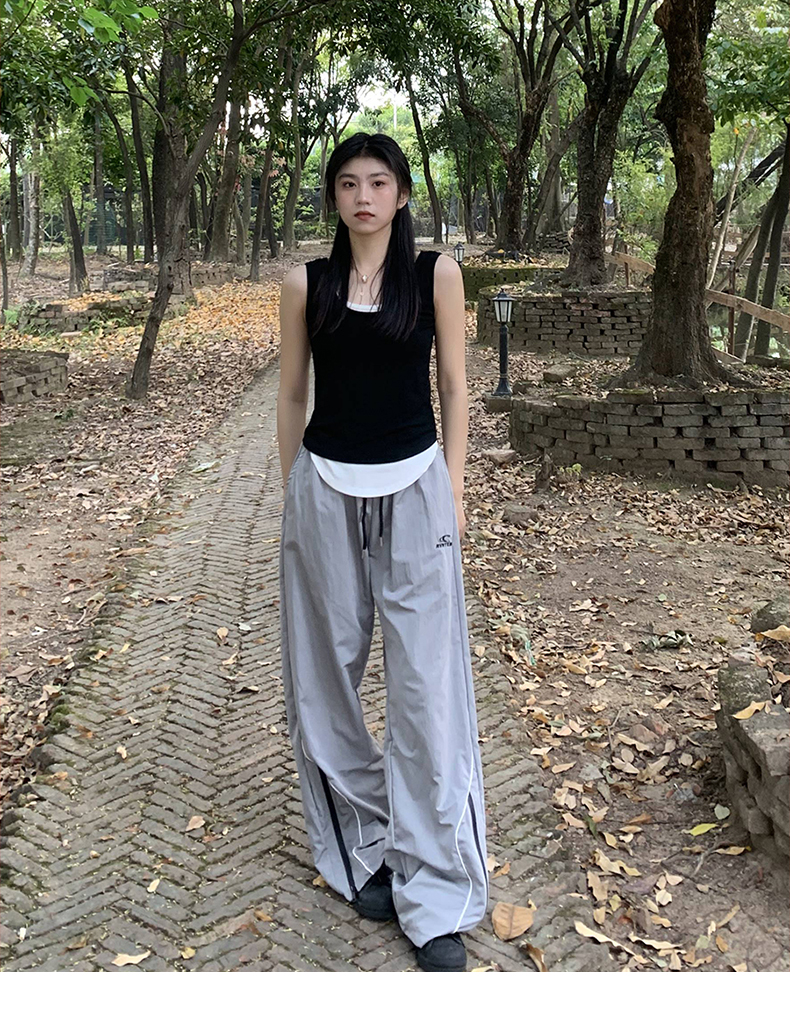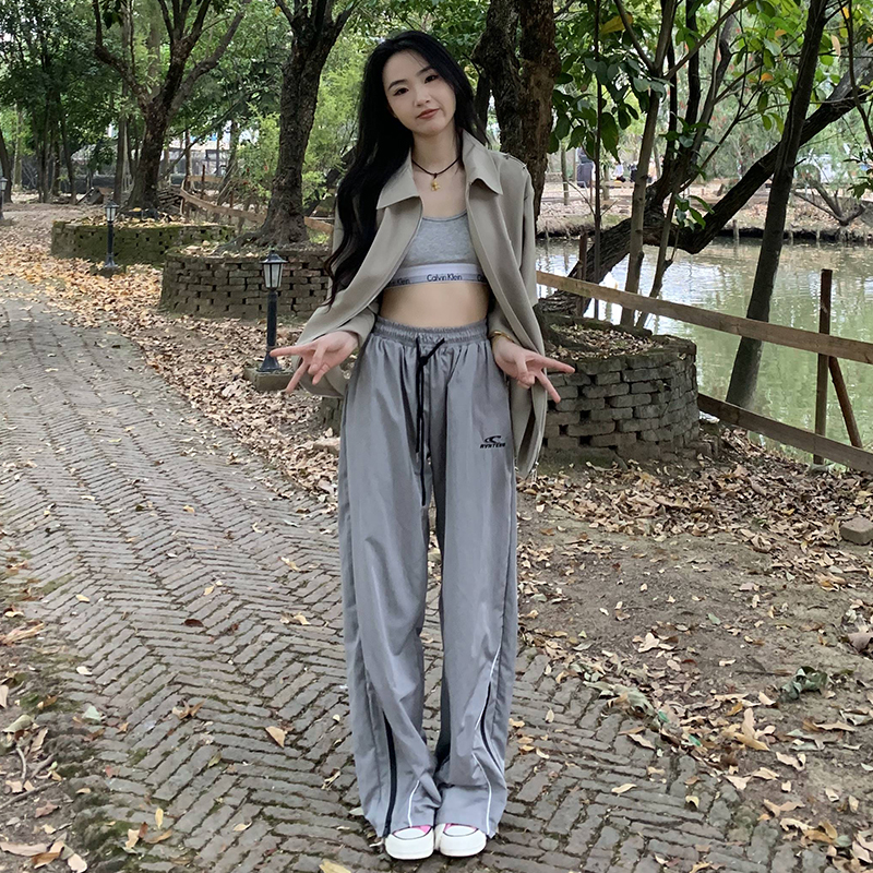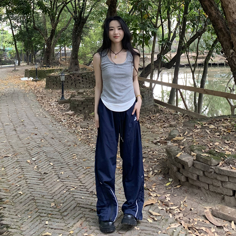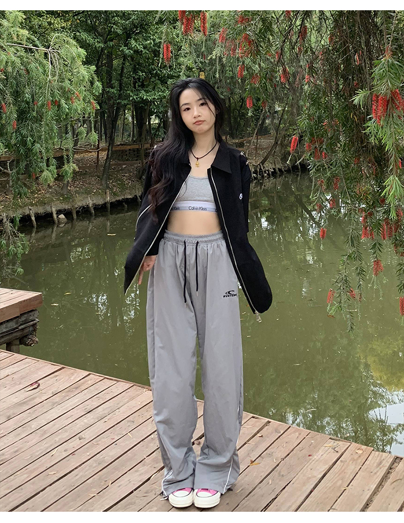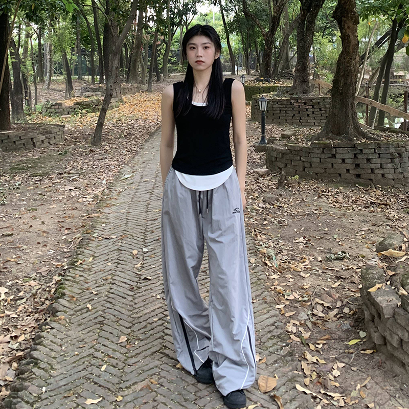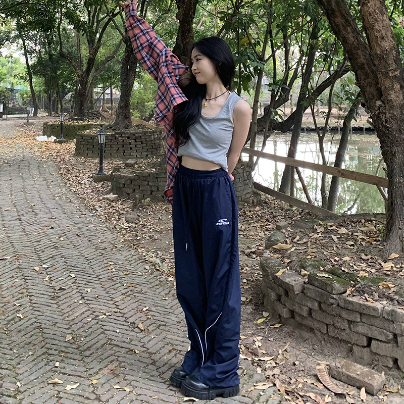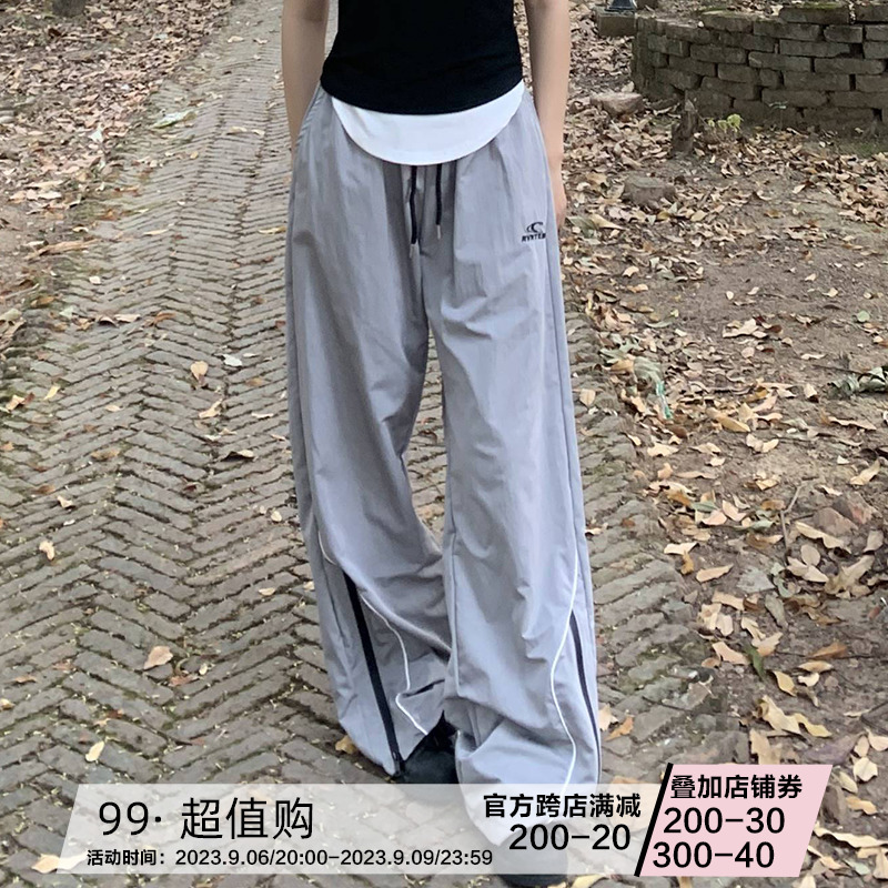 橘子樹在哪兒美式復古運動褲女春秋寬鬆抽繩設計感高街闊腿拖地褲