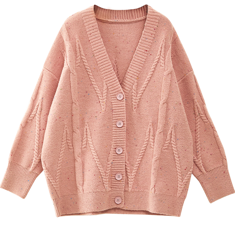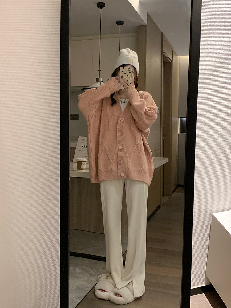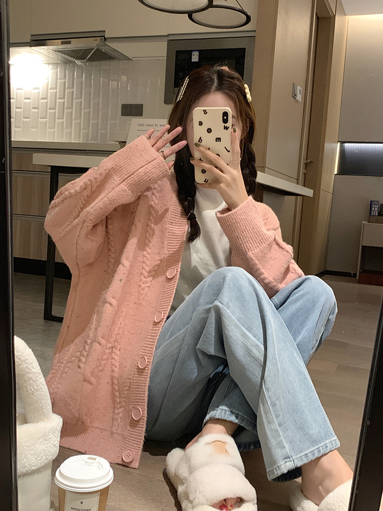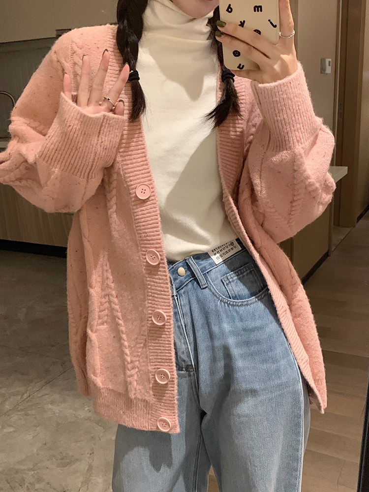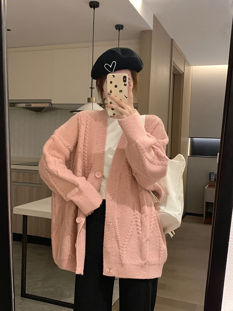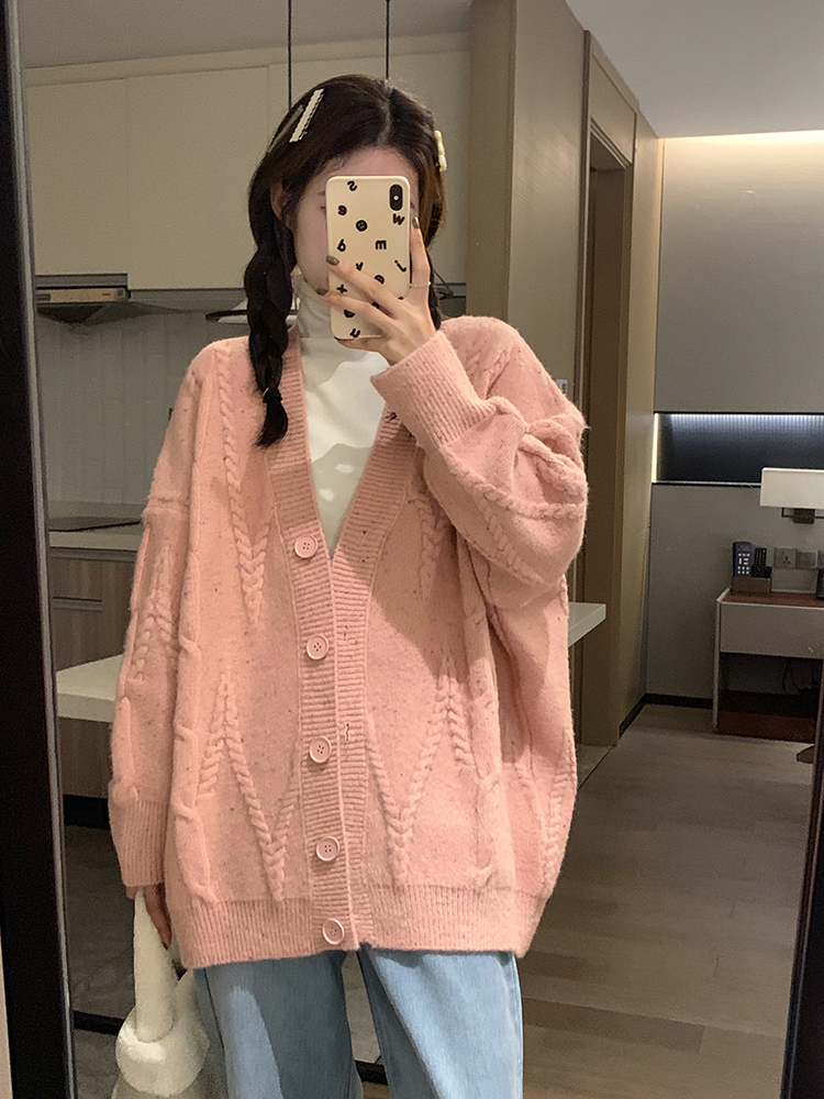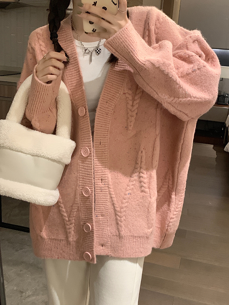 OKJJ粉色毛衣開衫女2023年秋季新款寬鬆慵懶風外套韓版V領針織衫
