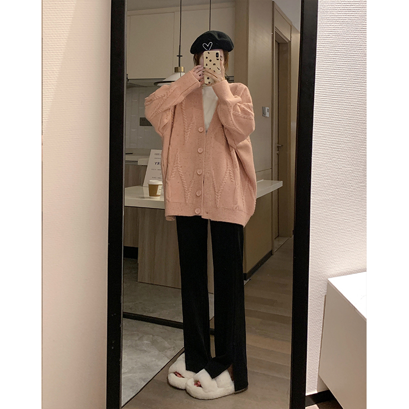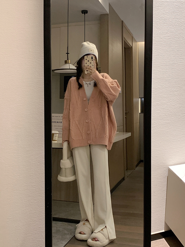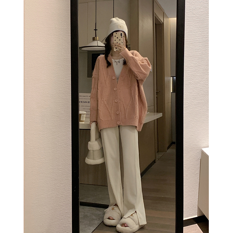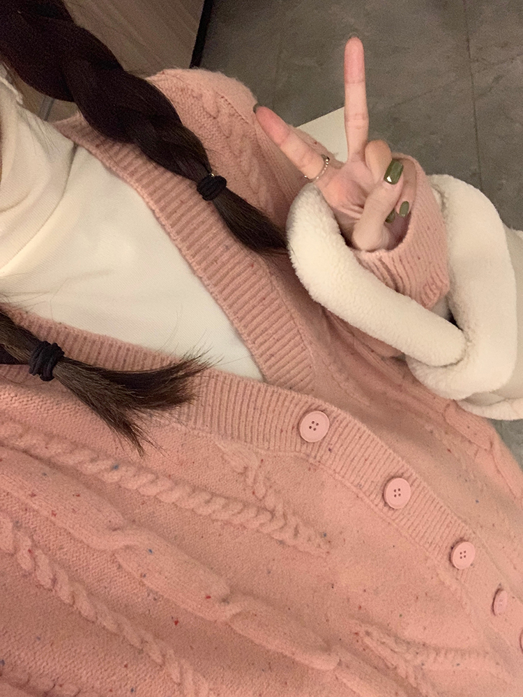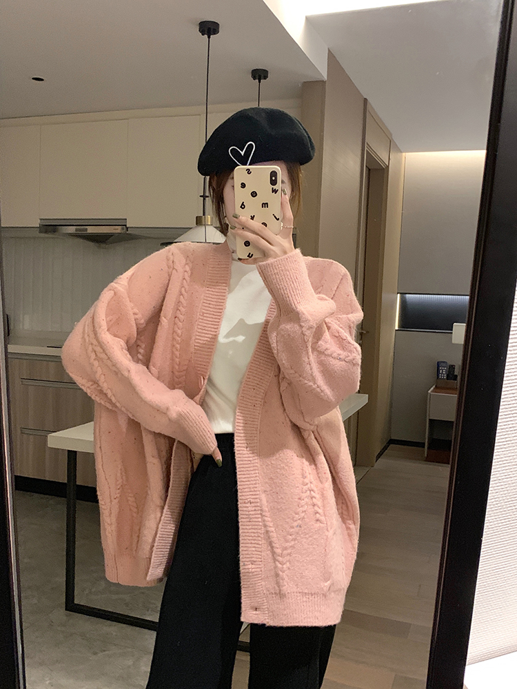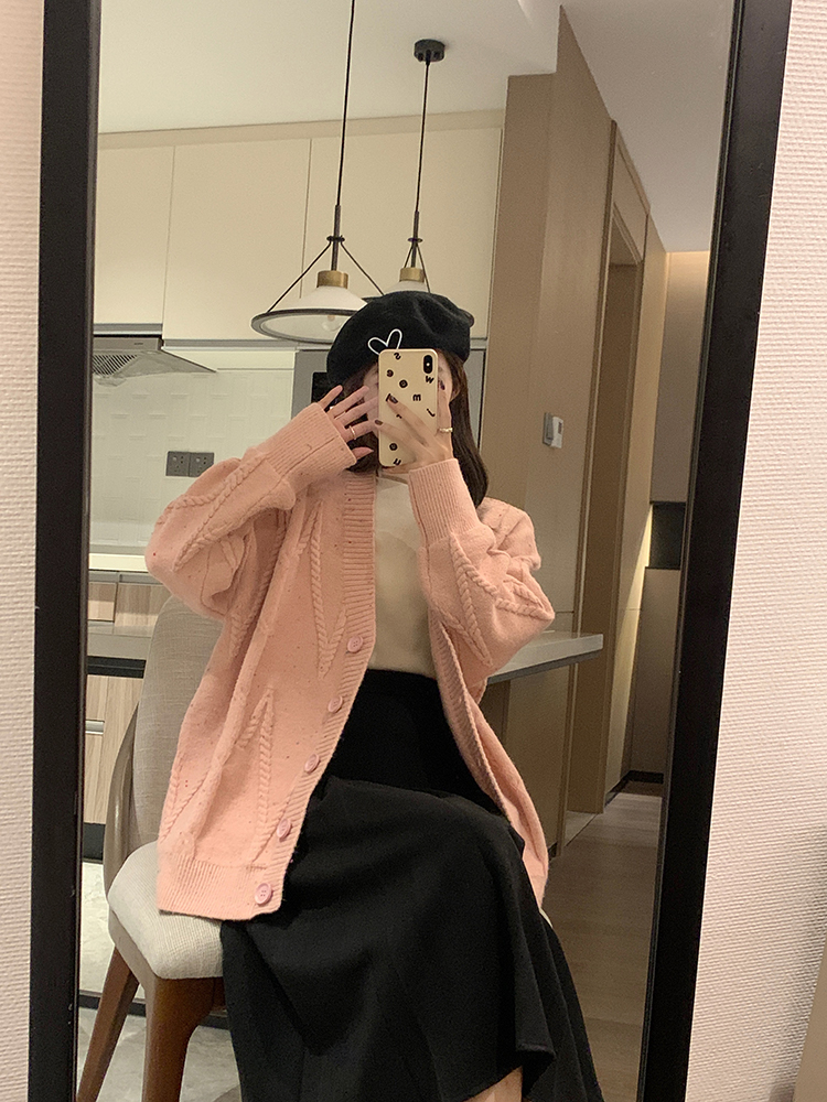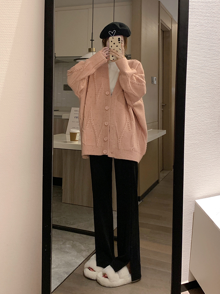 OKJJ粉色毛衣開衫女2023年秋季新款寬鬆慵懶風外套韓版V領針織衫