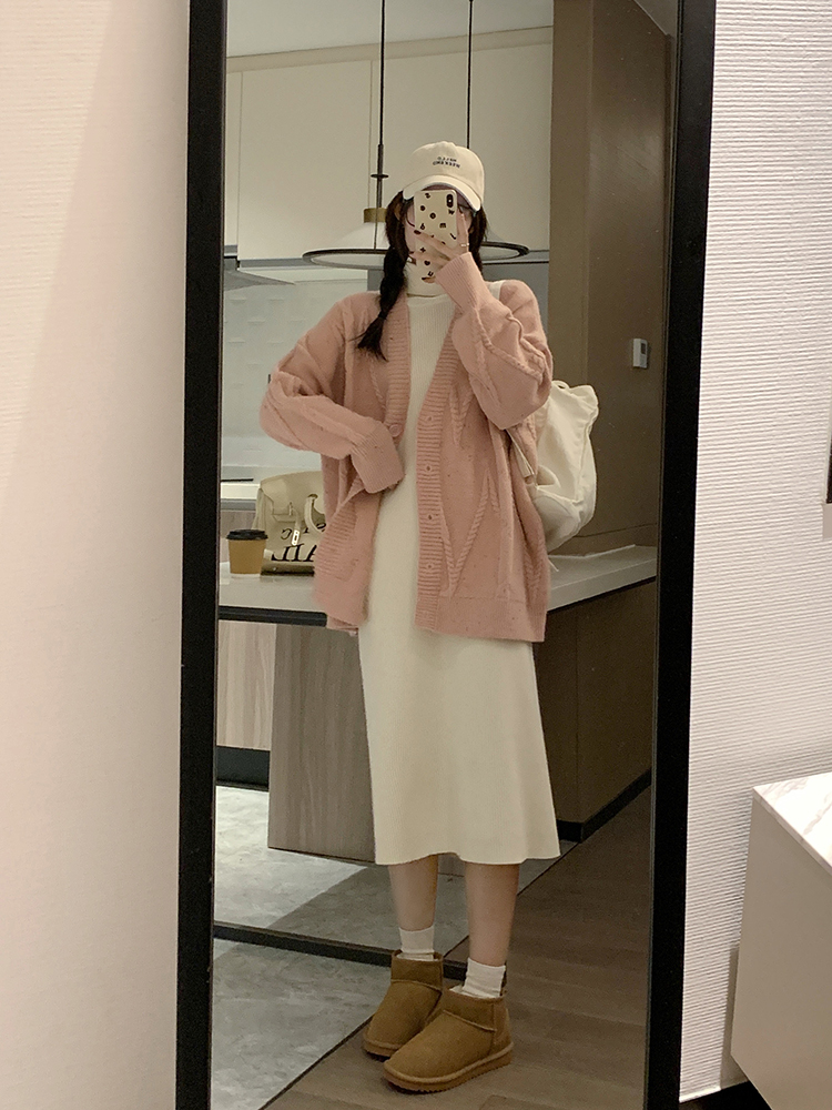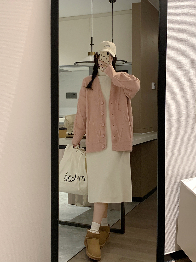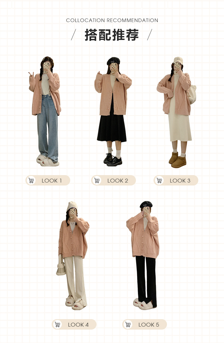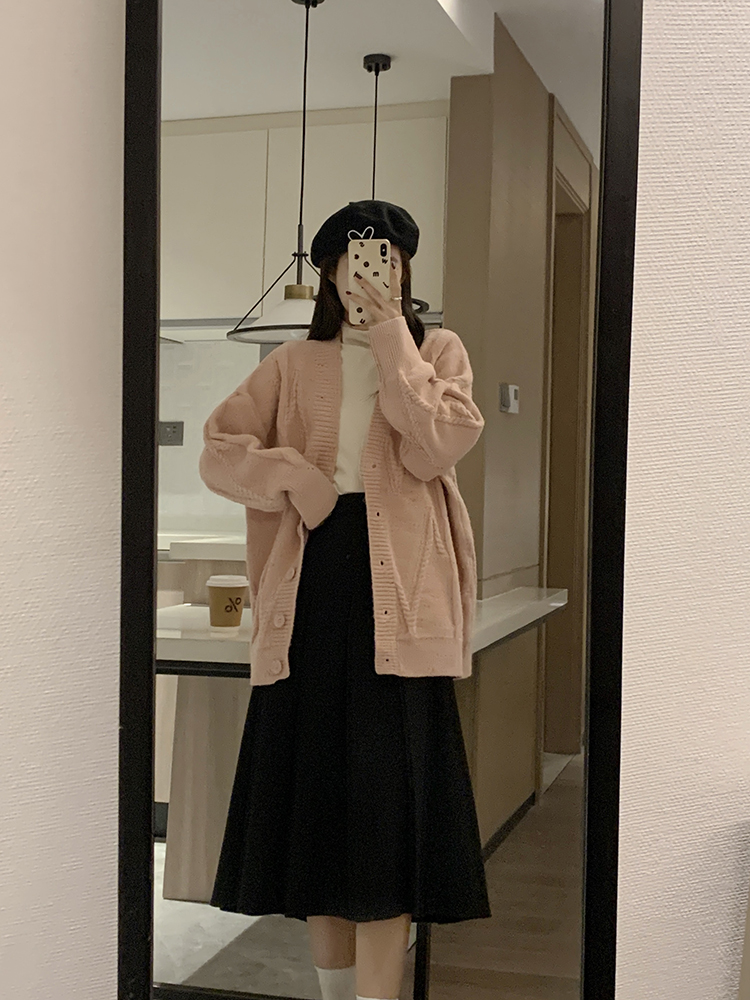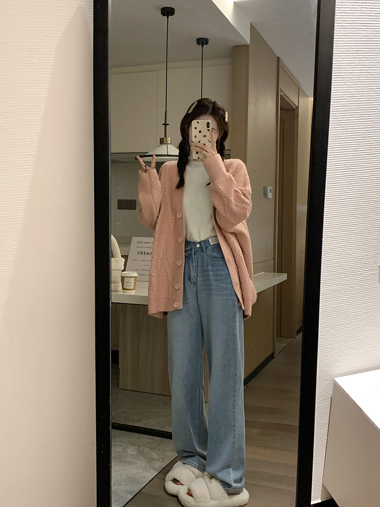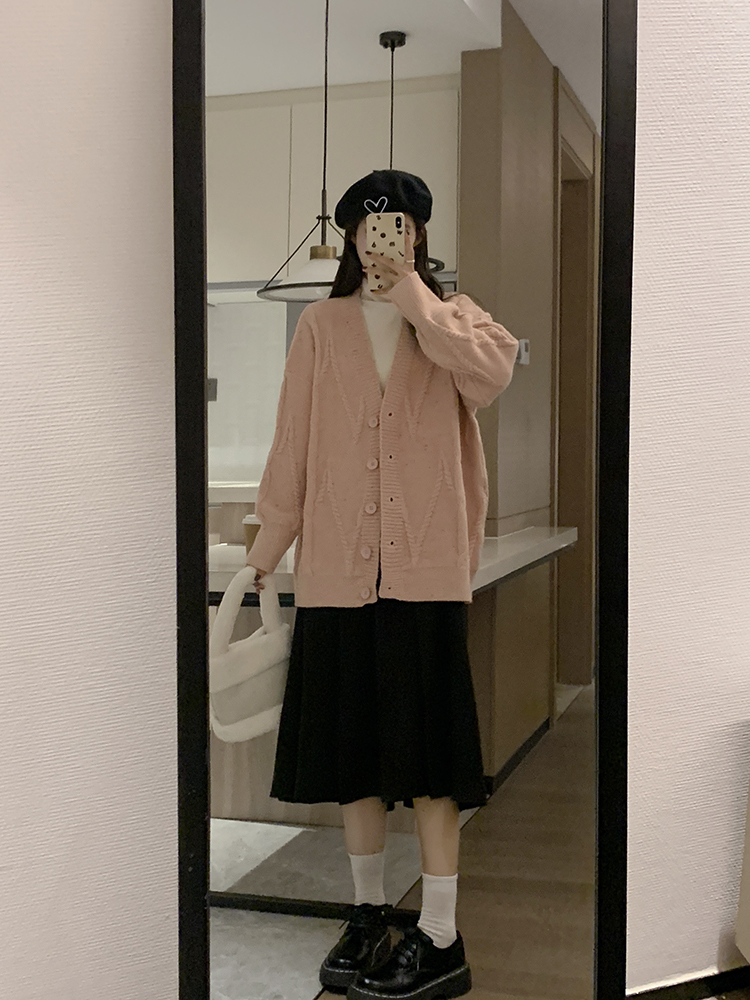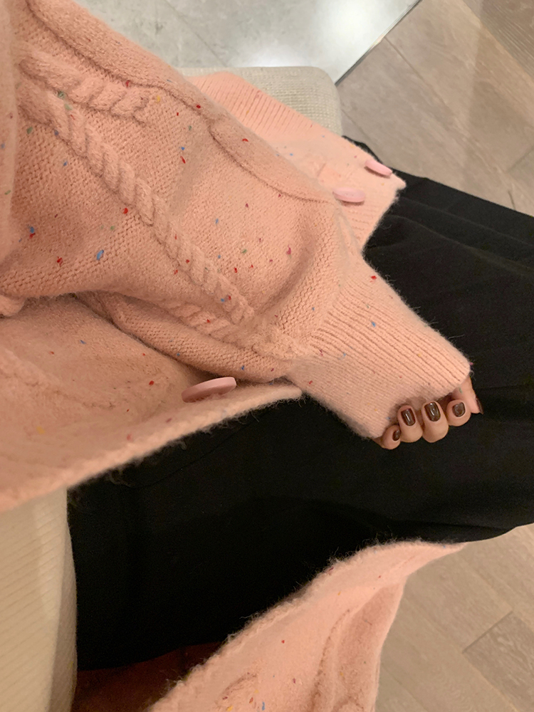 OKJJ粉色毛衣開衫女2023年秋季新款寬鬆慵懶風外套韓版V領針織衫