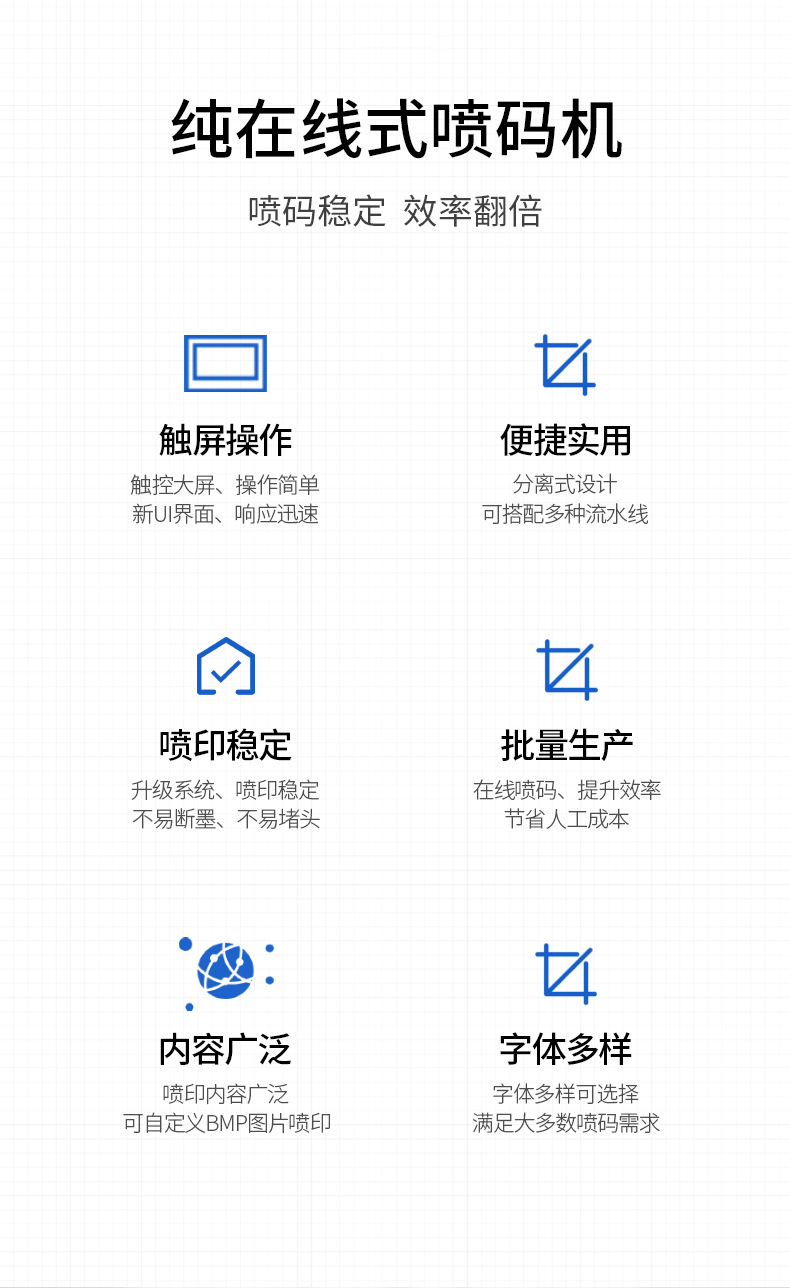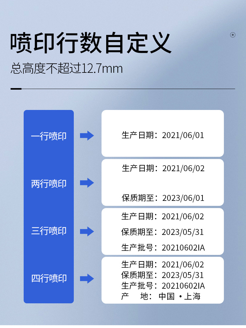 规格 12.7MM单头在线喷码机(一个进口半寸墨盒+小支架+光电支架),12.7MM双头在线喷码机(两个进口半寸墨盒+小支架+光电支架+同步器),12.7MM三头在线喷码机(三个进口半寸墨盒+小支架+光电支架+同步器),12.7MM四头在线喷码机(四个进口半寸墨盒+小支架+光电支架+同步器),12.7MM五头在线喷码机(五个进口半寸墨盒+小支架+光电支架+同步器),12.7MM六头在线喷码机(六个进口半寸墨盒+小支架+光电支架+同步器),25.4MM单头在线喷码机(一个进口一寸墨盒+小支架+光电支架),25.4MM双头在线喷码机(两个进口一寸墨盒+小支架+光电支架+同步器),25.4MM三头在线喷码机(三个进口一寸墨盒+小支架+光电支架+同步器),25.4MM四头在线喷码机(四个进口一寸墨盒+小支架+光电支架+同步器),25.4MM五头在线喷码机(五个进口一寸墨盒+小支架+光电支架+同步器),25.4MM六头在线喷码机(六个进口一寸墨盒+小支架+光电支架+同步器)
