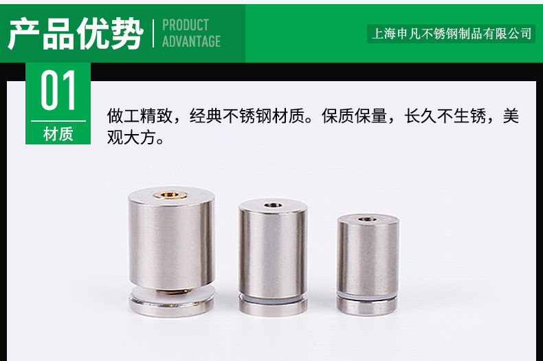 上海申凡不锈钢制品有限公司是 304不锈钢实心广告钉、玻璃镜钉、装饰螺丝钉的专业生产商,拥有齐全的检测设备和雄厚的技术力量。品类齐全,货真价实,外观精美。自公司成立15年来,一直接受OEM/ODM订单。我们的产品广泛地应用于幕墙建筑装修行业、商场道具行业、机电设备行业、医疗器械行业、铁路机械行业、广告字牌行业、卫浴家居行业和其他紧固件行业。