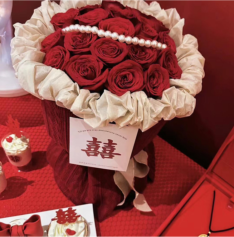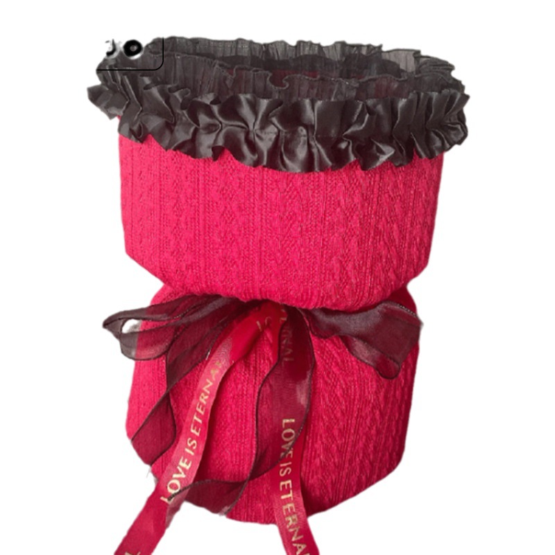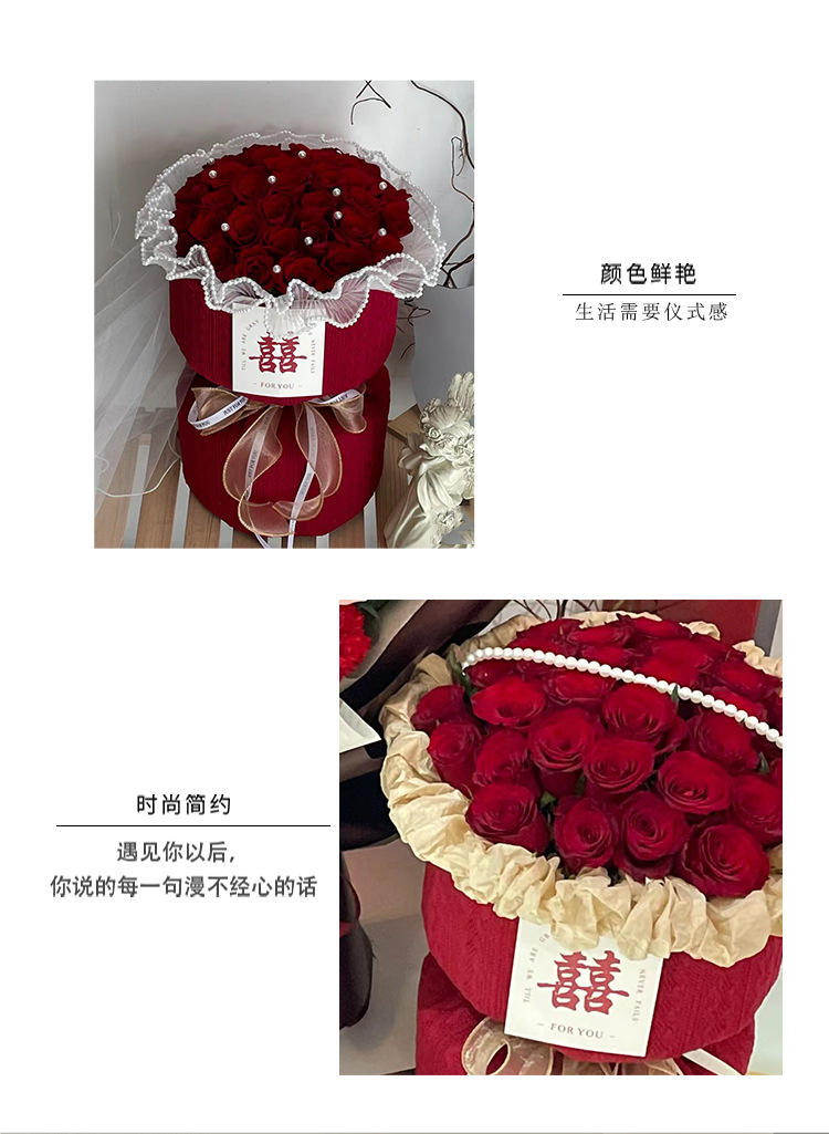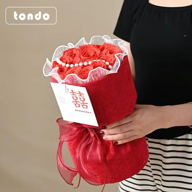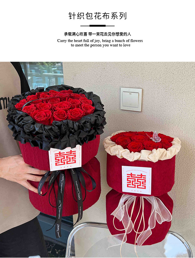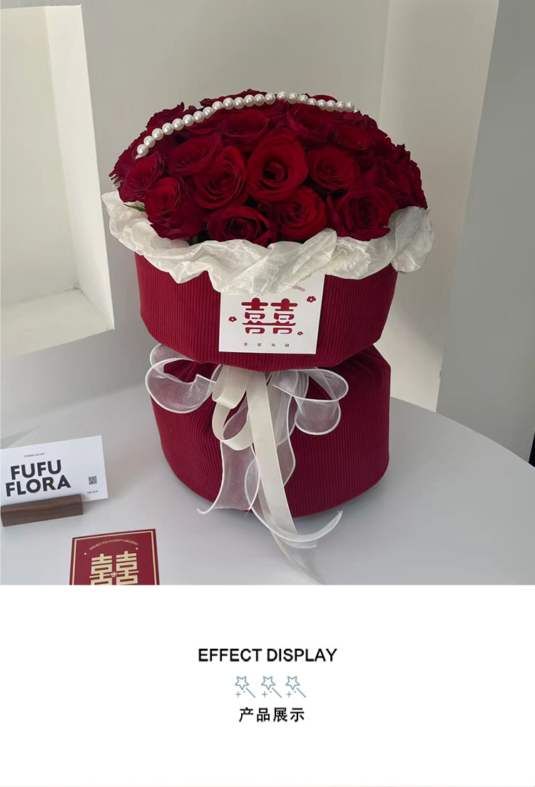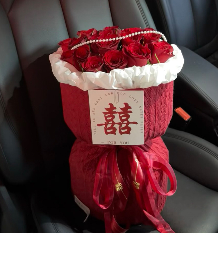订婚结婚红色圆形花束 红色喜庆小香风针织布鲜花包装