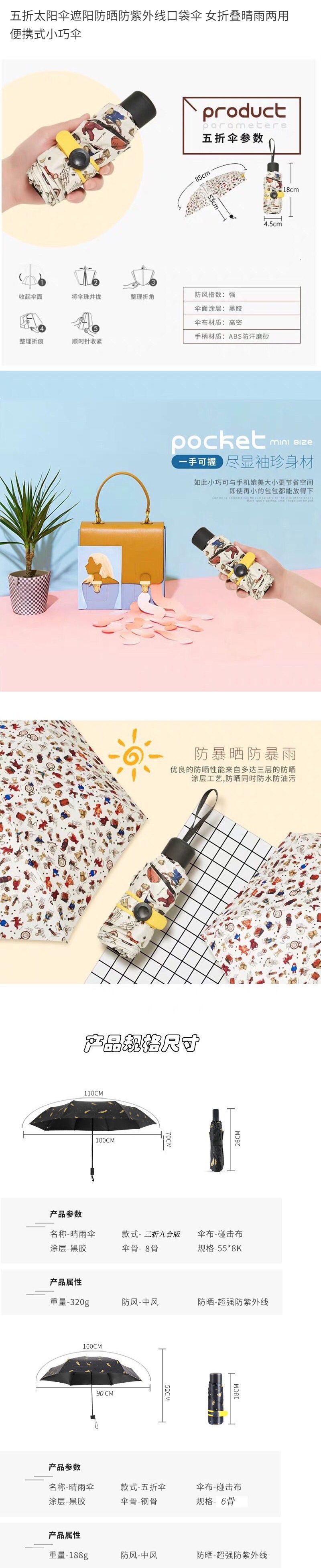颜色 超强防晒五折款【非常小】满葵,超强防晒五折款【非常小】羽毛黑,超强防晒五折款【非常小】维尼熊,超强防晒五折款【非常小】百合花,超强防晒五折款【非常小】红叶,超强防晒五折款【非常小】芭蕉叶,超强防晒五折款【非常小】六瓣花,超强防晒五折款【非常小】糖果树,超强防晒五折款【非常小】小熊粉,超强防晒五折款【非常小】小熊黄,超强防晒五折款【非常小】火烈鸟,超强防晒五折款【非常小】落叶,【五折六骨扁口袋】粉色,五折六骨扁口袋】蓝色,五折六骨扁口袋】黑色,五折六骨扁口袋】墨绿,六折14cm口袋伞-梧桐杏,六折14cm口袋伞-珊瑚粉,六折14cm口袋伞-薄荷绿,六折14cm口袋伞-静谧蓝,六折14cm口袋伞-丁香紫,六折14cm口袋伞-深海蓝,三折【手动款】雨晴伞-羽毛白,三折【手动款】雨晴伞-羽毛黑