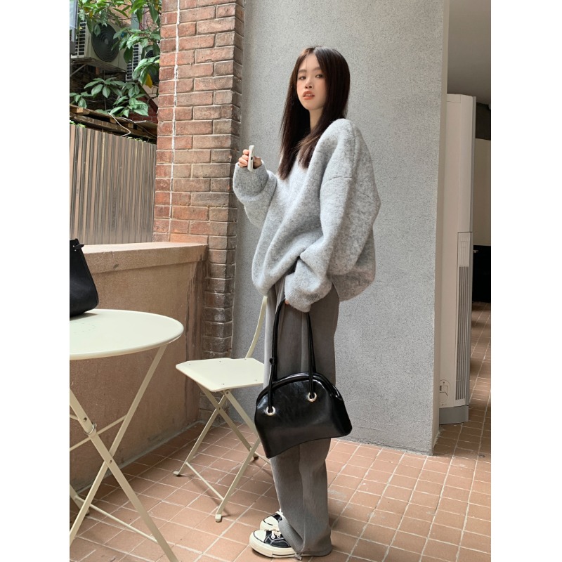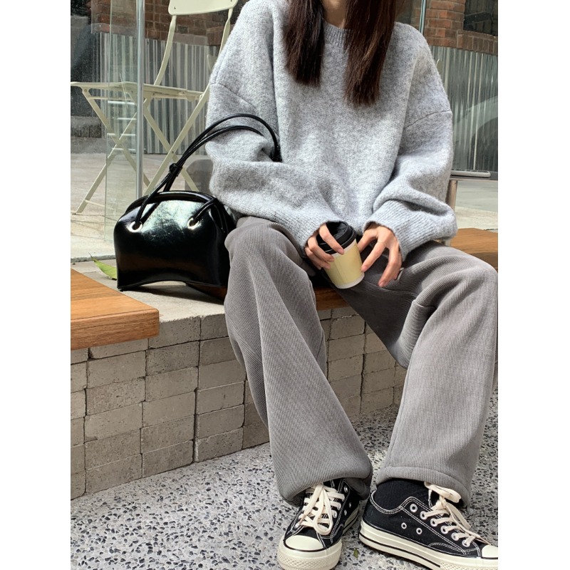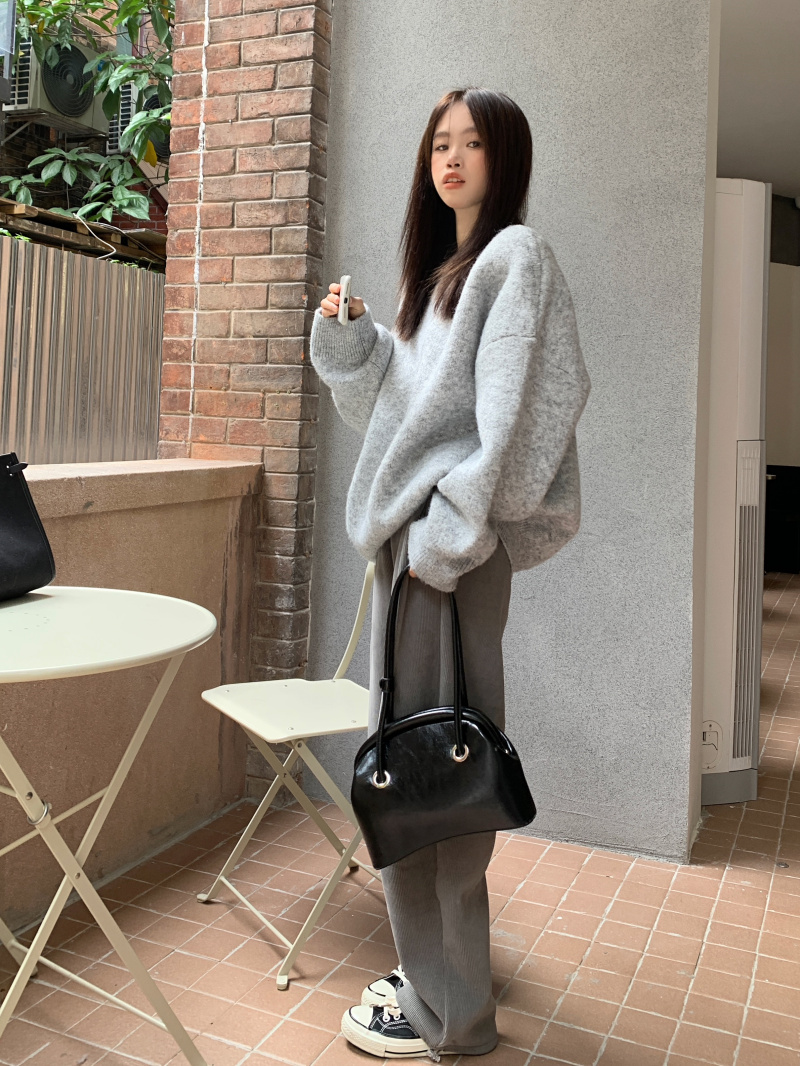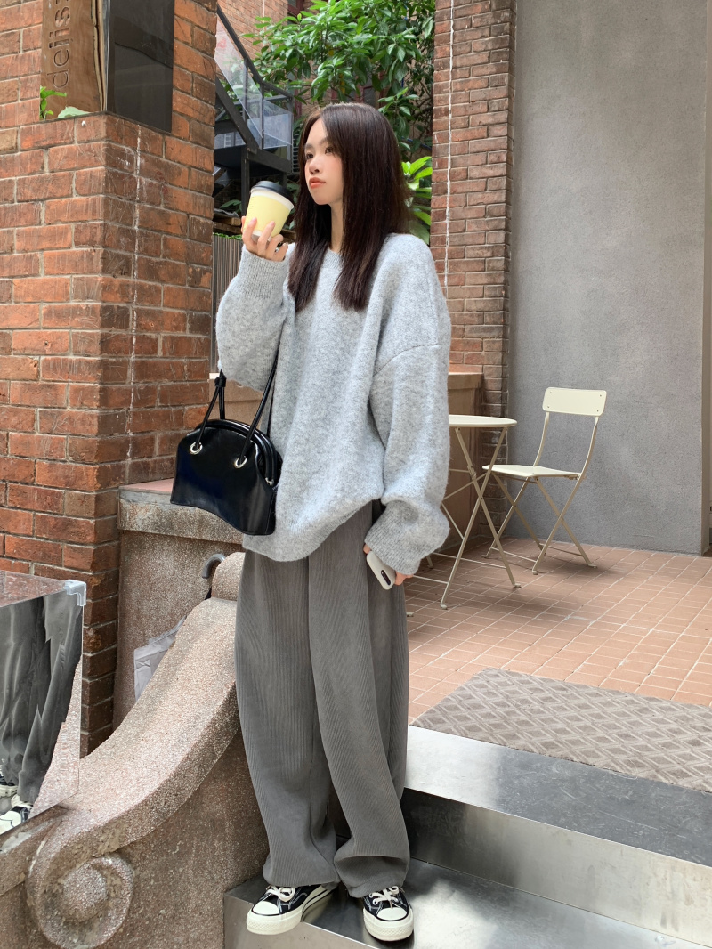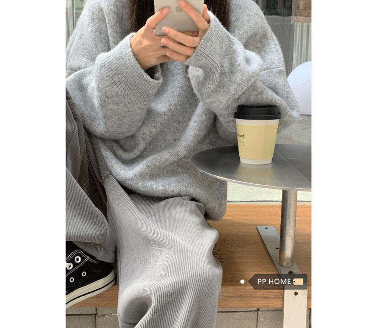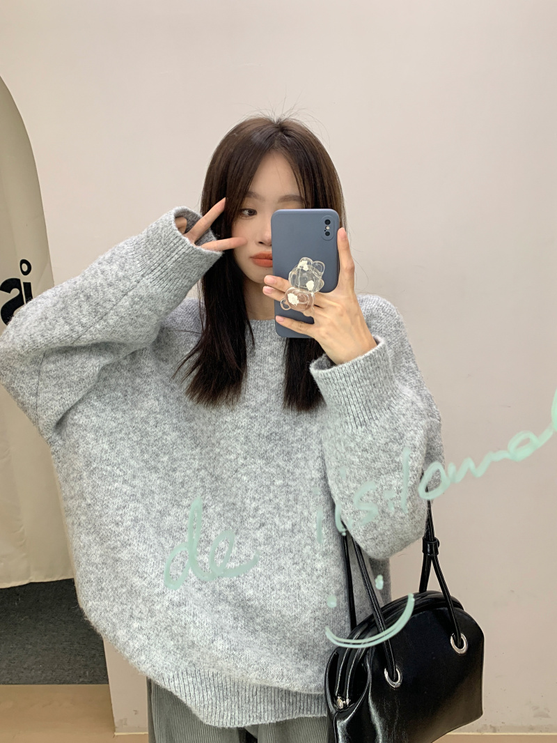 PPHOME灰糯甜茶~灰色毛衣女秋冬寬鬆BF慵懶風加厚套頭針織衫上衣