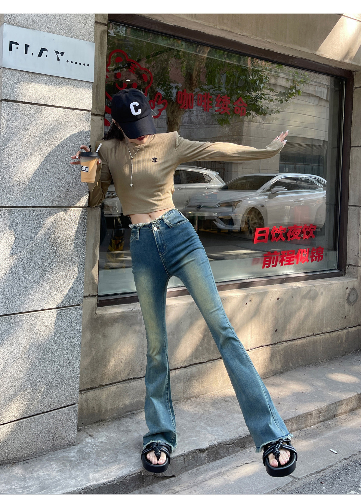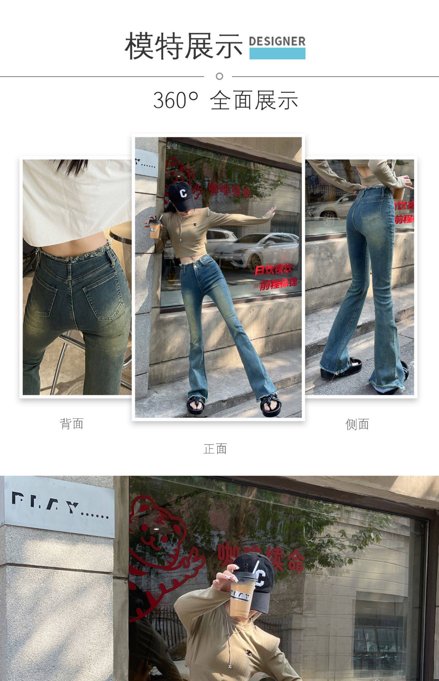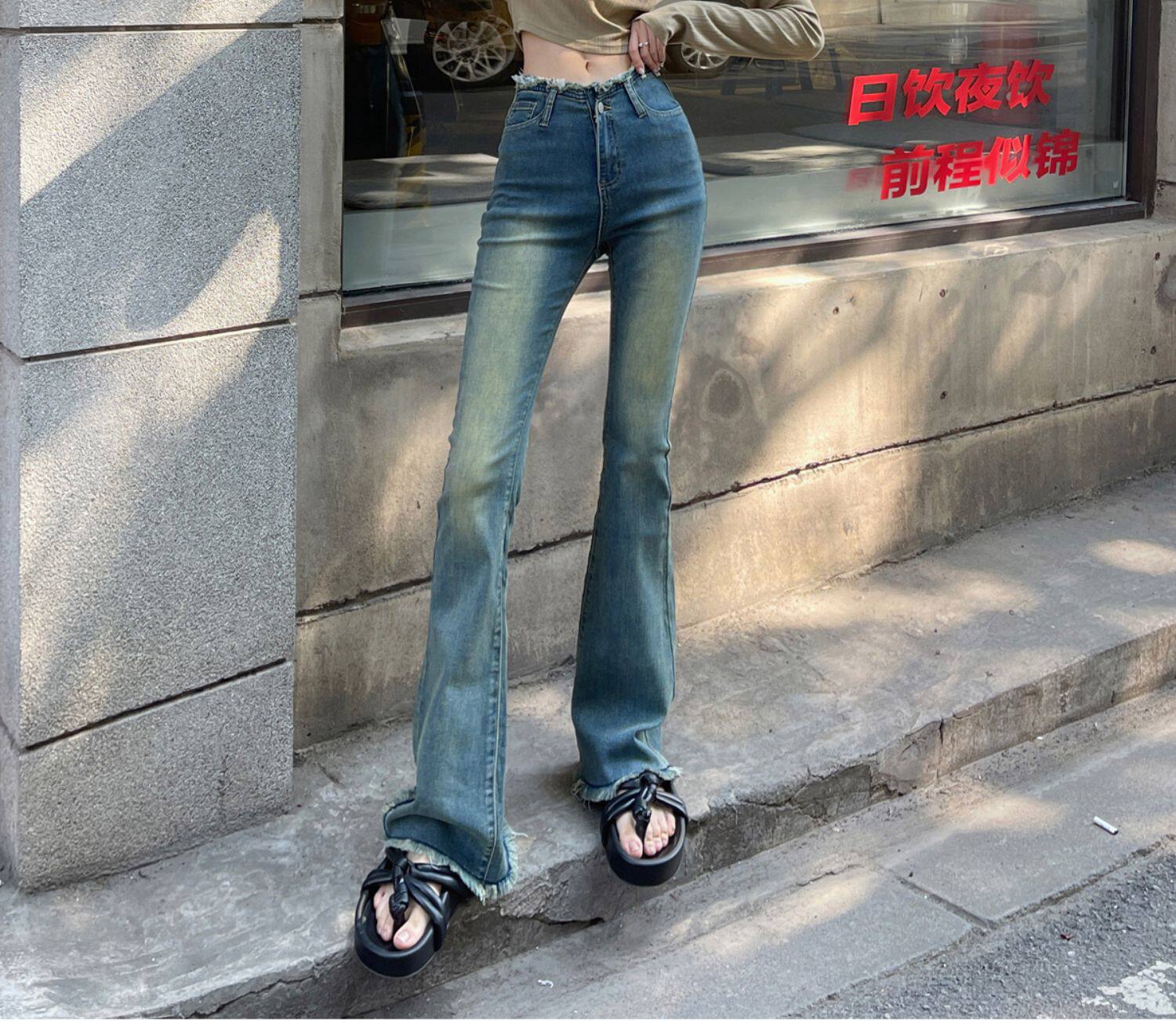 Tristine2022秋季新款高腰修身彈力牛仔褲女上下毛邊復古微喇叭褲