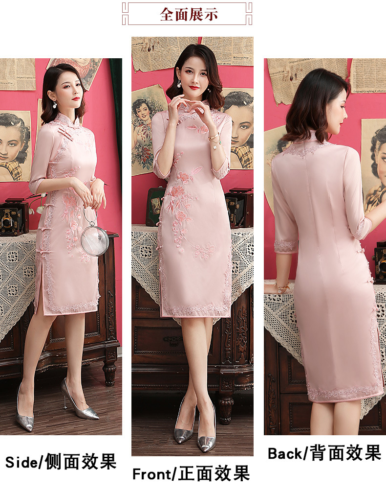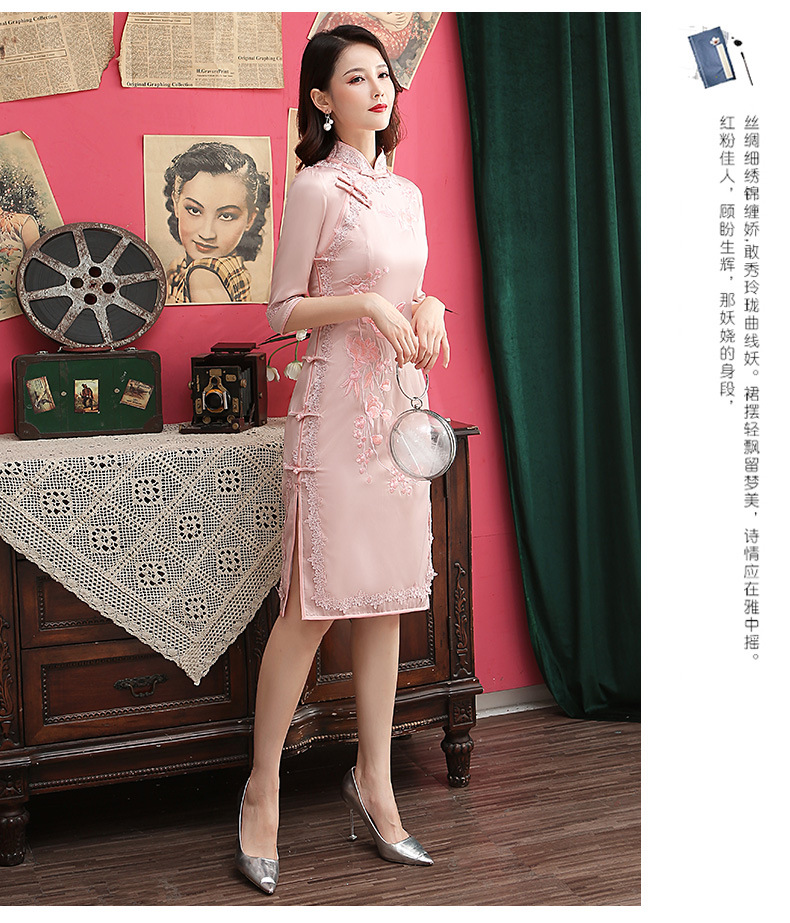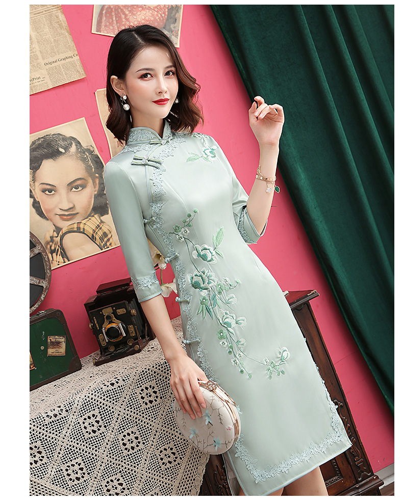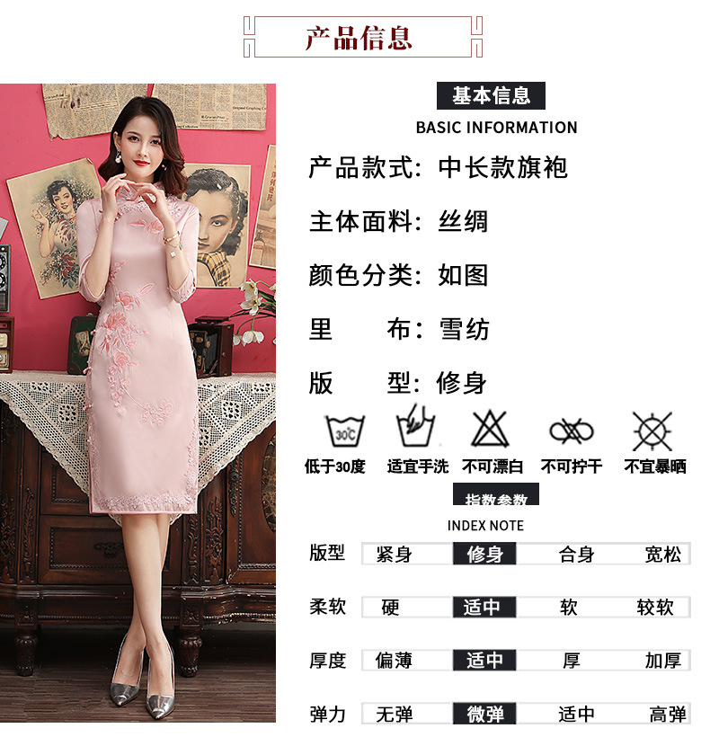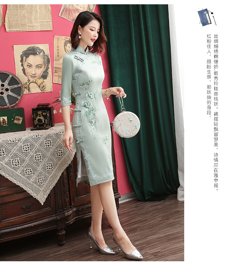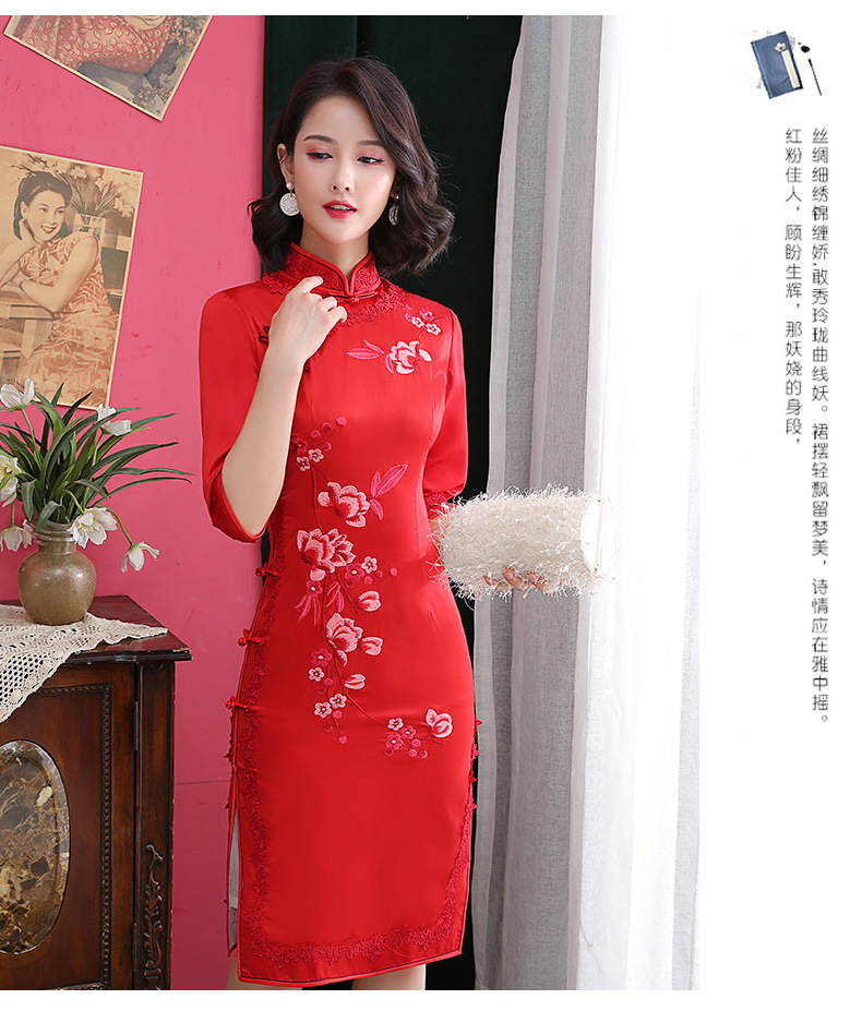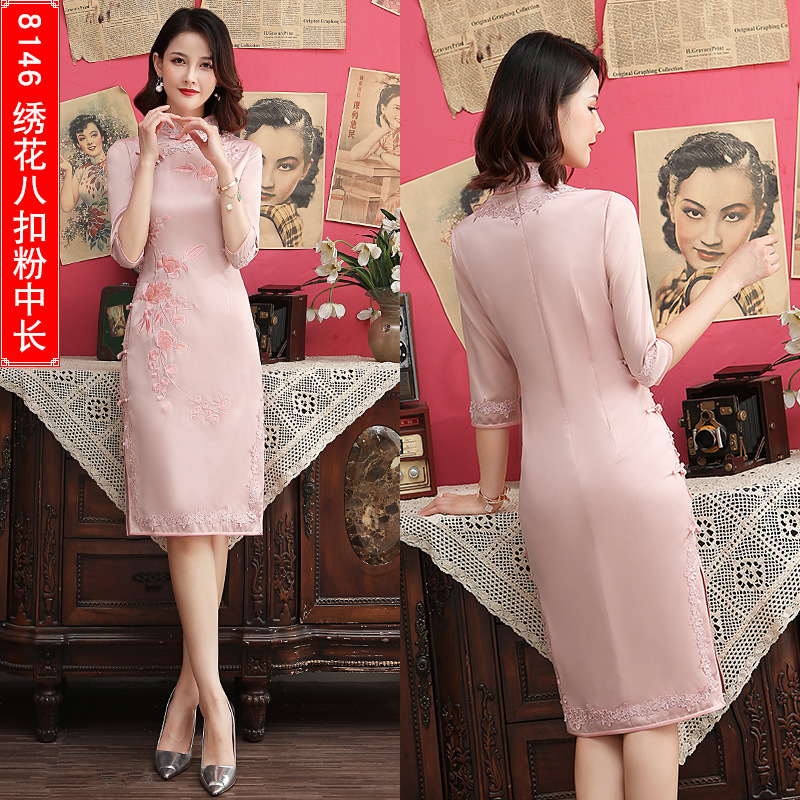 丝绸绣花旗袍新款中长款改良大码老上海中袖修身日常短款旗袍