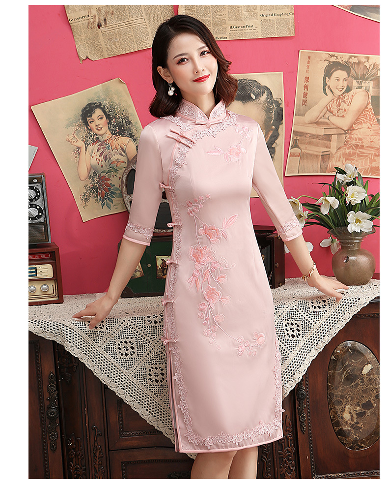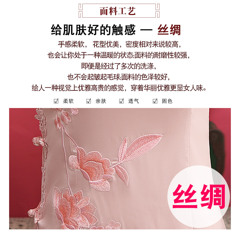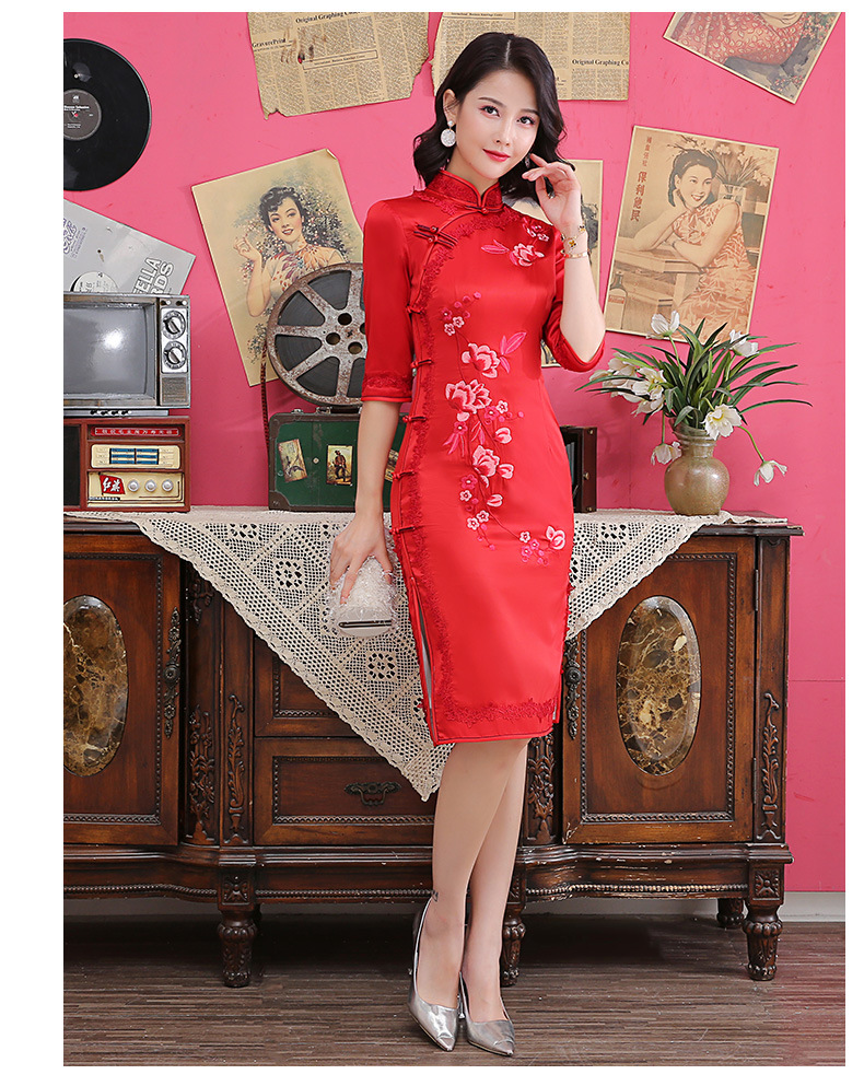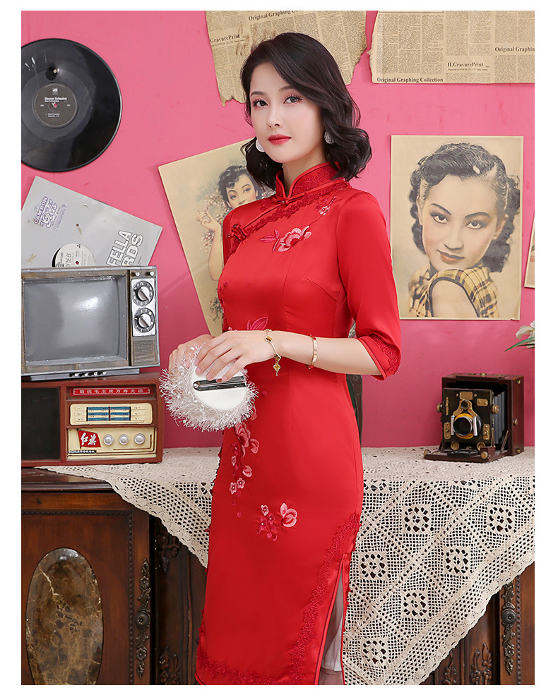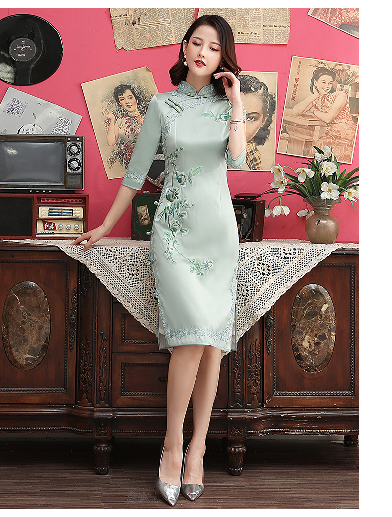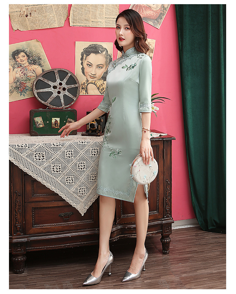 丝绸绣花旗袍新款中长款改良大码老上海中袖修身日常短款旗袍