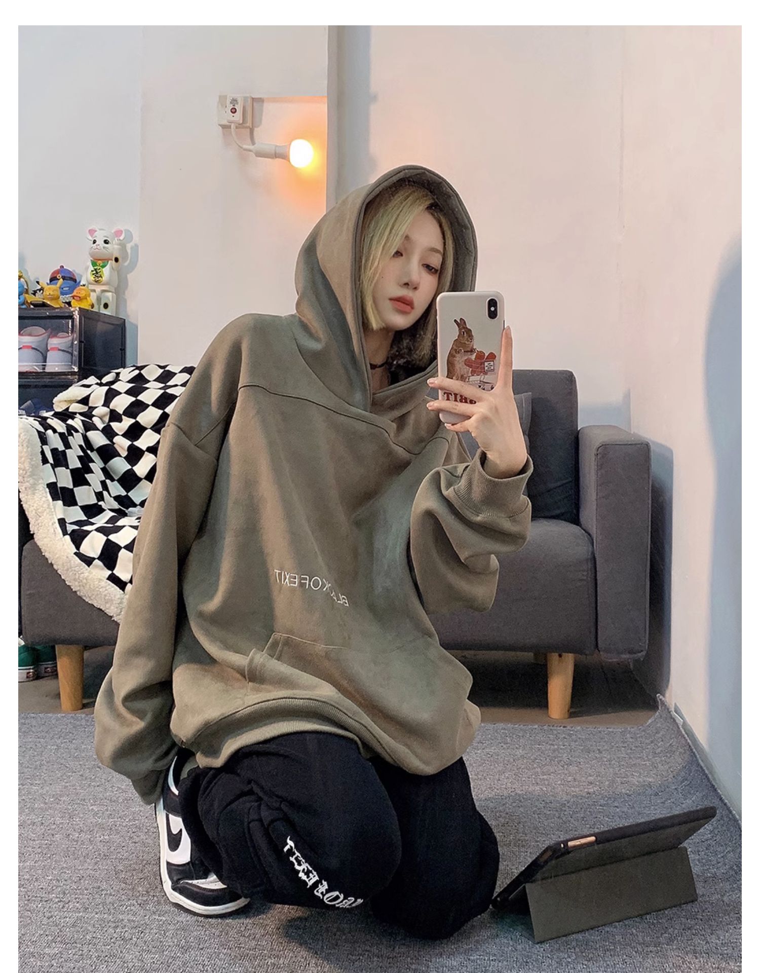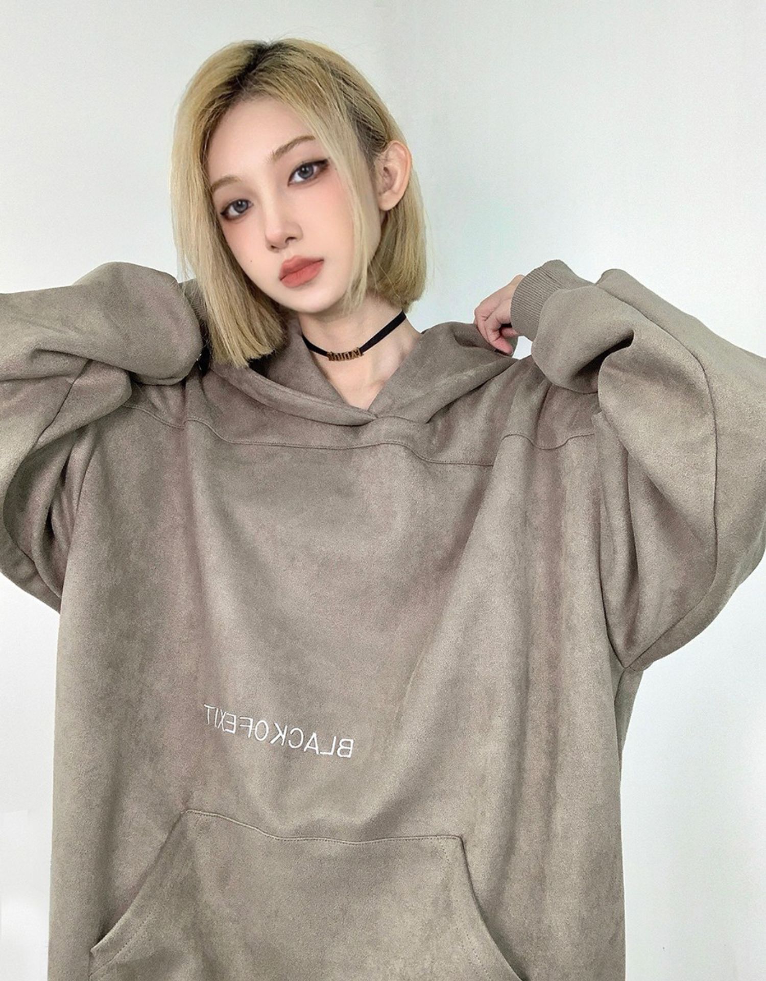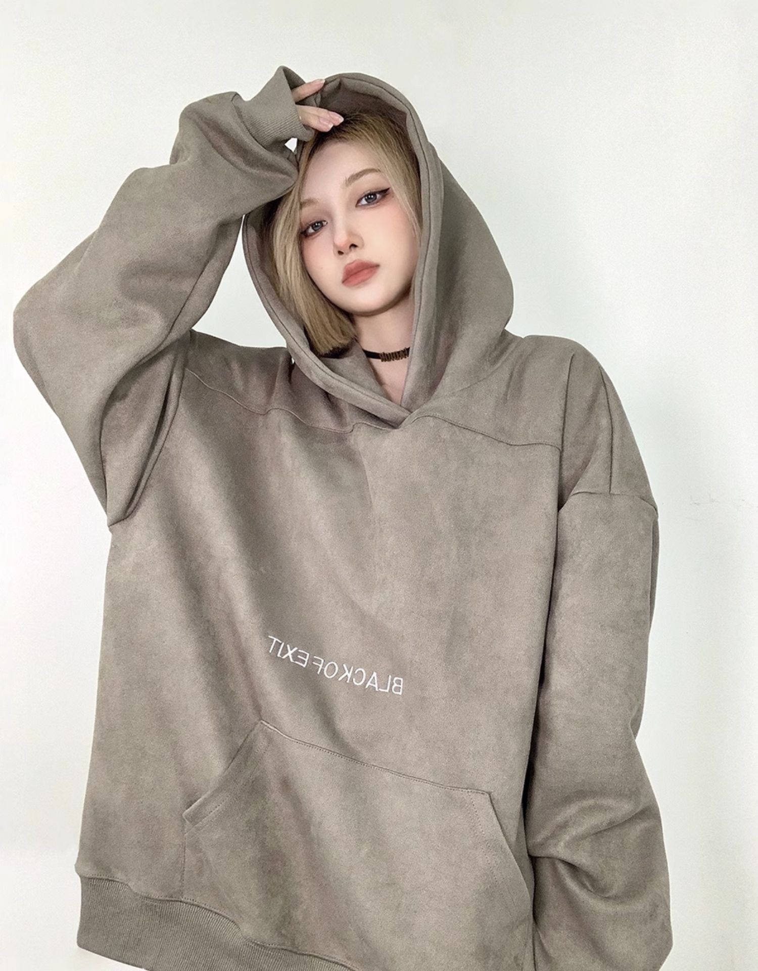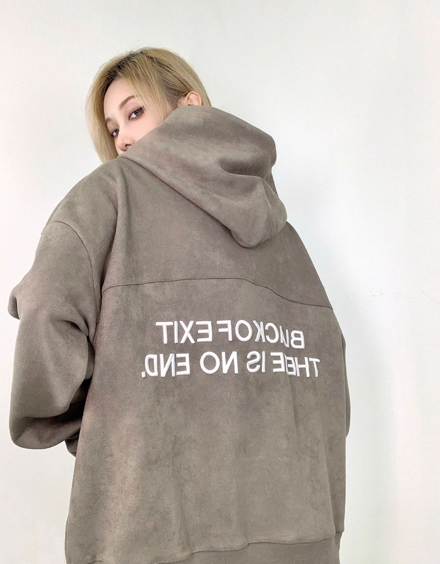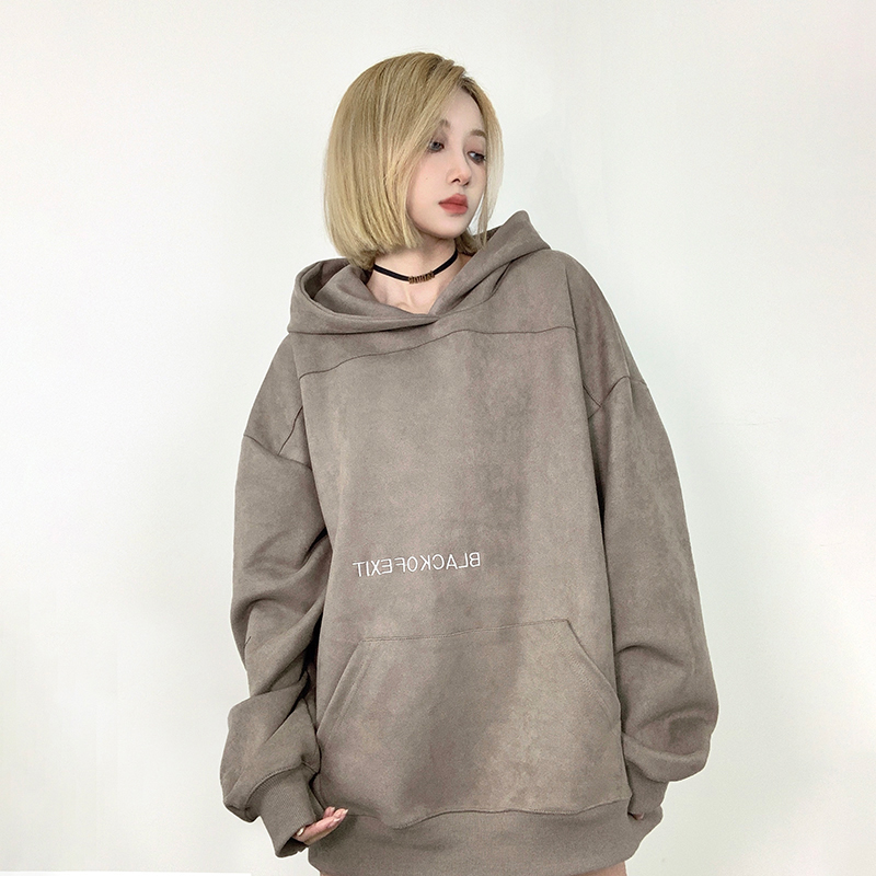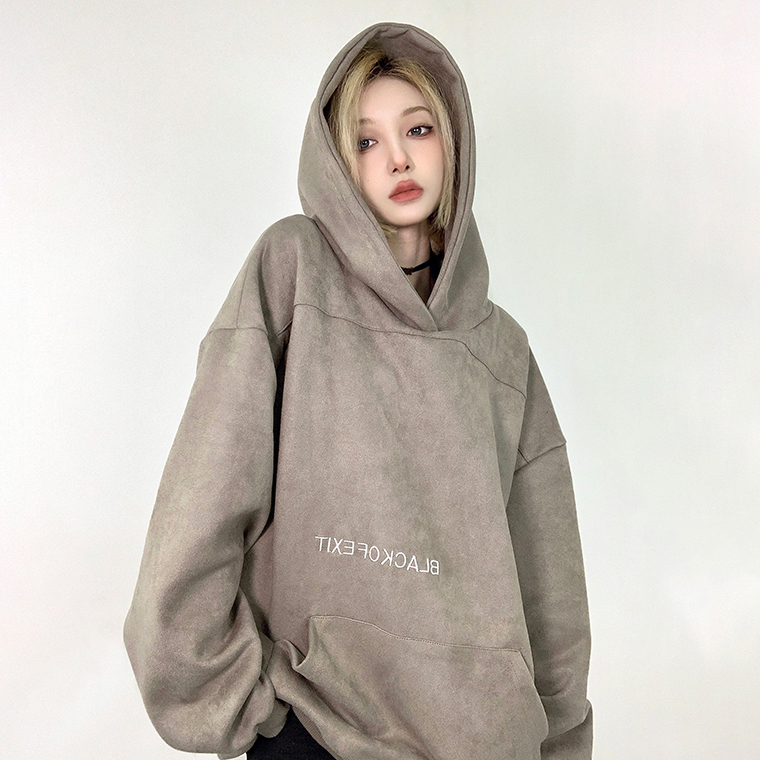 Fcurve原創國潮牌小眾高街麂皮絨刺繡寬鬆連帽衫衛衣加絨美式男女