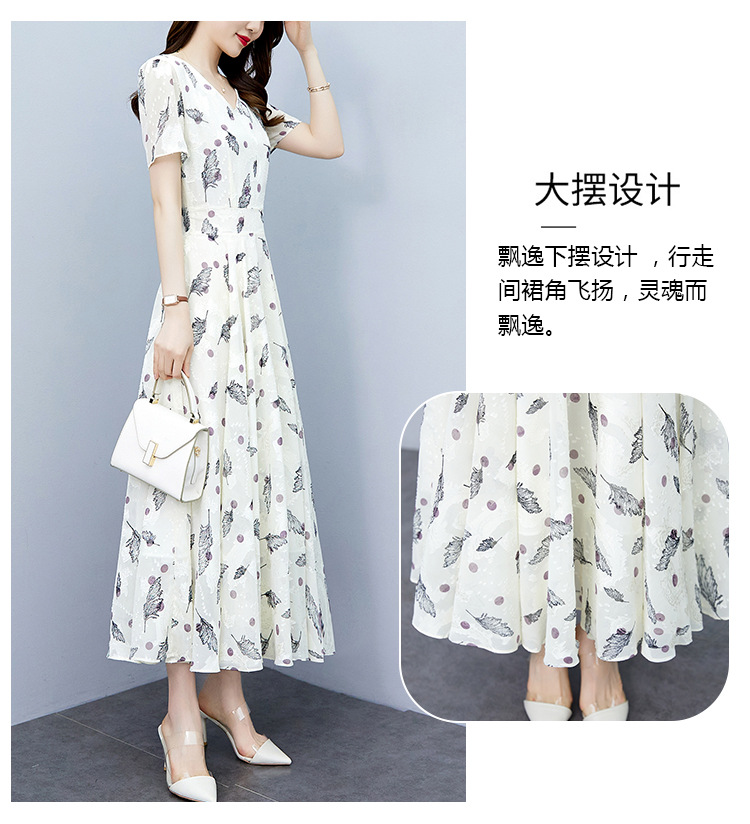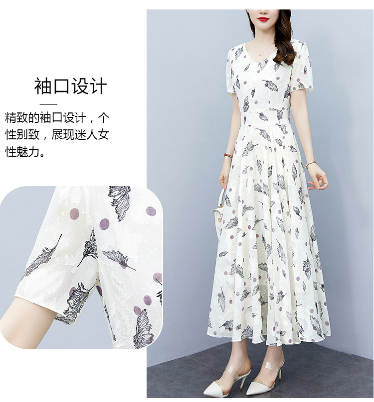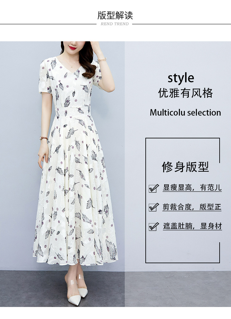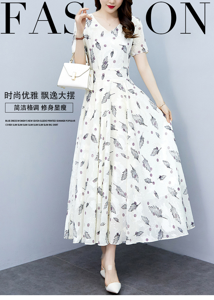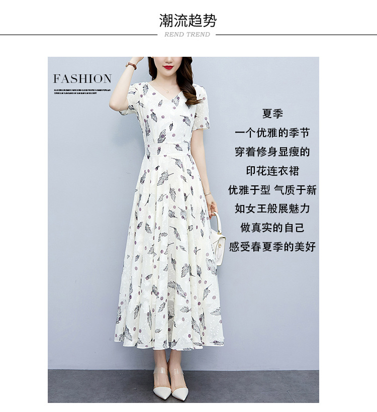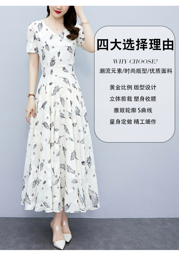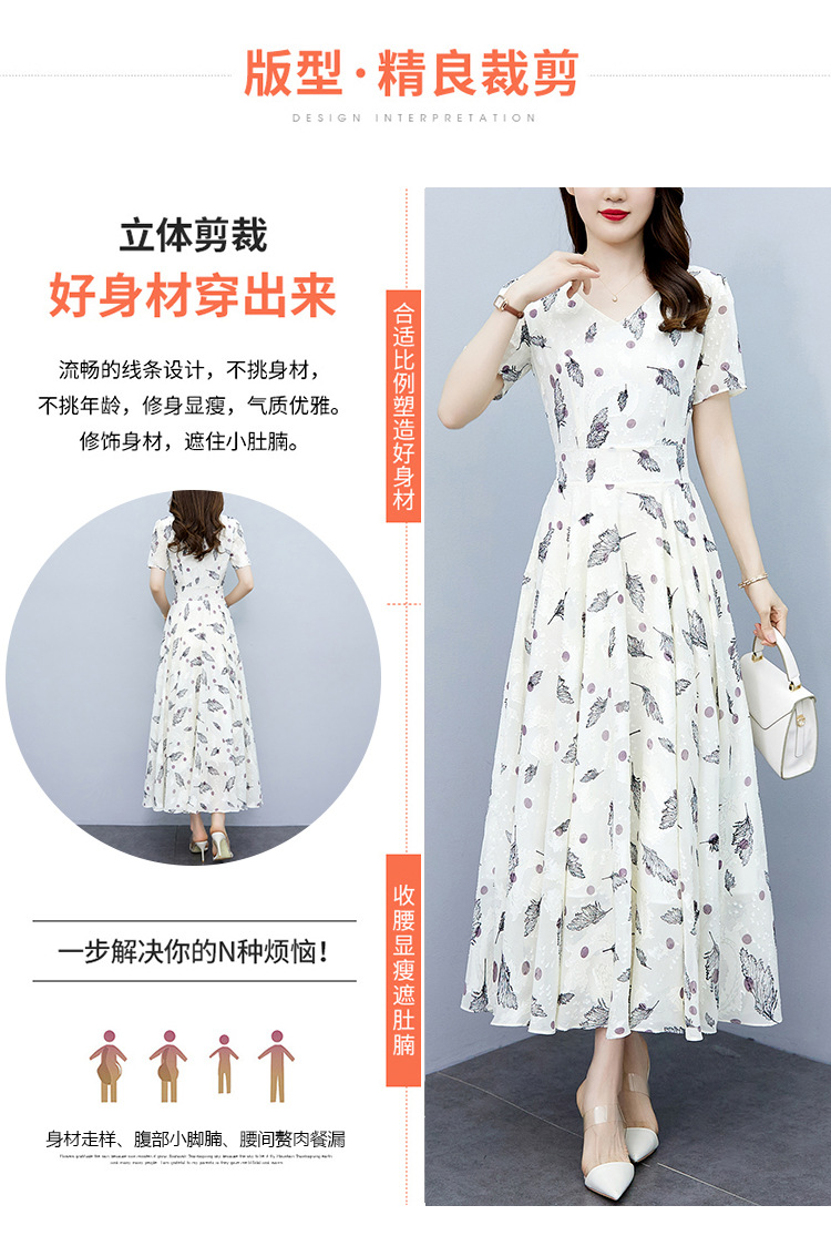 碎花雪纺连衣裙女2023夏季新款V领拼接胖mm收腰显瘦过膝中长裙潮