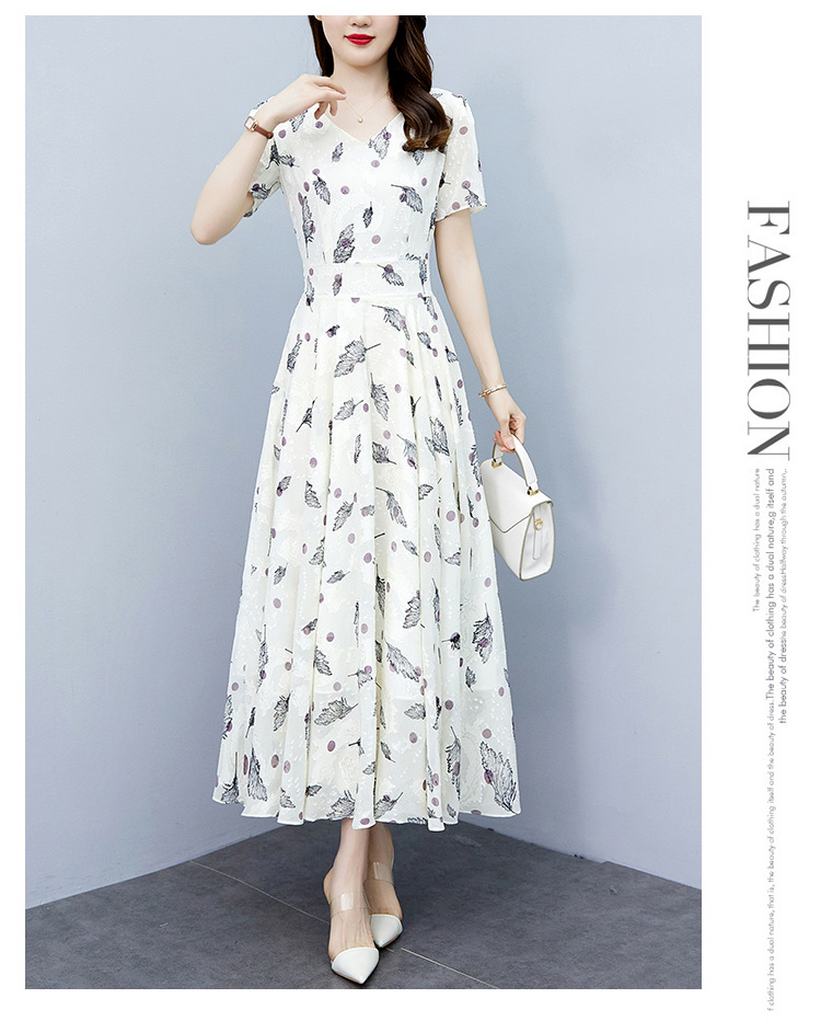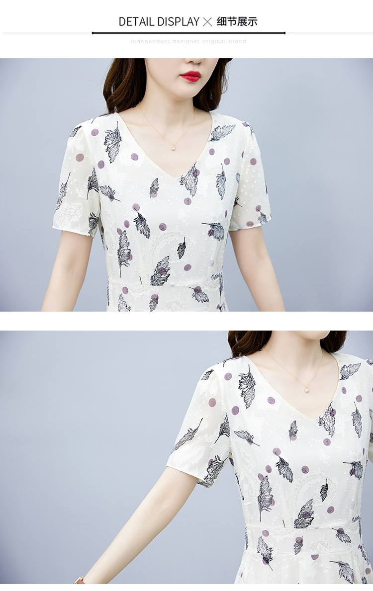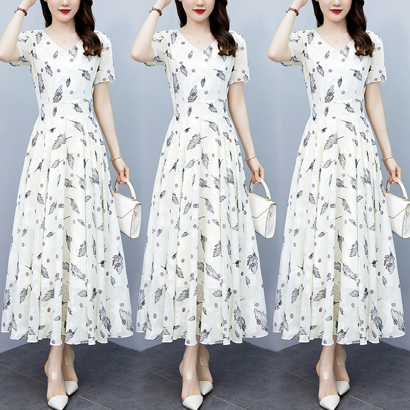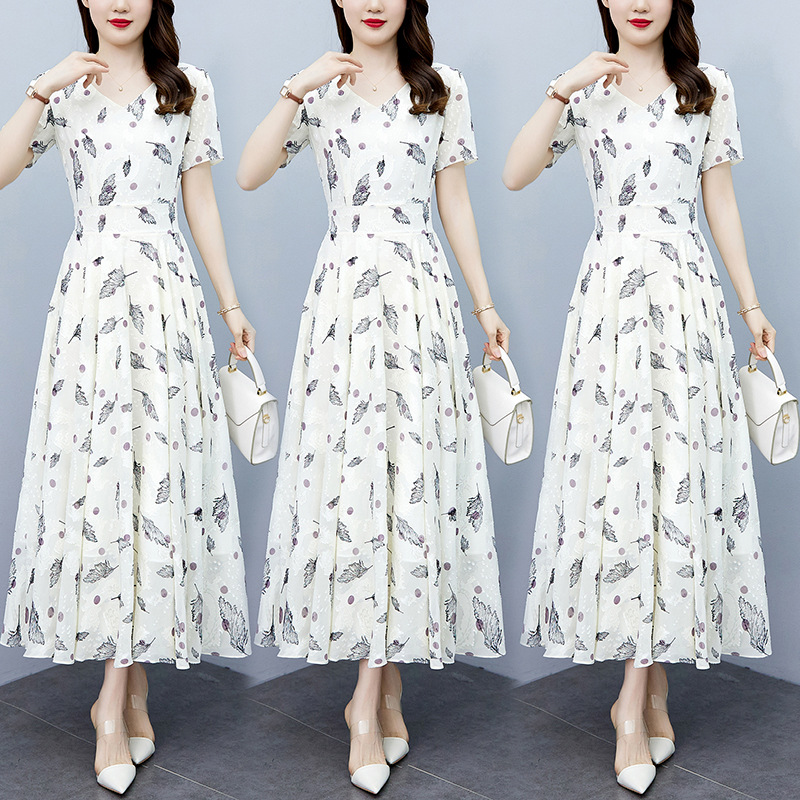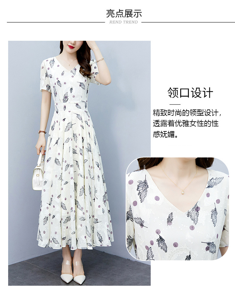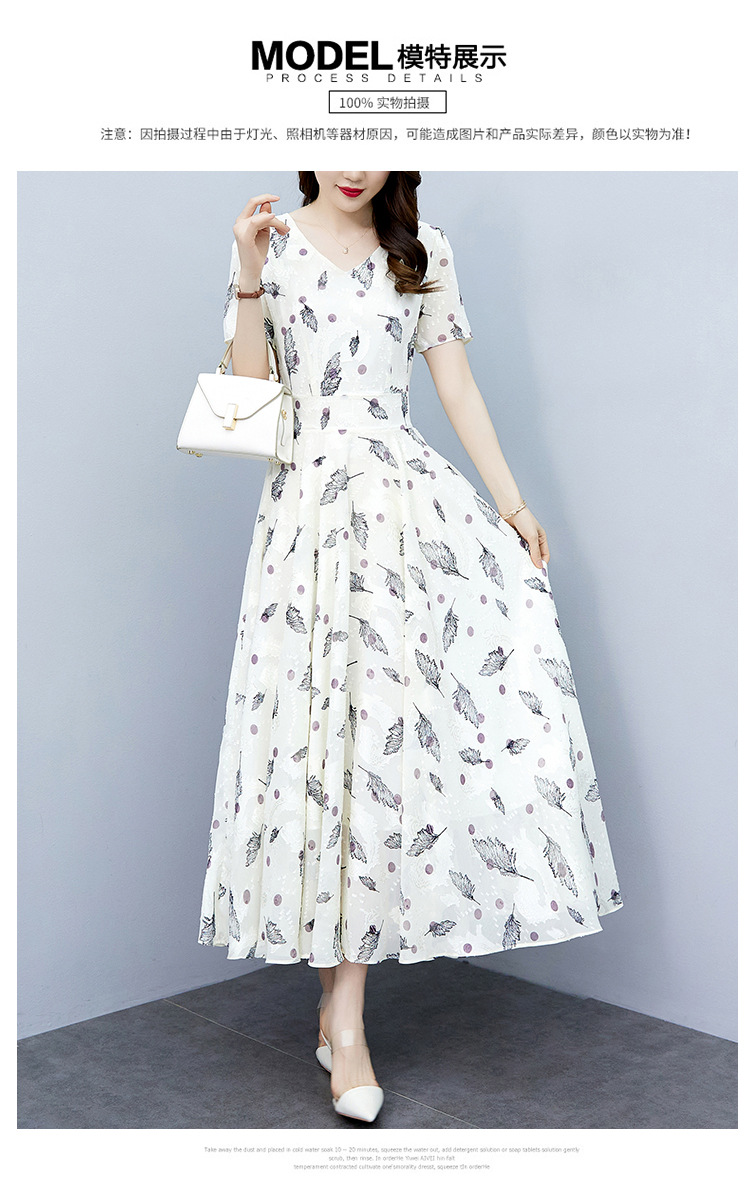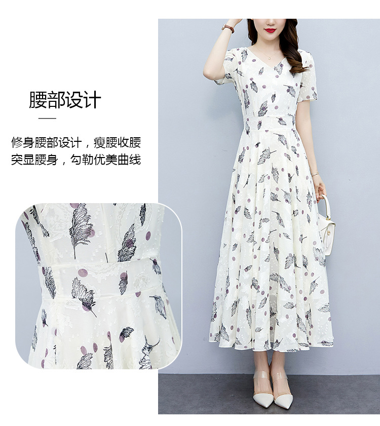 碎花雪纺连衣裙女2023夏季新款V领拼接胖mm收腰显瘦过膝中长裙潮