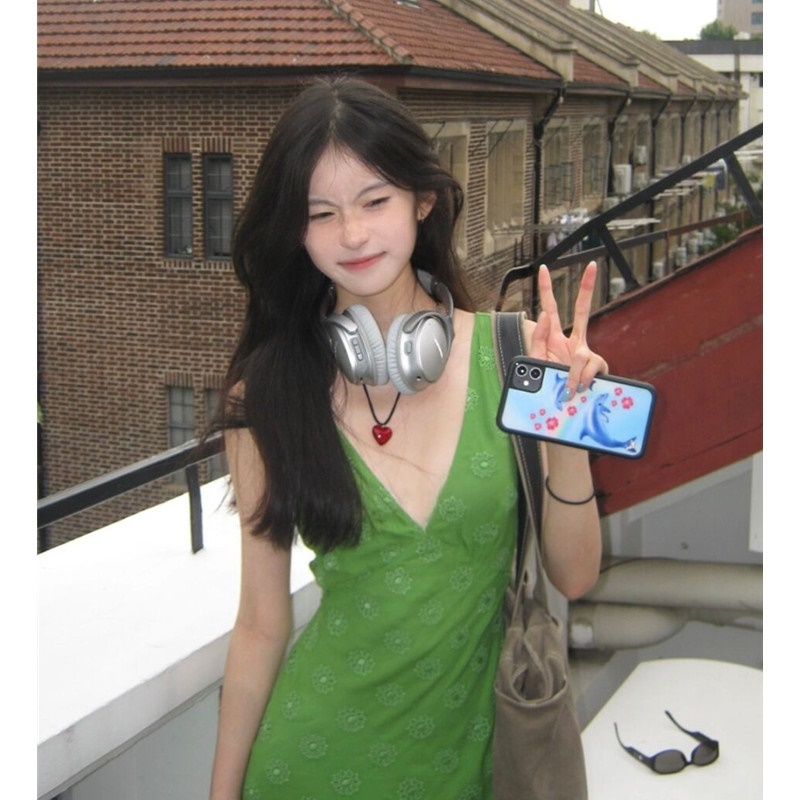 法式復古綠色V領洋裝女夏季小眾設計感收腰顯瘦氣質無袖A字長裙