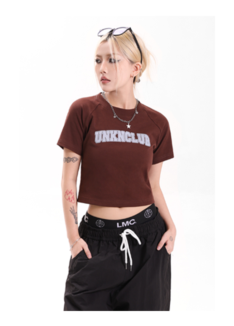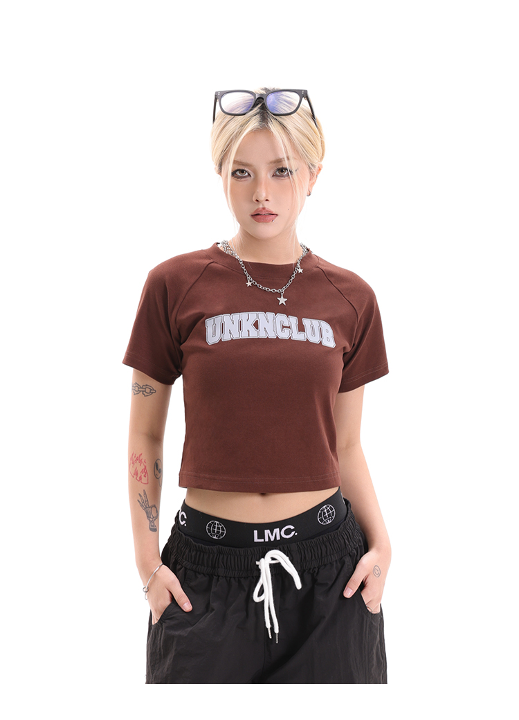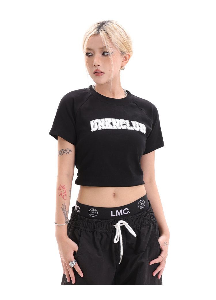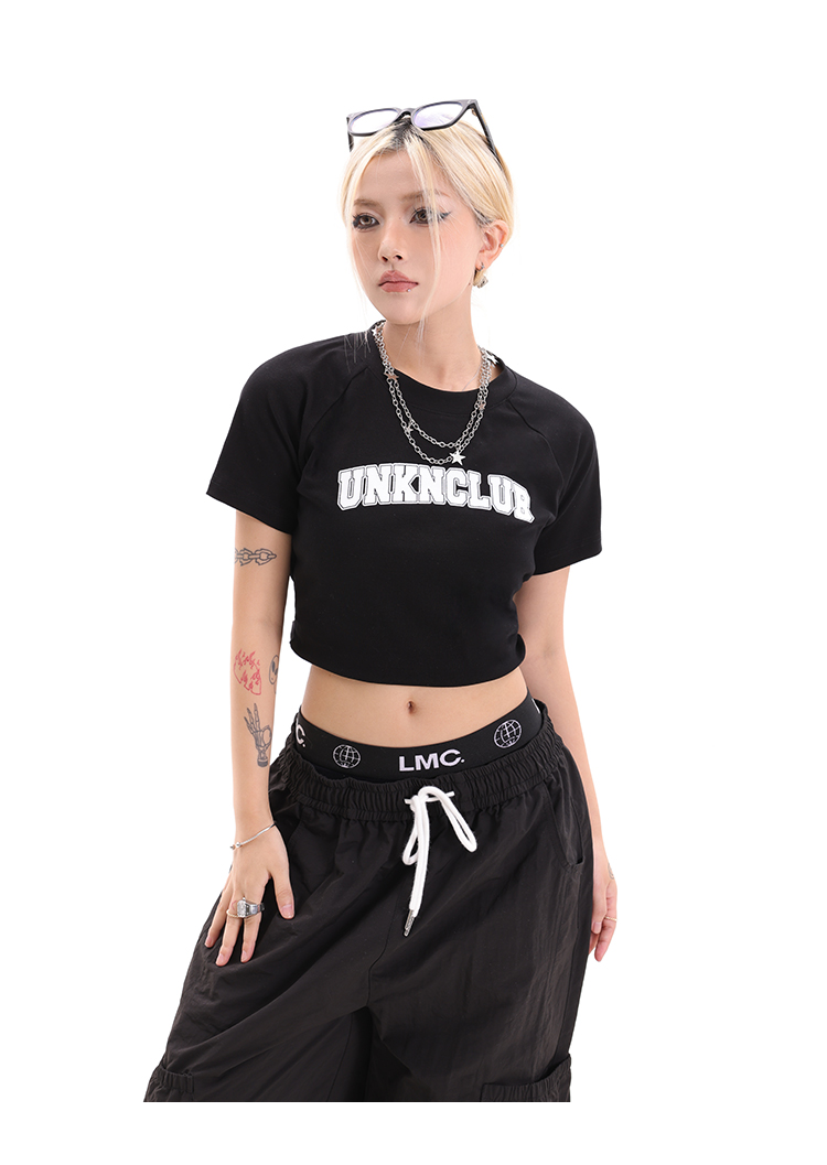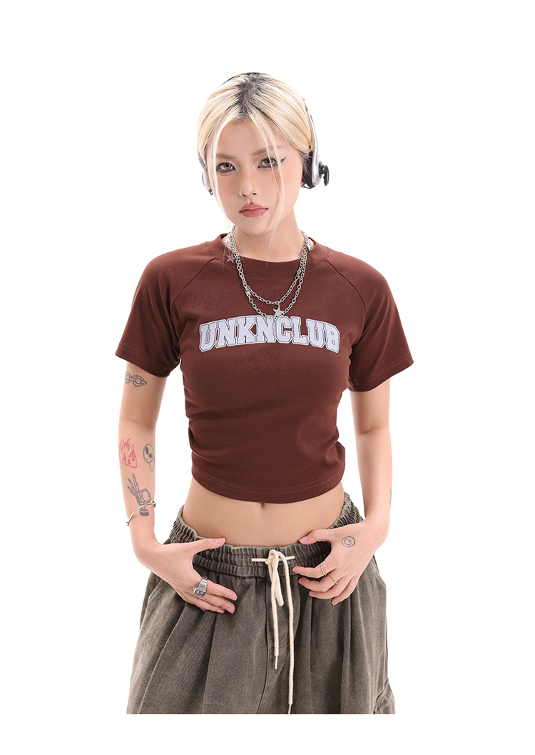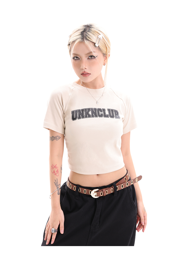 辣妹露臍短款上衣女正肩設計感印花圓領短袖2023夏季緊身高腰T恤