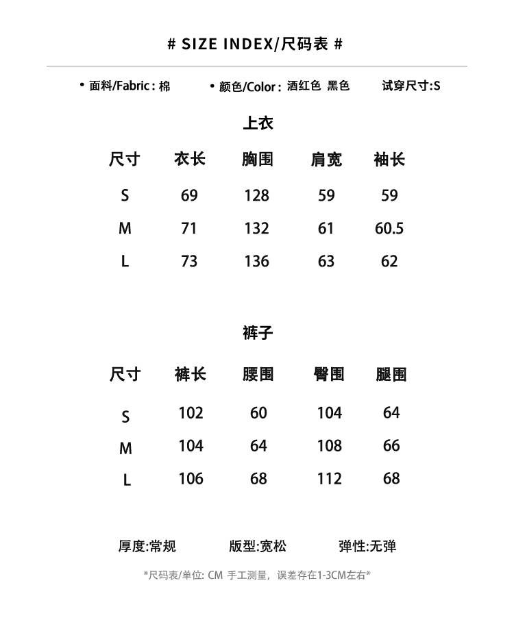 顏色分類 酒紅色上衣,酒紅色長褲,黑色上衣,黑色長褲